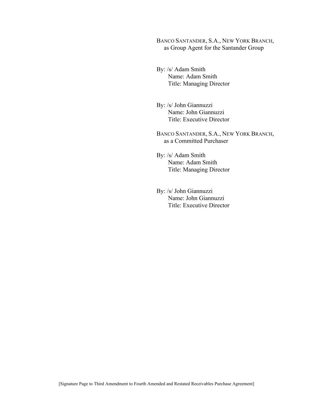 [Signature Page to Third Amendment to Fourth Amended and Restated Receivables Purchase Agreement] BANCO SANTANDER, S.A., NEW YORK BRANCH, as Group Agent for the Santander Group By: /s/ Adam Smith Name: Adam Smith Title: Managing Director By: /s/ John Giannuzzi Name: John Giannuzzi Title: Executive Director BANCO SANTANDER, S.A., NEW YORK BRANCH, as a Committed Purchaser By: /s/ Adam Smith Name: Adam Smith Title: Managing Director By: /s/ John Giannuzzi Name: John Giannuzzi Title: Executive Director