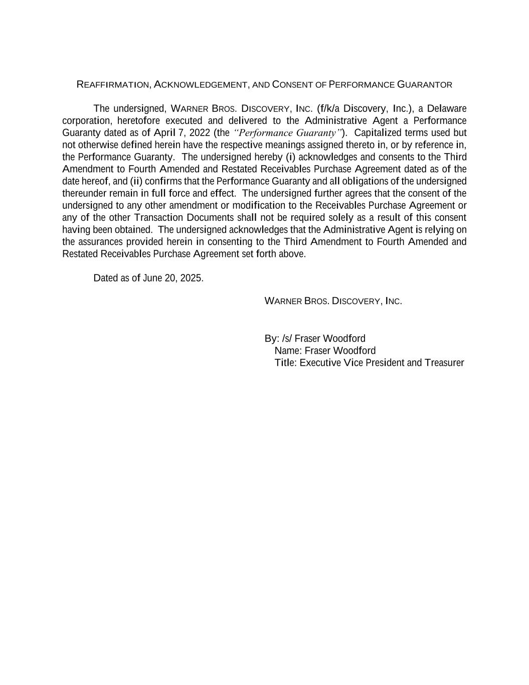 REAFFIRMATION, ACKNOWLEDGEMENT, AND CONSENT OF PERFORMANCE GUARANTOR The undersigned, WARNER BROS. DISCOVERY, INC. (f/k/a Discovery, Inc.), a Delaware corporation, heretofore executed and delivered to the Administrative Agent a Performance Guaranty dated as of April 7, 2022 (the “Performance Guaranty”). Capitalized terms used but not otherwise defined herein have the respective meanings assigned thereto in, or by reference in, the Performance Guaranty. The undersigned hereby (i) acknowledges and consents to the Third Amendment to Fourth Amended and Restated Receivables Purchase Agreement dated as of the date hereof, and (ii) confirms that the Performance Guaranty and all obligations of the undersigned thereunder remain in full force and effect. The undersigned further agrees that the consent of the undersigned to any other amendment or modification to the Receivables Purchase Agreement or any of the other Transaction Documents shall not be required solely as a result of this consent having been obtained. The undersigned acknowledges that the Administrative Agent is relying on the assurances provided herein in consenting to the Third Amendment to Fourth Amended and Restated Receivables Purchase Agreement set forth above. Dated as of June 20, 2025. WARNER BROS. DISCOVERY, INC. By: /s/ Fraser Woodford Name: Fraser Woodford Title: Executive Vice President and Treasurer