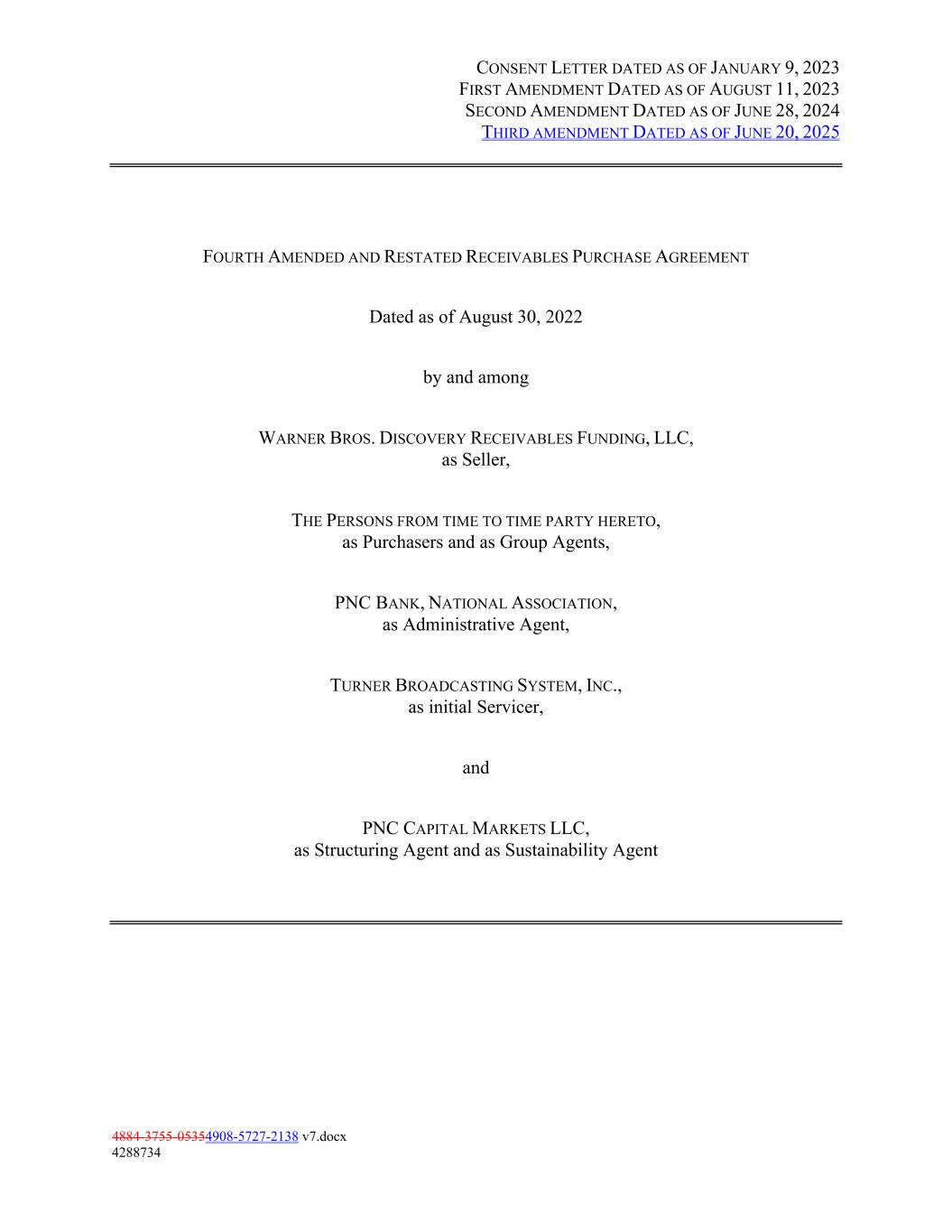 CONSENT LETTER DATED AS OF JANUARY 9, 2023 FIRST AMENDMENT DATED AS OF AUGUST 11, 2023 SECOND AMENDMENT DATED AS OF JUNE 28, 2024 THIRD AMENDMENT DATED AS OF JUNE 20, 2025 4884-3755-05354908-5727-2138 v7.docx 4288734 FOURTH AMENDED AND RESTATED RECEIVABLES PURCHASE AGREEMENT Dated as of August 30, 2022 by and among WARNER BROS. DISCOVERY RECEIVABLES FUNDING, LLC, as Seller, THE PERSONS FROM TIME TO TIME PARTY HERETO, as Purchasers and as Group Agents, PNC BANK, NATIONAL ASSOCIATION, as Administrative Agent, TURNER BROADCASTING SYSTEM, INC., as initial Servicer, and PNC CAPITAL MARKETS LLC, as Structuring Agent and as Sustainability Agent