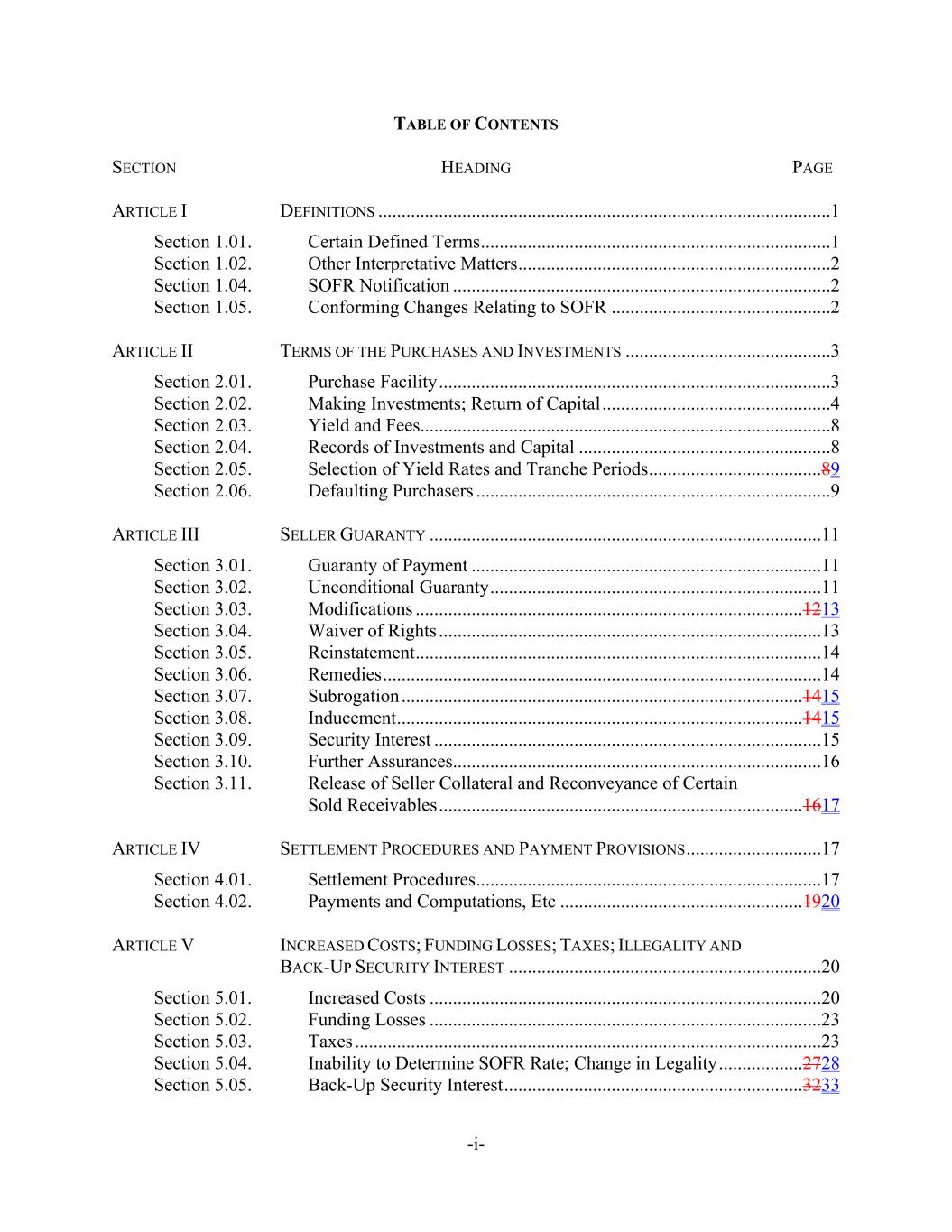 -i- TABLE OF CONTENTS SECTION HEADING PAGE ARTICLE I DEFINITIONS .................................................................................................1 Section 1.01. Certain Defined Terms...........................................................................1 Section 1.02. Other Interpretative Matters...................................................................2 Section 1.04. SOFR Notification .................................................................................2 Section 1.05. Conforming Changes Relating to SOFR ...............................................2 ARTICLE II TERMS OF THE PURCHASES AND INVESTMENTS ............................................3 Section 2.01. Purchase Facility....................................................................................3 Section 2.02. Making Investments; Return of Capital.................................................4 Section 2.03. Yield and Fees........................................................................................8 Section 2.04. Records of Investments and Capital ......................................................8 Section 2.05. Selection of Yield Rates and Tranche Periods.....................................89 Section 2.06. Defaulting Purchasers ............................................................................9 ARTICLE III SELLER GUARANTY ....................................................................................11 Section 3.01. Guaranty of Payment ...........................................................................11 Section 3.02. Unconditional Guaranty.......................................................................11 Section 3.03. Modifications ...................................................................................1213 Section 3.04. Waiver of Rights ..................................................................................13 Section 3.05. Reinstatement.......................................................................................14 Section 3.06. Remedies..............................................................................................14 Section 3.07. Subrogation ......................................................................................1415 Section 3.08. Inducement.......................................................................................1415 Section 3.09. Security Interest ...................................................................................15 Section 3.10. Further Assurances...............................................................................16 Section 3.11. Release of Seller Collateral and Reconveyance of Certain Sold Receivables..............................................................................1617 ARTICLE IV SETTLEMENT PROCEDURES AND PAYMENT PROVISIONS.............................17 Section 4.01. Settlement Procedures..........................................................................17 Section 4.02. Payments and Computations, Etc ....................................................1920 ARTICLE V INCREASED COSTS; FUNDING LOSSES; TAXES; ILLEGALITY AND BACK-UP SECURITY INTEREST ...................................................................20 Section 5.01. Increased Costs ....................................................................................20 Section 5.02. Funding Losses ....................................................................................23 Section 5.03. Taxes ....................................................................................................23 Section 5.04. Inability to Determine SOFR Rate; Change in Legality..................2728 Section 5.05. Back-Up Security Interest................................................................3233
