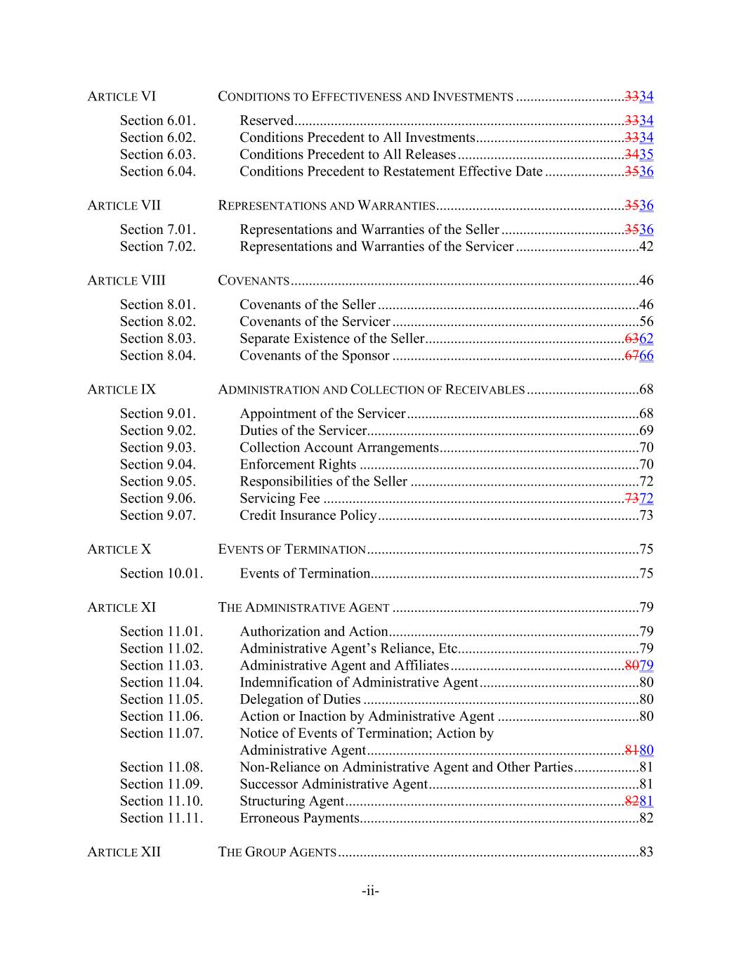 -ii- ARTICLE VI CONDITIONS TO EFFECTIVENESS AND INVESTMENTS ..............................3334 Section 6.01. Reserved...........................................................................................3334 Section 6.02. Conditions Precedent to All Investments.........................................3334 Section 6.03. Conditions Precedent to All Releases ..............................................3435 Section 6.04. Conditions Precedent to Restatement Effective Date ......................3536 ARTICLE VII REPRESENTATIONS AND WARRANTIES....................................................3536 Section 7.01. Representations and Warranties of the Seller ..................................3536 Section 7.02. Representations and Warranties of the Servicer ..................................42 ARTICLE VIII COVENANTS................................................................................................46 Section 8.01. Covenants of the Seller ........................................................................46 Section 8.02. Covenants of the Servicer ....................................................................56 Section 8.03. Separate Existence of the Seller.......................................................6362 Section 8.04. Covenants of the Sponsor ................................................................6766 ARTICLE IX ADMINISTRATION AND COLLECTION OF RECEIVABLES ...............................68 Section 9.01. Appointment of the Servicer................................................................68 Section 9.02. Duties of the Servicer...........................................................................69 Section 9.03. Collection Account Arrangements.......................................................70 Section 9.04. Enforcement Rights .............................................................................70 Section 9.05. Responsibilities of the Seller ...............................................................72 Section 9.06. Servicing Fee ...................................................................................7372 Section 9.07. Credit Insurance Policy........................................................................73 ARTICLE X EVENTS OF TERMINATION...........................................................................75 Section 10.01. Events of Termination..........................................................................75 ARTICLE XI THE ADMINISTRATIVE AGENT ....................................................................79 Section 11.01. Authorization and Action.....................................................................79 Section 11.02. Administrative Agent’s Reliance, Etc..................................................79 Section 11.03. Administrative Agent and Affiliates................................................8079 Section 11.04. Indemnification of Administrative Agent............................................80 Section 11.05. Delegation of Duties ............................................................................80 Section 11.06. Action or Inaction by Administrative Agent .......................................80 Section 11.07. Notice of Events of Termination; Action by Administrative Agent.......................................................................8180 Section 11.08. Non-Reliance on Administrative Agent and Other Parties..................81 Section 11.09. Successor Administrative Agent..........................................................81 Section 11.10. Structuring Agent.............................................................................8281 Section 11.11. Erroneous Payments.............................................................................82 ARTICLE XII THE GROUP AGENTS ...................................................................................83