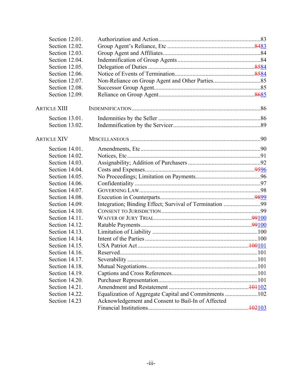 -iii- Section 12.01. Authorization and Action.....................................................................83 Section 12.02. Group Agent’s Reliance, Etc ...........................................................8483 Section 12.03. Group Agent and Affiliates..................................................................84 Section 12.04. Indemnification of Group Agents ........................................................84 Section 12.05. Delegation of Duties ........................................................................8584 Section 12.06. Notice of Events of Termination......................................................8584 Section 12.07. Non-Reliance on Group Agent and Other Parties................................85 Section 12.08. Successor Group Agent........................................................................85 Section 12.09. Reliance on Group Agent.................................................................8685 ARTICLE XIII INDEMNIFICATION.......................................................................................86 Section 13.01. Indemnities by the Seller .....................................................................86 Section 13.02. Indemnification by the Servicer...........................................................89 ARTICLE XIV MISCELLANEOUS ........................................................................................90 Section 14.01. Amendments, Etc.................................................................................90 Section 14.02. Notices, Etc ..........................................................................................91 Section 14.03. Assignability; Addition of Purchasers .................................................92 Section 14.04. Costs and Expenses..........................................................................9596 Section 14.05. No Proceedings; Limitation on Payments............................................96 Section 14.06. Confidentiality .....................................................................................97 Section 14.07. GOVERNING LAW..................................................................................98 Section 14.08. Execution in Counterparts................................................................9899 Section 14.09. Integration; Binding Effect; Survival of Termination .........................99 Section 14.10. CONSENT TO JURISDICTION...................................................................99 Section 14.11. WAIVER OF JURY TRIAL..................................................................99100 Section 14.12. Ratable Payments...........................................................................99100 Section 14.13. Limitation of Liability .......................................................................100 Section 14.14. Intent of the Parties ............................................................................100 Section 14.15. USA Patriot Act ...........................................................................100101 Section 14.16. Reserved.............................................................................................101 Section 14.17. Severability ........................................................................................101 Section 14.18. Mutual Negotiations...........................................................................101 Section 14.19. Captions and Cross References..........................................................101 Section 14.20. Purchaser Representation...................................................................101 Section 14.21. Amendment and Restatement ......................................................101102 Section 14.22. Equalization of Aggregate Capital and Commitments ......................102 Section 14.23 Acknowledgement and Consent to Bail-In of Affected Financial Institutions....................................................................102103