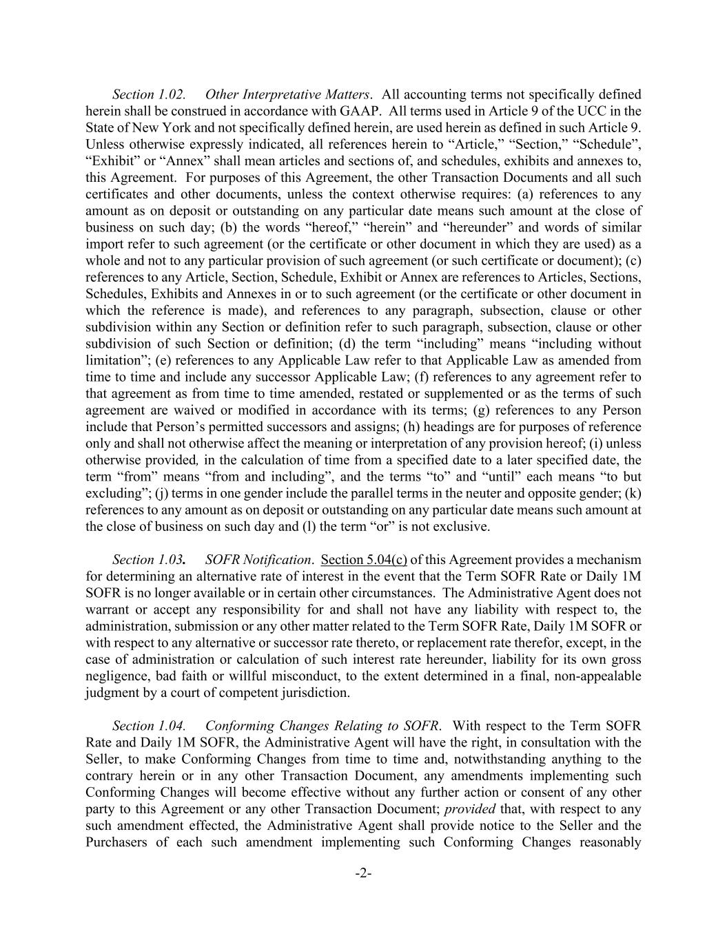 -2- Section 1.02. Other Interpretative Matters. All accounting terms not specifically defined herein shall be construed in accordance with GAAP. All terms used in Article 9 of the UCC in the State of New York and not specifically defined herein, are used herein as defined in such Article 9. Unless otherwise expressly indicated, all references herein to “Article,” “Section,” “Schedule”, “Exhibit” or “Annex” shall mean articles and sections of, and schedules, exhibits and annexes to, this Agreement. For purposes of this Agreement, the other Transaction Documents and all such certificates and other documents, unless the context otherwise requires: (a) references to any amount as on deposit or outstanding on any particular date means such amount at the close of business on such day; (b) the words “hereof,” “herein” and “hereunder” and words of similar import refer to such agreement (or the certificate or other document in which they are used) as a whole and not to any particular provision of such agreement (or such certificate or document); (c) references to any Article, Section, Schedule, Exhibit or Annex are references to Articles, Sections, Schedules, Exhibits and Annexes in or to such agreement (or the certificate or other document in which the reference is made), and references to any paragraph, subsection, clause or other subdivision within any Section or definition refer to such paragraph, subsection, clause or other subdivision of such Section or definition; (d) the term “including” means “including without limitation”; (e) references to any Applicable Law refer to that Applicable Law as amended from time to time and include any successor Applicable Law; (f) references to any agreement refer to that agreement as from time to time amended, restated or supplemented or as the terms of such agreement are waived or modified in accordance with its terms; (g) references to any Person include that Person’s permitted successors and assigns; (h) headings are for purposes of reference only and shall not otherwise affect the meaning or interpretation of any provision hereof; (i) unless otherwise provided, in the calculation of time from a specified date to a later specified date, the term “from” means “from and including”, and the terms “to” and “until” each means “to but excluding”; (j) terms in one gender include the parallel terms in the neuter and opposite gender; (k) references to any amount as on deposit or outstanding on any particular date means such amount at the close of business on such day and (l) the term “or” is not exclusive. Section 1.03. SOFR Notification. Section 5.04(c) of this Agreement provides a mechanism for determining an alternative rate of interest in the event that the Term SOFR Rate or Daily 1M SOFR is no longer available or in certain other circumstances. The Administrative Agent does not warrant or accept any responsibility for and shall not have any liability with respect to, the administration, submission or any other matter related to the Term SOFR Rate, Daily 1M SOFR or with respect to any alternative or successor rate thereto, or replacement rate therefor, except, in the case of administration or calculation of such interest rate hereunder, liability for its own gross negligence, bad faith or willful misconduct, to the extent determined in a final, non-appealable judgment by a court of competent jurisdiction. Section 1.04. Conforming Changes Relating to SOFR. With respect to the Term SOFR Rate and Daily 1M SOFR, the Administrative Agent will have the right, in consultation with the Seller, to make Conforming Changes from time to time and, notwithstanding anything to the contrary herein or in any other Transaction Document, any amendments implementing such Conforming Changes will become effective without any further action or consent of any other party to this Agreement or any other Transaction Document; provided that, with respect to any such amendment effected, the Administrative Agent shall provide notice to the Seller and the Purchasers of each such amendment implementing such Conforming Changes reasonably