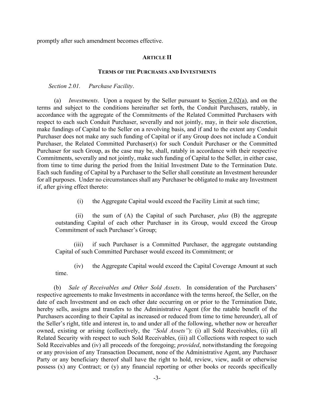-3- promptly after such amendment becomes effective. ARTICLE II TERMS OF THE PURCHASES AND INVESTMENTS Section 2.01. Purchase Facility. (a) Investments. Upon a request by the Seller pursuant to Section 2.02(a), and on the terms and subject to the conditions hereinafter set forth, the Conduit Purchasers, ratably, in accordance with the aggregate of the Commitments of the Related Committed Purchasers with respect to each such Conduit Purchaser, severally and not jointly, may, in their sole discretion, make fundings of Capital to the Seller on a revolving basis, and if and to the extent any Conduit Purchaser does not make any such funding of Capital or if any Group does not include a Conduit Purchaser, the Related Committed Purchaser(s) for such Conduit Purchaser or the Committed Purchaser for such Group, as the case may be, shall, ratably in accordance with their respective Commitments, severally and not jointly, make such funding of Capital to the Seller, in either case, from time to time during the period from the Initial Investment Date to the Termination Date. Each such funding of Capital by a Purchaser to the Seller shall constitute an Investment hereunder for all purposes. Under no circumstances shall any Purchaser be obligated to make any Investment if, after giving effect thereto: (i) the Aggregate Capital would exceed the Facility Limit at such time; (ii) the sum of (A) the Capital of such Purchaser, plus (B) the aggregate outstanding Capital of each other Purchaser in its Group, would exceed the Group Commitment of such Purchaser’s Group; (iii) if such Purchaser is a Committed Purchaser, the aggregate outstanding Capital of such Committed Purchaser would exceed its Commitment; or (iv) the Aggregate Capital would exceed the Capital Coverage Amount at such time. (b) Sale of Receivables and Other Sold Assets. In consideration of the Purchasers’ respective agreements to make Investments in accordance with the terms hereof, the Seller, on the date of each Investment and on each other date occurring on or prior to the Termination Date, hereby sells, assigns and transfers to the Administrative Agent (for the ratable benefit of the Purchasers according to their Capital as increased or reduced from time to time hereunder), all of the Seller’s right, title and interest in, to and under all of the following, whether now or hereafter owned, existing or arising (collectively, the “Sold Assets”): (i) all Sold Receivables, (ii) all Related Security with respect to such Sold Receivables, (iii) all Collections with respect to such Sold Receivables and (iv) all proceeds of the foregoing; provided, notwithstanding the foregoing or any provision of any Transaction Document, none of the Administrative Agent, any Purchaser Party or any beneficiary thereof shall have the right to hold, review, view, audit or otherwise possess (x) any Contract; or (y) any financial reporting or other books or records specifically