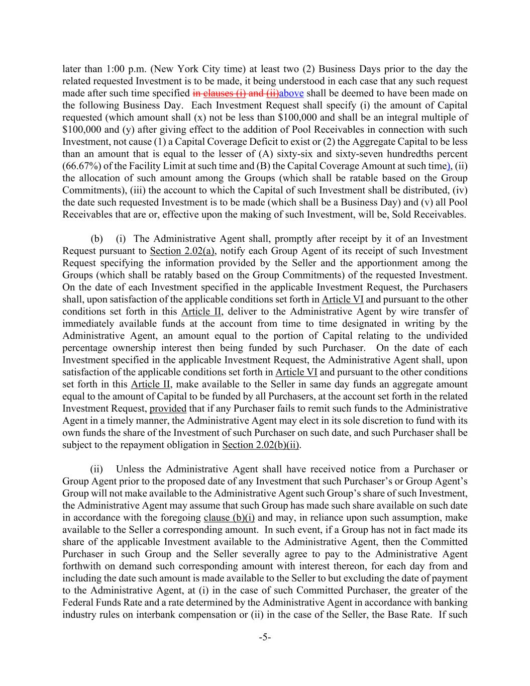 -5- later than 1:00 p.m. (New York City time) at least two (2) Business Days prior to the day the related requested Investment is to be made, it being understood in each case that any such request made after such time specified in clauses (i) and (ii)above shall be deemed to have been made on the following Business Day. Each Investment Request shall specify (i) the amount of Capital requested (which amount shall (x) not be less than $100,000 and shall be an integral multiple of $100,000 and (y) after giving effect to the addition of Pool Receivables in connection with such Investment, not cause (1) a Capital Coverage Deficit to exist or (2) the Aggregate Capital to be less than an amount that is equal to the lesser of (A) sixty-six and sixty-seven hundredths percent (66.67%) of the Facility Limit at such time and (B) the Capital Coverage Amount at such time), (ii) the allocation of such amount among the Groups (which shall be ratable based on the Group Commitments), (iii) the account to which the Capital of such Investment shall be distributed, (iv) the date such requested Investment is to be made (which shall be a Business Day) and (v) all Pool Receivables that are or, effective upon the making of such Investment, will be, Sold Receivables. (b) (i) The Administrative Agent shall, promptly after receipt by it of an Investment Request pursuant to Section 2.02(a), notify each Group Agent of its receipt of such Investment Request specifying the information provided by the Seller and the apportionment among the Groups (which shall be ratably based on the Group Commitments) of the requested Investment. On the date of each Investment specified in the applicable Investment Request, the Purchasers shall, upon satisfaction of the applicable conditions set forth in Article VI and pursuant to the other conditions set forth in this Article II, deliver to the Administrative Agent by wire transfer of immediately available funds at the account from time to time designated in writing by the Administrative Agent, an amount equal to the portion of Capital relating to the undivided percentage ownership interest then being funded by such Purchaser. On the date of each Investment specified in the applicable Investment Request, the Administrative Agent shall, upon satisfaction of the applicable conditions set forth in Article VI and pursuant to the other conditions set forth in this Article II, make available to the Seller in same day funds an aggregate amount equal to the amount of Capital to be funded by all Purchasers, at the account set forth in the related Investment Request, provided that if any Purchaser fails to remit such funds to the Administrative Agent in a timely manner, the Administrative Agent may elect in its sole discretion to fund with its own funds the share of the Investment of such Purchaser on such date, and such Purchaser shall be subject to the repayment obligation in Section 2.02(b)(ii). (ii) Unless the Administrative Agent shall have received notice from a Purchaser or Group Agent prior to the proposed date of any Investment that such Purchaser’s or Group Agent’s Group will not make available to the Administrative Agent such Group’s share of such Investment, the Administrative Agent may assume that such Group has made such share available on such date in accordance with the foregoing clause (b)(i) and may, in reliance upon such assumption, make available to the Seller a corresponding amount. In such event, if a Group has not in fact made its share of the applicable Investment available to the Administrative Agent, then the Committed Purchaser in such Group and the Seller severally agree to pay to the Administrative Agent forthwith on demand such corresponding amount with interest thereon, for each day from and including the date such amount is made available to the Seller to but excluding the date of payment to the Administrative Agent, at (i) in the case of such Committed Purchaser, the greater of the Federal Funds Rate and a rate determined by the Administrative Agent in accordance with banking industry rules on interbank compensation or (ii) in the case of the Seller, the Base Rate. If such