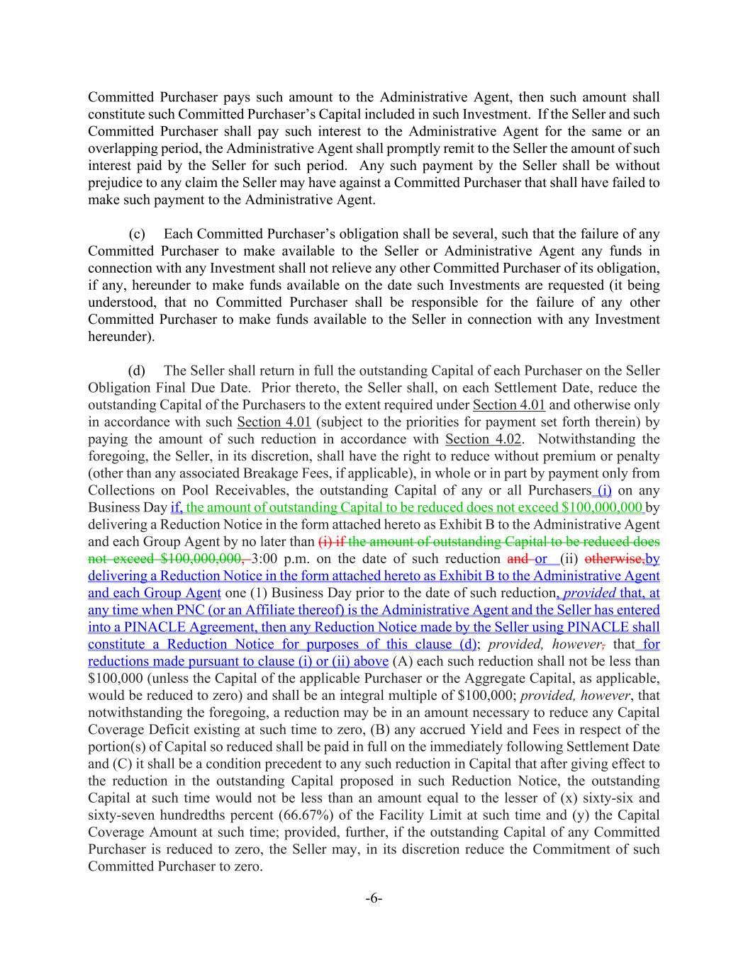 -6- Committed Purchaser pays such amount to the Administrative Agent, then such amount shall constitute such Committed Purchaser’s Capital included in such Investment. If the Seller and such Committed Purchaser shall pay such interest to the Administrative Agent for the same or an overlapping period, the Administrative Agent shall promptly remit to the Seller the amount of such interest paid by the Seller for such period. Any such payment by the Seller shall be without prejudice to any claim the Seller may have against a Committed Purchaser that shall have failed to make such payment to the Administrative Agent. (c) Each Committed Purchaser’s obligation shall be several, such that the failure of any Committed Purchaser to make available to the Seller or Administrative Agent any funds in connection with any Investment shall not relieve any other Committed Purchaser of its obligation, if any, hereunder to make funds available on the date such Investments are requested (it being understood, that no Committed Purchaser shall be responsible for the failure of any other Committed Purchaser to make funds available to the Seller in connection with any Investment hereunder). (d) The Seller shall return in full the outstanding Capital of each Purchaser on the Seller Obligation Final Due Date. Prior thereto, the Seller shall, on each Settlement Date, reduce the outstanding Capital of the Purchasers to the extent required under Section 4.01 and otherwise only in accordance with such Section 4.01 (subject to the priorities for payment set forth therein) by paying the amount of such reduction in accordance with Section 4.02. Notwithstanding the foregoing, the Seller, in its discretion, shall have the right to reduce without premium or penalty (other than any associated Breakage Fees, if applicable), in whole or in part by payment only from Collections on Pool Receivables, the outstanding Capital of any or all Purchasers (i) on any Business Day if, the amount of outstanding Capital to be reduced does not exceed $100,000,000 by delivering a Reduction Notice in the form attached hereto as Exhibit B to the Administrative Agent and each Group Agent by no later than (i) if the amount of outstanding Capital to be reduced does not exceed $100,000,000, 3:00 p.m. on the date of such reduction and or (ii) otherwise,by delivering a Reduction Notice in the form attached hereto as Exhibit B to the Administrative Agent and each Group Agent one (1) Business Day prior to the date of such reduction, provided that, at any time when PNC (or an Affiliate thereof) is the Administrative Agent and the Seller has entered into a PINACLE Agreement, then any Reduction Notice made by the Seller using PINACLE shall constitute a Reduction Notice for purposes of this clause (d); provided, however, that for reductions made pursuant to clause (i) or (ii) above (A) each such reduction shall not be less than $100,000 (unless the Capital of the applicable Purchaser or the Aggregate Capital, as applicable, would be reduced to zero) and shall be an integral multiple of $100,000; provided, however, that notwithstanding the foregoing, a reduction may be in an amount necessary to reduce any Capital Coverage Deficit existing at such time to zero, (B) any accrued Yield and Fees in respect of the portion(s) of Capital so reduced shall be paid in full on the immediately following Settlement Date and (C) it shall be a condition precedent to any such reduction in Capital that after giving effect to the reduction in the outstanding Capital proposed in such Reduction Notice, the outstanding Capital at such time would not be less than an amount equal to the lesser of (x) sixty-six and sixty-seven hundredths percent (66.67%) of the Facility Limit at such time and (y) the Capital Coverage Amount at such time; provided, further, if the outstanding Capital of any Committed Purchaser is reduced to zero, the Seller may, in its discretion reduce the Commitment of such Committed Purchaser to zero.