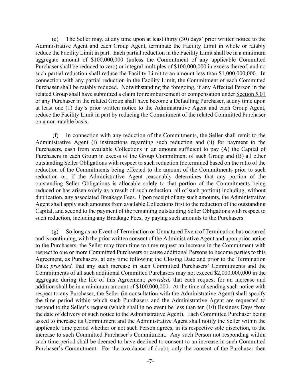 -7- (e) The Seller may, at any time upon at least thirty (30) days’ prior written notice to the Administrative Agent and each Group Agent, terminate the Facility Limit in whole or ratably reduce the Facility Limit in part. Each partial reduction in the Facility Limit shall be in a minimum aggregate amount of $100,000,000 (unless the Commitment of any applicable Committed Purchaser shall be reduced to zero) or integral multiples of $100,000,000 in excess thereof, and no such partial reduction shall reduce the Facility Limit to an amount less than $1,000,000,000. In connection with any partial reduction in the Facility Limit, the Commitment of each Committed Purchaser shall be ratably reduced. Notwithstanding the foregoing, if any Affected Person in the related Group shall have submitted a claim for reimbursement or compensation under Section 5.01 or any Purchaser in the related Group shall have become a Defaulting Purchaser, at any time upon at least one (1) day’s prior written notice to the Administrative Agent and each Group Agent, reduce the Facility Limit in part by reducing the Commitment of the related Committed Purchaser on a non-ratable basis. (f) In connection with any reduction of the Commitments, the Seller shall remit to the Administrative Agent (i) instructions regarding such reduction and (ii) for payment to the Purchasers, cash from available Collections in an amount sufficient to pay (A) the Capital of Purchasers in each Group in excess of the Group Commitment of such Group and (B) all other outstanding Seller Obligations with respect to such reduction (determined based on the ratio of the reduction of the Commitments being effected to the amount of the Commitments prior to such reduction or, if the Administrative Agent reasonably determines that any portion of the outstanding Seller Obligations is allocable solely to that portion of the Commitments being reduced or has arisen solely as a result of such reduction, all of such portion) including, without duplication, any associated Breakage Fees. Upon receipt of any such amounts, the Administrative Agent shall apply such amounts from available Collections first to the reduction of the outstanding Capital, and second to the payment of the remaining outstanding Seller Obligations with respect to such reduction, including any Breakage Fees, by paying such amounts to the Purchasers. (g) So long as no Event of Termination or Unmatured Event of Termination has occurred and is continuing, with the prior written consent of the Administrative Agent and upon prior notice to the Purchasers, the Seller may from time to time request an increase in the Commitment with respect to one or more Committed Purchasers or cause additional Persons to become parties to this Agreement, as Purchasers, at any time following the Closing Date and prior to the Termination Date; provided, that any such increase in such Committed Purchasers’ Commitments and the Commitments of all such additional Committed Purchasers may not exceed $2,000,000,000 in the aggregate during the life of this Agreement; provided, that each request for an increase and addition shall be in a minimum amount of $100,000,000. At the time of sending such notice with respect to any Purchaser, the Seller (in consultation with the Administrative Agent) shall specify the time period within which such Purchasers and the Administrative Agent are requested to respond to the Seller’s request (which shall in no event be less than ten (10) Business Days from the date of delivery of such notice to the Administrative Agent). Each Committed Purchaser being asked to increase its Commitment and the Administrative Agent shall notify the Seller within the applicable time period whether or not such Person agrees, in its respective sole discretion, to the increase to such Committed Purchaser’s Commitment. Any such Person not responding within such time period shall be deemed to have declined to consent to an increase in such Committed Purchaser’s Commitment. For the avoidance of doubt, only the consent of the Purchaser then