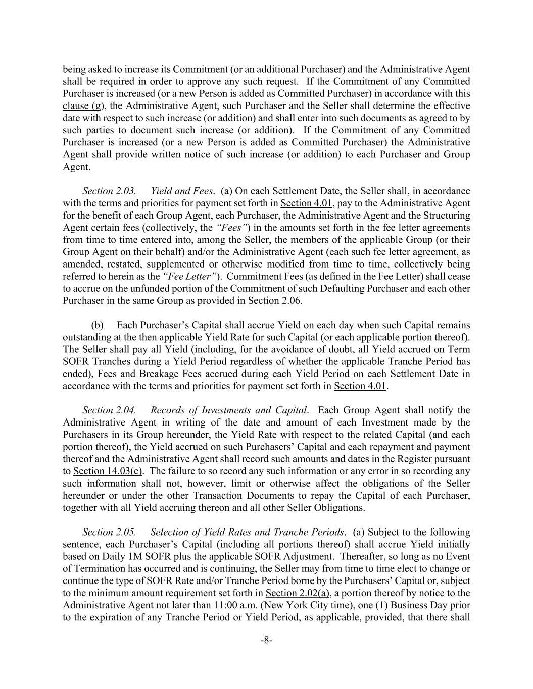 -8- being asked to increase its Commitment (or an additional Purchaser) and the Administrative Agent shall be required in order to approve any such request. If the Commitment of any Committed Purchaser is increased (or a new Person is added as Committed Purchaser) in accordance with this clause (g), the Administrative Agent, such Purchaser and the Seller shall determine the effective date with respect to such increase (or addition) and shall enter into such documents as agreed to by such parties to document such increase (or addition). If the Commitment of any Committed Purchaser is increased (or a new Person is added as Committed Purchaser) the Administrative Agent shall provide written notice of such increase (or addition) to each Purchaser and Group Agent. Section 2.03. Yield and Fees. (a) On each Settlement Date, the Seller shall, in accordance with the terms and priorities for payment set forth in Section 4.01, pay to the Administrative Agent for the benefit of each Group Agent, each Purchaser, the Administrative Agent and the Structuring Agent certain fees (collectively, the “Fees”) in the amounts set forth in the fee letter agreements from time to time entered into, among the Seller, the members of the applicable Group (or their Group Agent on their behalf) and/or the Administrative Agent (each such fee letter agreement, as amended, restated, supplemented or otherwise modified from time to time, collectively being referred to herein as the “Fee Letter”). Commitment Fees (as defined in the Fee Letter) shall cease to accrue on the unfunded portion of the Commitment of such Defaulting Purchaser and each other Purchaser in the same Group as provided in Section 2.06. (b) Each Purchaser’s Capital shall accrue Yield on each day when such Capital remains outstanding at the then applicable Yield Rate for such Capital (or each applicable portion thereof). The Seller shall pay all Yield (including, for the avoidance of doubt, all Yield accrued on Term SOFR Tranches during a Yield Period regardless of whether the applicable Tranche Period has ended), Fees and Breakage Fees accrued during each Yield Period on each Settlement Date in accordance with the terms and priorities for payment set forth in Section 4.01. Section 2.04. Records of Investments and Capital. Each Group Agent shall notify the Administrative Agent in writing of the date and amount of each Investment made by the Purchasers in its Group hereunder, the Yield Rate with respect to the related Capital (and each portion thereof), the Yield accrued on such Purchasers’ Capital and each repayment and payment thereof and the Administrative Agent shall record such amounts and dates in the Register pursuant to Section 14.03(c). The failure to so record any such information or any error in so recording any such information shall not, however, limit or otherwise affect the obligations of the Seller hereunder or under the other Transaction Documents to repay the Capital of each Purchaser, together with all Yield accruing thereon and all other Seller Obligations. Section 2.05. Selection of Yield Rates and Tranche Periods. (a) Subject to the following sentence, each Purchaser’s Capital (including all portions thereof) shall accrue Yield initially based on Daily 1M SOFR plus the applicable SOFR Adjustment. Thereafter, so long as no Event of Termination has occurred and is continuing, the Seller may from time to time elect to change or continue the type of SOFR Rate and/or Tranche Period borne by the Purchasers’ Capital or, subject to the minimum amount requirement set forth in Section 2.02(a), a portion thereof by notice to the Administrative Agent not later than 11:00 a.m. (New York City time), one (1) Business Day prior to the expiration of any Tranche Period or Yield Period, as applicable, provided, that there shall