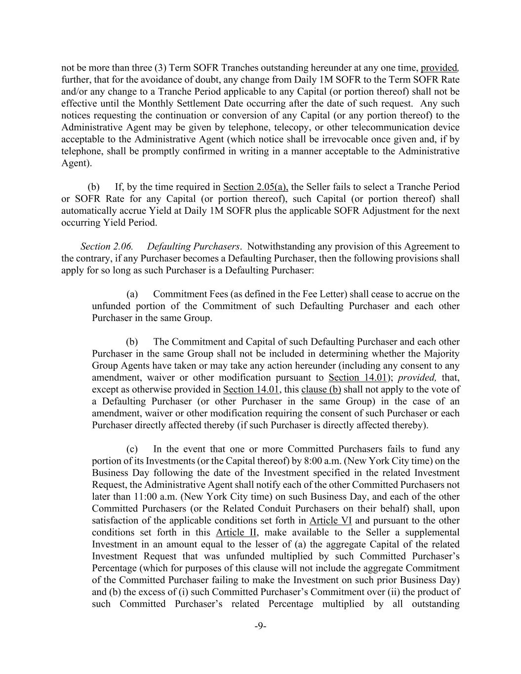-9- not be more than three (3) Term SOFR Tranches outstanding hereunder at any one time, provided, further, that for the avoidance of doubt, any change from Daily 1M SOFR to the Term SOFR Rate and/or any change to a Tranche Period applicable to any Capital (or portion thereof) shall not be effective until the Monthly Settlement Date occurring after the date of such request. Any such notices requesting the continuation or conversion of any Capital (or any portion thereof) to the Administrative Agent may be given by telephone, telecopy, or other telecommunication device acceptable to the Administrative Agent (which notice shall be irrevocable once given and, if by telephone, shall be promptly confirmed in writing in a manner acceptable to the Administrative Agent). (b) If, by the time required in Section 2.05(a), the Seller fails to select a Tranche Period or SOFR Rate for any Capital (or portion thereof), such Capital (or portion thereof) shall automatically accrue Yield at Daily 1M SOFR plus the applicable SOFR Adjustment for the next occurring Yield Period. Section 2.06. Defaulting Purchasers. Notwithstanding any provision of this Agreement to the contrary, if any Purchaser becomes a Defaulting Purchaser, then the following provisions shall apply for so long as such Purchaser is a Defaulting Purchaser: (a) Commitment Fees (as defined in the Fee Letter) shall cease to accrue on the unfunded portion of the Commitment of such Defaulting Purchaser and each other Purchaser in the same Group. (b) The Commitment and Capital of such Defaulting Purchaser and each other Purchaser in the same Group shall not be included in determining whether the Majority Group Agents have taken or may take any action hereunder (including any consent to any amendment, waiver or other modification pursuant to Section 14.01); provided, that, except as otherwise provided in Section 14.01, this clause (b) shall not apply to the vote of a Defaulting Purchaser (or other Purchaser in the same Group) in the case of an amendment, waiver or other modification requiring the consent of such Purchaser or each Purchaser directly affected thereby (if such Purchaser is directly affected thereby). (c) In the event that one or more Committed Purchasers fails to fund any portion of its Investments (or the Capital thereof) by 8:00 a.m. (New York City time) on the Business Day following the date of the Investment specified in the related Investment Request, the Administrative Agent shall notify each of the other Committed Purchasers not later than 11:00 a.m. (New York City time) on such Business Day, and each of the other Committed Purchasers (or the Related Conduit Purchasers on their behalf) shall, upon satisfaction of the applicable conditions set forth in Article VI and pursuant to the other conditions set forth in this Article II, make available to the Seller a supplemental Investment in an amount equal to the lesser of (a) the aggregate Capital of the related Investment Request that was unfunded multiplied by such Committed Purchaser’s Percentage (which for purposes of this clause will not include the aggregate Commitment of the Committed Purchaser failing to make the Investment on such prior Business Day) and (b) the excess of (i) such Committed Purchaser’s Commitment over (ii) the product of such Committed Purchaser’s related Percentage multiplied by all outstanding
