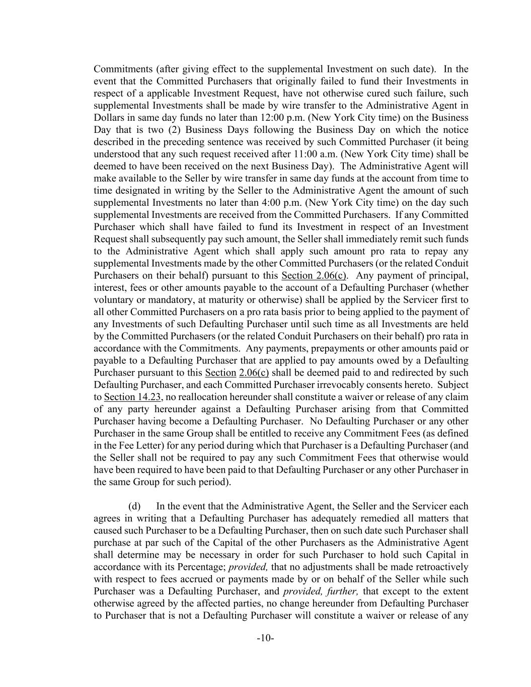 -10- Commitments (after giving effect to the supplemental Investment on such date). In the event that the Committed Purchasers that originally failed to fund their Investments in respect of a applicable Investment Request, have not otherwise cured such failure, such supplemental Investments shall be made by wire transfer to the Administrative Agent in Dollars in same day funds no later than 12:00 p.m. (New York City time) on the Business Day that is two (2) Business Days following the Business Day on which the notice described in the preceding sentence was received by such Committed Purchaser (it being understood that any such request received after 11:00 a.m. (New York City time) shall be deemed to have been received on the next Business Day). The Administrative Agent will make available to the Seller by wire transfer in same day funds at the account from time to time designated in writing by the Seller to the Administrative Agent the amount of such supplemental Investments no later than 4:00 p.m. (New York City time) on the day such supplemental Investments are received from the Committed Purchasers. If any Committed Purchaser which shall have failed to fund its Investment in respect of an Investment Request shall subsequently pay such amount, the Seller shall immediately remit such funds to the Administrative Agent which shall apply such amount pro rata to repay any supplemental Investments made by the other Committed Purchasers (or the related Conduit Purchasers on their behalf) pursuant to this Section 2.06(c). Any payment of principal, interest, fees or other amounts payable to the account of a Defaulting Purchaser (whether voluntary or mandatory, at maturity or otherwise) shall be applied by the Servicer first to all other Committed Purchasers on a pro rata basis prior to being applied to the payment of any Investments of such Defaulting Purchaser until such time as all Investments are held by the Committed Purchasers (or the related Conduit Purchasers on their behalf) pro rata in accordance with the Commitments. Any payments, prepayments or other amounts paid or payable to a Defaulting Purchaser that are applied to pay amounts owed by a Defaulting Purchaser pursuant to this Section 2.06(c) shall be deemed paid to and redirected by such Defaulting Purchaser, and each Committed Purchaser irrevocably consents hereto. Subject to Section 14.23, no reallocation hereunder shall constitute a waiver or release of any claim of any party hereunder against a Defaulting Purchaser arising from that Committed Purchaser having become a Defaulting Purchaser. No Defaulting Purchaser or any other Purchaser in the same Group shall be entitled to receive any Commitment Fees (as defined in the Fee Letter) for any period during which that Purchaser is a Defaulting Purchaser (and the Seller shall not be required to pay any such Commitment Fees that otherwise would have been required to have been paid to that Defaulting Purchaser or any other Purchaser in the same Group for such period). (d) In the event that the Administrative Agent, the Seller and the Servicer each agrees in writing that a Defaulting Purchaser has adequately remedied all matters that caused such Purchaser to be a Defaulting Purchaser, then on such date such Purchaser shall purchase at par such of the Capital of the other Purchasers as the Administrative Agent shall determine may be necessary in order for such Purchaser to hold such Capital in accordance with its Percentage; provided, that no adjustments shall be made retroactively with respect to fees accrued or payments made by or on behalf of the Seller while such Purchaser was a Defaulting Purchaser, and provided, further, that except to the extent otherwise agreed by the affected parties, no change hereunder from Defaulting Purchaser to Purchaser that is not a Defaulting Purchaser will constitute a waiver or release of any