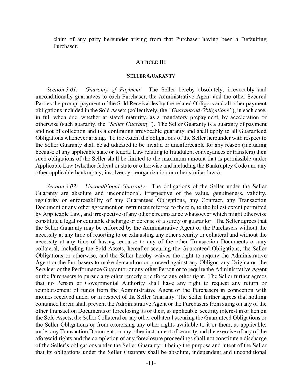 -11- claim of any party hereunder arising from that Purchaser having been a Defaulting Purchaser. ARTICLE III SELLER GUARANTY Section 3.01. Guaranty of Payment. The Seller hereby absolutely, irrevocably and unconditionally guarantees to each Purchaser, the Administrative Agent and the other Secured Parties the prompt payment of the Sold Receivables by the related Obligors and all other payment obligations included in the Sold Assets (collectively, the “Guaranteed Obligations”), in each case, in full when due, whether at stated maturity, as a mandatory prepayment, by acceleration or otherwise (such guaranty, the “Seller Guaranty”). The Seller Guaranty is a guaranty of payment and not of collection and is a continuing irrevocable guaranty and shall apply to all Guaranteed Obligations whenever arising. To the extent the obligations of the Seller hereunder with respect to the Seller Guaranty shall be adjudicated to be invalid or unenforceable for any reason (including because of any applicable state or federal Law relating to fraudulent conveyances or transfers) then such obligations of the Seller shall be limited to the maximum amount that is permissible under Applicable Law (whether federal or state or otherwise and including the Bankruptcy Code and any other applicable bankruptcy, insolvency, reorganization or other similar laws). Section 3.02. Unconditional Guaranty. The obligations of the Seller under the Seller Guaranty are absolute and unconditional, irrespective of the value, genuineness, validity, regularity or enforceability of any Guaranteed Obligations, any Contract, any Transaction Document or any other agreement or instrument referred to therein, to the fullest extent permitted by Applicable Law, and irrespective of any other circumstance whatsoever which might otherwise constitute a legal or equitable discharge or defense of a surety or guarantor. The Seller agrees that the Seller Guaranty may be enforced by the Administrative Agent or the Purchasers without the necessity at any time of resorting to or exhausting any other security or collateral and without the necessity at any time of having recourse to any of the other Transaction Documents or any collateral, including the Sold Assets, hereafter securing the Guaranteed Obligations, the Seller Obligations or otherwise, and the Seller hereby waives the right to require the Administrative Agent or the Purchasers to make demand on or proceed against any Obligor, any Originator, the Servicer or the Performance Guarantor or any other Person or to require the Administrative Agent or the Purchasers to pursue any other remedy or enforce any other right. The Seller further agrees that no Person or Governmental Authority shall have any right to request any return or reimbursement of funds from the Administrative Agent or the Purchasers in connection with monies received under or in respect of the Seller Guaranty. The Seller further agrees that nothing contained herein shall prevent the Administrative Agent or the Purchasers from suing on any of the other Transaction Documents or foreclosing its or their, as applicable, security interest in or lien on the Sold Assets, the Seller Collateral or any other collateral securing the Guaranteed Obligations or the Seller Obligations or from exercising any other rights available to it or them, as applicable, under any Transaction Document, or any other instrument of security and the exercise of any of the aforesaid rights and the completion of any foreclosure proceedings shall not constitute a discharge of the Seller’s obligations under the Seller Guaranty; it being the purpose and intent of the Seller that its obligations under the Seller Guaranty shall be absolute, independent and unconditional