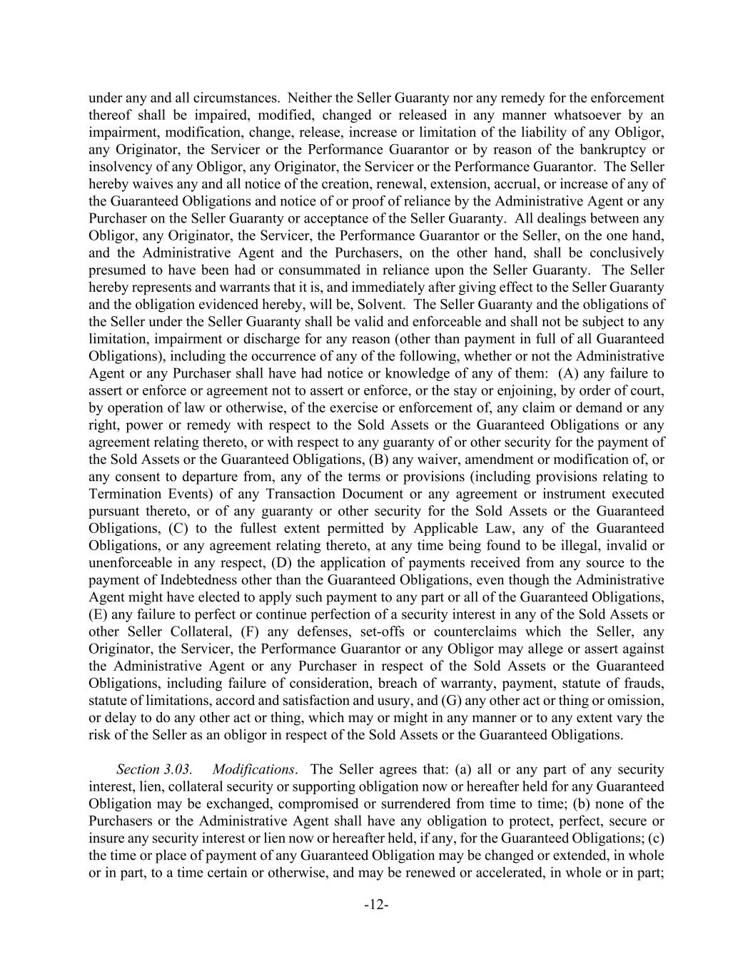 -12- under any and all circumstances. Neither the Seller Guaranty nor any remedy for the enforcement thereof shall be impaired, modified, changed or released in any manner whatsoever by an impairment, modification, change, release, increase or limitation of the liability of any Obligor, any Originator, the Servicer or the Performance Guarantor or by reason of the bankruptcy or insolvency of any Obligor, any Originator, the Servicer or the Performance Guarantor. The Seller hereby waives any and all notice of the creation, renewal, extension, accrual, or increase of any of the Guaranteed Obligations and notice of or proof of reliance by the Administrative Agent or any Purchaser on the Seller Guaranty or acceptance of the Seller Guaranty. All dealings between any Obligor, any Originator, the Servicer, the Performance Guarantor or the Seller, on the one hand, and the Administrative Agent and the Purchasers, on the other hand, shall be conclusively presumed to have been had or consummated in reliance upon the Seller Guaranty. The Seller hereby represents and warrants that it is, and immediately after giving effect to the Seller Guaranty and the obligation evidenced hereby, will be, Solvent. The Seller Guaranty and the obligations of the Seller under the Seller Guaranty shall be valid and enforceable and shall not be subject to any limitation, impairment or discharge for any reason (other than payment in full of all Guaranteed Obligations), including the occurrence of any of the following, whether or not the Administrative Agent or any Purchaser shall have had notice or knowledge of any of them: (A) any failure to assert or enforce or agreement not to assert or enforce, or the stay or enjoining, by order of court, by operation of law or otherwise, of the exercise or enforcement of, any claim or demand or any right, power or remedy with respect to the Sold Assets or the Guaranteed Obligations or any agreement relating thereto, or with respect to any guaranty of or other security for the payment of the Sold Assets or the Guaranteed Obligations, (B) any waiver, amendment or modification of, or any consent to departure from, any of the terms or provisions (including provisions relating to Termination Events) of any Transaction Document or any agreement or instrument executed pursuant thereto, or of any guaranty or other security for the Sold Assets or the Guaranteed Obligations, (C) to the fullest extent permitted by Applicable Law, any of the Guaranteed Obligations, or any agreement relating thereto, at any time being found to be illegal, invalid or unenforceable in any respect, (D) the application of payments received from any source to the payment of Indebtedness other than the Guaranteed Obligations, even though the Administrative Agent might have elected to apply such payment to any part or all of the Guaranteed Obligations, (E) any failure to perfect or continue perfection of a security interest in any of the Sold Assets or other Seller Collateral, (F) any defenses, set-offs or counterclaims which the Seller, any Originator, the Servicer, the Performance Guarantor or any Obligor may allege or assert against the Administrative Agent or any Purchaser in respect of the Sold Assets or the Guaranteed Obligations, including failure of consideration, breach of warranty, payment, statute of frauds, statute of limitations, accord and satisfaction and usury, and (G) any other act or thing or omission, or delay to do any other act or thing, which may or might in any manner or to any extent vary the risk of the Seller as an obligor in respect of the Sold Assets or the Guaranteed Obligations. Section 3.03. Modifications. The Seller agrees that: (a) all or any part of any security interest, lien, collateral security or supporting obligation now or hereafter held for any Guaranteed Obligation may be exchanged, compromised or surrendered from time to time; (b) none of the Purchasers or the Administrative Agent shall have any obligation to protect, perfect, secure or insure any security interest or lien now or hereafter held, if any, for the Guaranteed Obligations; (c) the time or place of payment of any Guaranteed Obligation may be changed or extended, in whole or in part, to a time certain or otherwise, and may be renewed or accelerated, in whole or in part;