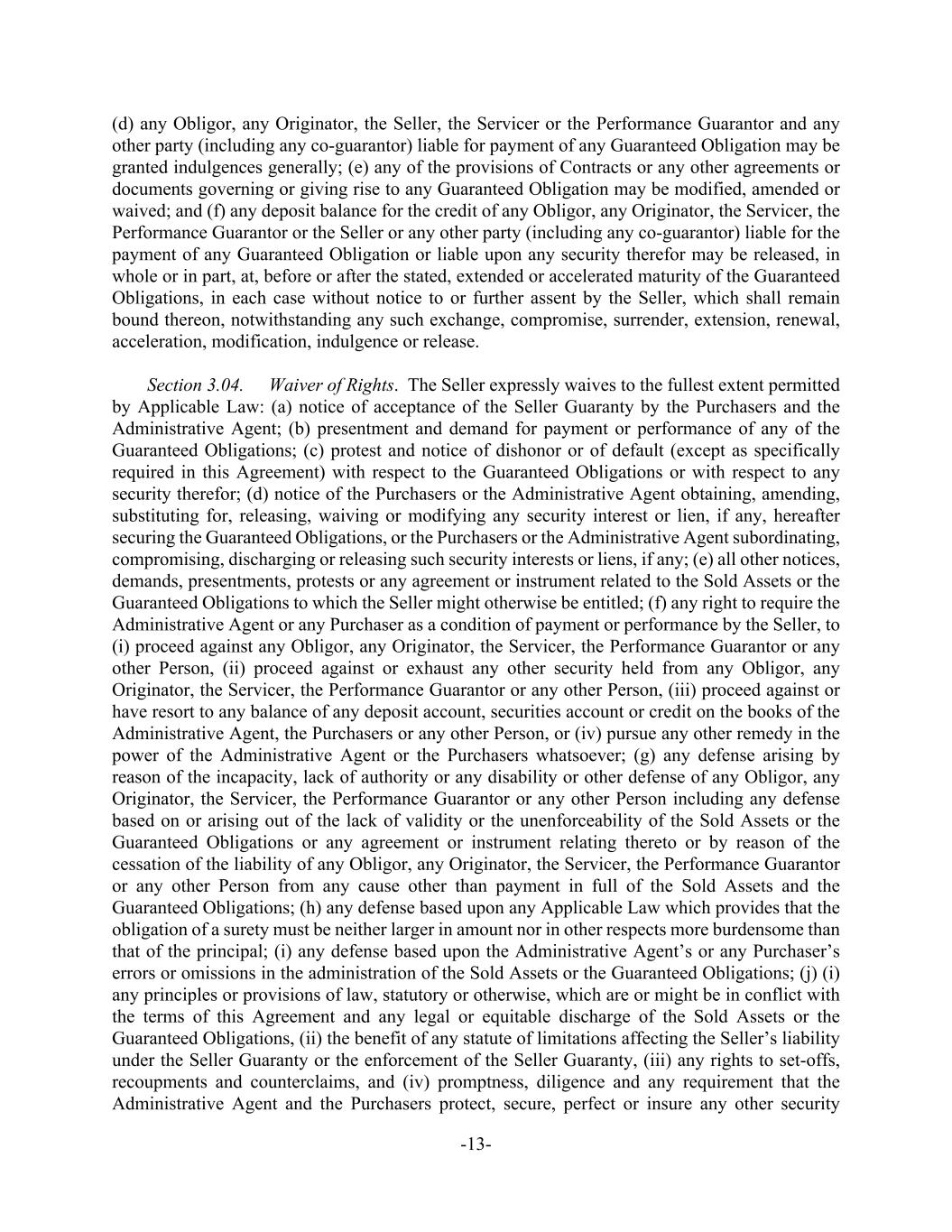 -13- (d) any Obligor, any Originator, the Seller, the Servicer or the Performance Guarantor and any other party (including any co-guarantor) liable for payment of any Guaranteed Obligation may be granted indulgences generally; (e) any of the provisions of Contracts or any other agreements or documents governing or giving rise to any Guaranteed Obligation may be modified, amended or waived; and (f) any deposit balance for the credit of any Obligor, any Originator, the Servicer, the Performance Guarantor or the Seller or any other party (including any co-guarantor) liable for the payment of any Guaranteed Obligation or liable upon any security therefor may be released, in whole or in part, at, before or after the stated, extended or accelerated maturity of the Guaranteed Obligations, in each case without notice to or further assent by the Seller, which shall remain bound thereon, notwithstanding any such exchange, compromise, surrender, extension, renewal, acceleration, modification, indulgence or release. Section 3.04. Waiver of Rights. The Seller expressly waives to the fullest extent permitted by Applicable Law: (a) notice of acceptance of the Seller Guaranty by the Purchasers and the Administrative Agent; (b) presentment and demand for payment or performance of any of the Guaranteed Obligations; (c) protest and notice of dishonor or of default (except as specifically required in this Agreement) with respect to the Guaranteed Obligations or with respect to any security therefor; (d) notice of the Purchasers or the Administrative Agent obtaining, amending, substituting for, releasing, waiving or modifying any security interest or lien, if any, hereafter securing the Guaranteed Obligations, or the Purchasers or the Administrative Agent subordinating, compromising, discharging or releasing such security interests or liens, if any; (e) all other notices, demands, presentments, protests or any agreement or instrument related to the Sold Assets or the Guaranteed Obligations to which the Seller might otherwise be entitled; (f) any right to require the Administrative Agent or any Purchaser as a condition of payment or performance by the Seller, to (i) proceed against any Obligor, any Originator, the Servicer, the Performance Guarantor or any other Person, (ii) proceed against or exhaust any other security held from any Obligor, any Originator, the Servicer, the Performance Guarantor or any other Person, (iii) proceed against or have resort to any balance of any deposit account, securities account or credit on the books of the Administrative Agent, the Purchasers or any other Person, or (iv) pursue any other remedy in the power of the Administrative Agent or the Purchasers whatsoever; (g) any defense arising by reason of the incapacity, lack of authority or any disability or other defense of any Obligor, any Originator, the Servicer, the Performance Guarantor or any other Person including any defense based on or arising out of the lack of validity or the unenforceability of the Sold Assets or the Guaranteed Obligations or any agreement or instrument relating thereto or by reason of the cessation of the liability of any Obligor, any Originator, the Servicer, the Performance Guarantor or any other Person from any cause other than payment in full of the Sold Assets and the Guaranteed Obligations; (h) any defense based upon any Applicable Law which provides that the obligation of a surety must be neither larger in amount nor in other respects more burdensome than that of the principal; (i) any defense based upon the Administrative Agent’s or any Purchaser’s errors or omissions in the administration of the Sold Assets or the Guaranteed Obligations; (j) (i) any principles or provisions of law, statutory or otherwise, which are or might be in conflict with the terms of this Agreement and any legal or equitable discharge of the Sold Assets or the Guaranteed Obligations, (ii) the benefit of any statute of limitations affecting the Seller’s liability under the Seller Guaranty or the enforcement of the Seller Guaranty, (iii) any rights to set-offs, recoupments and counterclaims, and (iv) promptness, diligence and any requirement that the Administrative Agent and the Purchasers protect, secure, perfect or insure any other security
