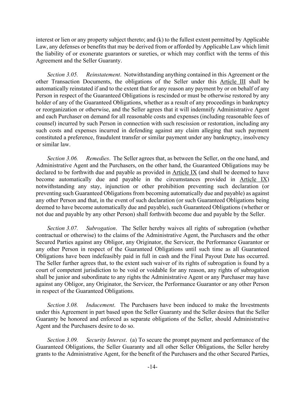-14- interest or lien or any property subject thereto; and (k) to the fullest extent permitted by Applicable Law, any defenses or benefits that may be derived from or afforded by Applicable Law which limit the liability of or exonerate guarantors or sureties, or which may conflict with the terms of this Agreement and the Seller Guaranty. Section 3.05. Reinstatement. Notwithstanding anything contained in this Agreement or the other Transaction Documents, the obligations of the Seller under this Article III shall be automatically reinstated if and to the extent that for any reason any payment by or on behalf of any Person in respect of the Guaranteed Obligations is rescinded or must be otherwise restored by any holder of any of the Guaranteed Obligations, whether as a result of any proceedings in bankruptcy or reorganization or otherwise, and the Seller agrees that it will indemnify Administrative Agent and each Purchaser on demand for all reasonable costs and expenses (including reasonable fees of counsel) incurred by such Person in connection with such rescission or restoration, including any such costs and expenses incurred in defending against any claim alleging that such payment constituted a preference, fraudulent transfer or similar payment under any bankruptcy, insolvency or similar law. Section 3.06. Remedies. The Seller agrees that, as between the Seller, on the one hand, and Administrative Agent and the Purchasers, on the other hand, the Guaranteed Obligations may be declared to be forthwith due and payable as provided in Article IX (and shall be deemed to have become automatically due and payable in the circumstances provided in Article IX) notwithstanding any stay, injunction or other prohibition preventing such declaration (or preventing such Guaranteed Obligations from becoming automatically due and payable) as against any other Person and that, in the event of such declaration (or such Guaranteed Obligations being deemed to have become automatically due and payable), such Guaranteed Obligations (whether or not due and payable by any other Person) shall forthwith become due and payable by the Seller. Section 3.07. Subrogation. The Seller hereby waives all rights of subrogation (whether contractual or otherwise) to the claims of the Administrative Agent, the Purchasers and the other Secured Parties against any Obligor, any Originator, the Servicer, the Performance Guarantor or any other Person in respect of the Guaranteed Obligations until such time as all Guaranteed Obligations have been indefeasibly paid in full in cash and the Final Payout Date has occurred. The Seller further agrees that, to the extent such waiver of its rights of subrogation is found by a court of competent jurisdiction to be void or voidable for any reason, any rights of subrogation shall be junior and subordinate to any rights the Administrative Agent or any Purchaser may have against any Obligor, any Originator, the Servicer, the Performance Guarantor or any other Person in respect of the Guaranteed Obligations. Section 3.08. Inducement. The Purchasers have been induced to make the Investments under this Agreement in part based upon the Seller Guaranty and the Seller desires that the Seller Guaranty be honored and enforced as separate obligations of the Seller, should Administrative Agent and the Purchasers desire to do so. Section 3.09. Security Interest. (a) To secure the prompt payment and performance of the Guaranteed Obligations, the Seller Guaranty and all other Seller Obligations, the Seller hereby grants to the Administrative Agent, for the benefit of the Purchasers and the other Secured Parties,