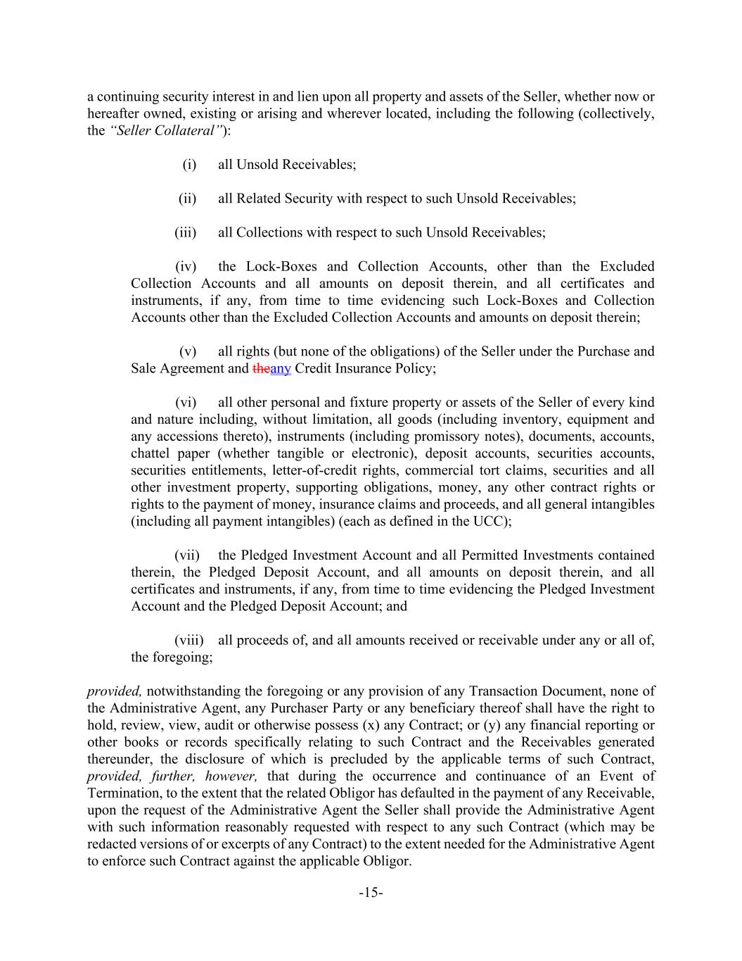 -15- a continuing security interest in and lien upon all property and assets of the Seller, whether now or hereafter owned, existing or arising and wherever located, including the following (collectively, the “Seller Collateral”): (i) all Unsold Receivables; (ii) all Related Security with respect to such Unsold Receivables; (iii) all Collections with respect to such Unsold Receivables; (iv) the Lock-Boxes and Collection Accounts, other than the Excluded Collection Accounts and all amounts on deposit therein, and all certificates and instruments, if any, from time to time evidencing such Lock-Boxes and Collection Accounts other than the Excluded Collection Accounts and amounts on deposit therein; (v) all rights (but none of the obligations) of the Seller under the Purchase and Sale Agreement and theany Credit Insurance Policy; (vi) all other personal and fixture property or assets of the Seller of every kind and nature including, without limitation, all goods (including inventory, equipment and any accessions thereto), instruments (including promissory notes), documents, accounts, chattel paper (whether tangible or electronic), deposit accounts, securities accounts, securities entitlements, letter-of-credit rights, commercial tort claims, securities and all other investment property, supporting obligations, money, any other contract rights or rights to the payment of money, insurance claims and proceeds, and all general intangibles (including all payment intangibles) (each as defined in the UCC); (vii) the Pledged Investment Account and all Permitted Investments contained therein, the Pledged Deposit Account, and all amounts on deposit therein, and all certificates and instruments, if any, from time to time evidencing the Pledged Investment Account and the Pledged Deposit Account; and (viii) all proceeds of, and all amounts received or receivable under any or all of, the foregoing; provided, notwithstanding the foregoing or any provision of any Transaction Document, none of the Administrative Agent, any Purchaser Party or any beneficiary thereof shall have the right to hold, review, view, audit or otherwise possess (x) any Contract; or (y) any financial reporting or other books or records specifically relating to such Contract and the Receivables generated thereunder, the disclosure of which is precluded by the applicable terms of such Contract, provided, further, however, that during the occurrence and continuance of an Event of Termination, to the extent that the related Obligor has defaulted in the payment of any Receivable, upon the request of the Administrative Agent the Seller shall provide the Administrative Agent with such information reasonably requested with respect to any such Contract (which may be redacted versions of or excerpts of any Contract) to the extent needed for the Administrative Agent to enforce such Contract against the applicable Obligor.