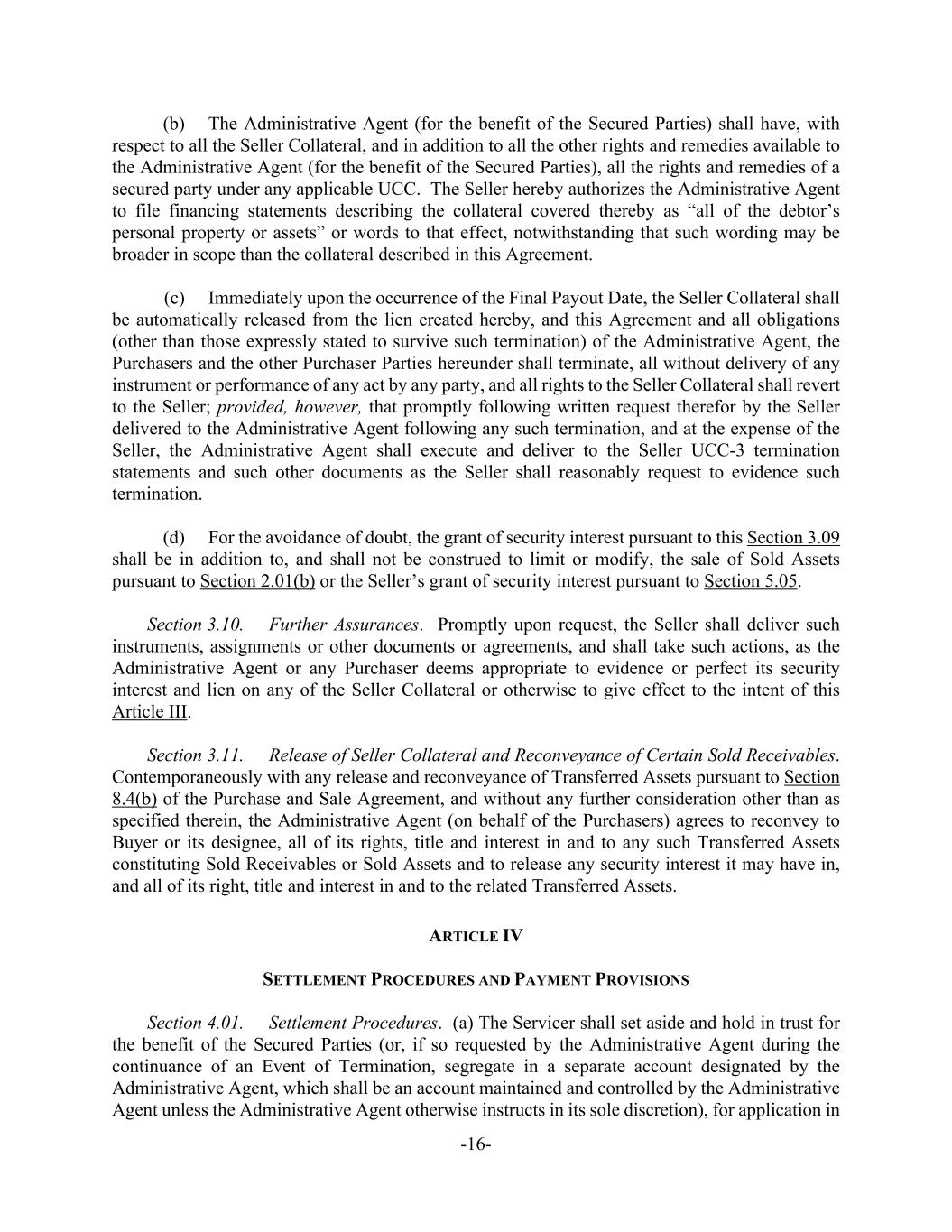 -16- (b) The Administrative Agent (for the benefit of the Secured Parties) shall have, with respect to all the Seller Collateral, and in addition to all the other rights and remedies available to the Administrative Agent (for the benefit of the Secured Parties), all the rights and remedies of a secured party under any applicable UCC. The Seller hereby authorizes the Administrative Agent to file financing statements describing the collateral covered thereby as “all of the debtor’s personal property or assets” or words to that effect, notwithstanding that such wording may be broader in scope than the collateral described in this Agreement. (c) Immediately upon the occurrence of the Final Payout Date, the Seller Collateral shall be automatically released from the lien created hereby, and this Agreement and all obligations (other than those expressly stated to survive such termination) of the Administrative Agent, the Purchasers and the other Purchaser Parties hereunder shall terminate, all without delivery of any instrument or performance of any act by any party, and all rights to the Seller Collateral shall revert to the Seller; provided, however, that promptly following written request therefor by the Seller delivered to the Administrative Agent following any such termination, and at the expense of the Seller, the Administrative Agent shall execute and deliver to the Seller UCC-3 termination statements and such other documents as the Seller shall reasonably request to evidence such termination. (d) For the avoidance of doubt, the grant of security interest pursuant to this Section 3.09 shall be in addition to, and shall not be construed to limit or modify, the sale of Sold Assets pursuant to Section 2.01(b) or the Seller’s grant of security interest pursuant to Section 5.05. Section 3.10. Further Assurances. Promptly upon request, the Seller shall deliver such instruments, assignments or other documents or agreements, and shall take such actions, as the Administrative Agent or any Purchaser deems appropriate to evidence or perfect its security interest and lien on any of the Seller Collateral or otherwise to give effect to the intent of this Article III. Section 3.11. Release of Seller Collateral and Reconveyance of Certain Sold Receivables. Contemporaneously with any release and reconveyance of Transferred Assets pursuant to Section 8.4(b) of the Purchase and Sale Agreement, and without any further consideration other than as specified therein, the Administrative Agent (on behalf of the Purchasers) agrees to reconvey to Buyer or its designee, all of its rights, title and interest in and to any such Transferred Assets constituting Sold Receivables or Sold Assets and to release any security interest it may have in, and all of its right, title and interest in and to the related Transferred Assets. ARTICLE IV SETTLEMENT PROCEDURES AND PAYMENT PROVISIONS Section 4.01. Settlement Procedures. (a) The Servicer shall set aside and hold in trust for the benefit of the Secured Parties (or, if so requested by the Administrative Agent during the continuance of an Event of Termination, segregate in a separate account designated by the Administrative Agent, which shall be an account maintained and controlled by the Administrative Agent unless the Administrative Agent otherwise instructs in its sole discretion), for application in