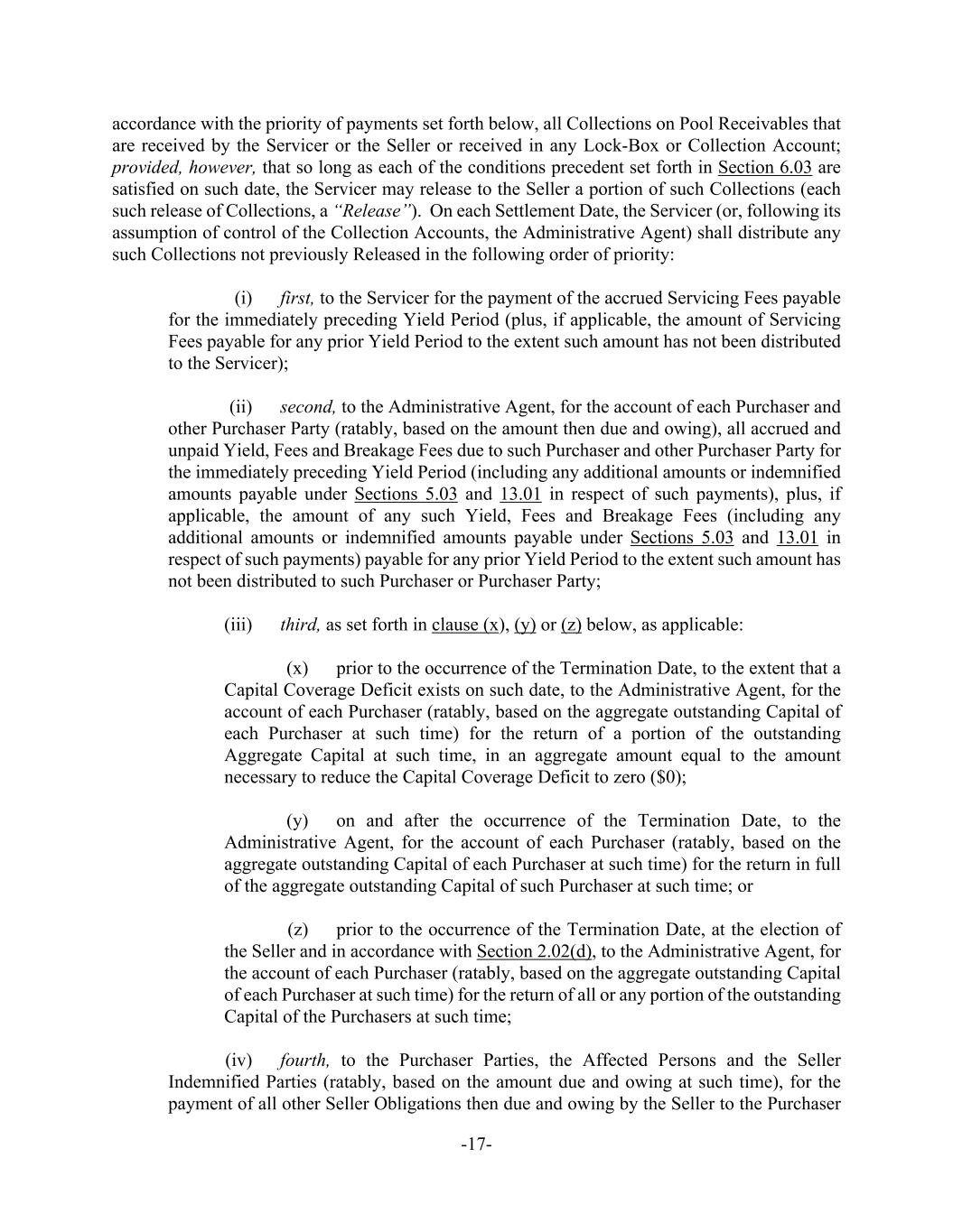 -17- accordance with the priority of payments set forth below, all Collections on Pool Receivables that are received by the Servicer or the Seller or received in any Lock-Box or Collection Account; provided, however, that so long as each of the conditions precedent set forth in Section 6.03 are satisfied on such date, the Servicer may release to the Seller a portion of such Collections (each such release of Collections, a “Release”). On each Settlement Date, the Servicer (or, following its assumption of control of the Collection Accounts, the Administrative Agent) shall distribute any such Collections not previously Released in the following order of priority: (i) first, to the Servicer for the payment of the accrued Servicing Fees payable for the immediately preceding Yield Period (plus, if applicable, the amount of Servicing Fees payable for any prior Yield Period to the extent such amount has not been distributed to the Servicer); (ii) second, to the Administrative Agent, for the account of each Purchaser and other Purchaser Party (ratably, based on the amount then due and owing), all accrued and unpaid Yield, Fees and Breakage Fees due to such Purchaser and other Purchaser Party for the immediately preceding Yield Period (including any additional amounts or indemnified amounts payable under Sections 5.03 and 13.01 in respect of such payments), plus, if applicable, the amount of any such Yield, Fees and Breakage Fees (including any additional amounts or indemnified amounts payable under Sections 5.03 and 13.01 in respect of such payments) payable for any prior Yield Period to the extent such amount has not been distributed to such Purchaser or Purchaser Party; (iii) third, as set forth in clause (x), (y) or (z) below, as applicable: (x) prior to the occurrence of the Termination Date, to the extent that a Capital Coverage Deficit exists on such date, to the Administrative Agent, for the account of each Purchaser (ratably, based on the aggregate outstanding Capital of each Purchaser at such time) for the return of a portion of the outstanding Aggregate Capital at such time, in an aggregate amount equal to the amount necessary to reduce the Capital Coverage Deficit to zero ($0); (y) on and after the occurrence of the Termination Date, to the Administrative Agent, for the account of each Purchaser (ratably, based on the aggregate outstanding Capital of each Purchaser at such time) for the return in full of the aggregate outstanding Capital of such Purchaser at such time; or (z) prior to the occurrence of the Termination Date, at the election of the Seller and in accordance with Section 2.02(d), to the Administrative Agent, for the account of each Purchaser (ratably, based on the aggregate outstanding Capital of each Purchaser at such time) for the return of all or any portion of the outstanding Capital of the Purchasers at such time; (iv) fourth, to the Purchaser Parties, the Affected Persons and the Seller Indemnified Parties (ratably, based on the amount due and owing at such time), for the payment of all other Seller Obligations then due and owing by the Seller to the Purchaser