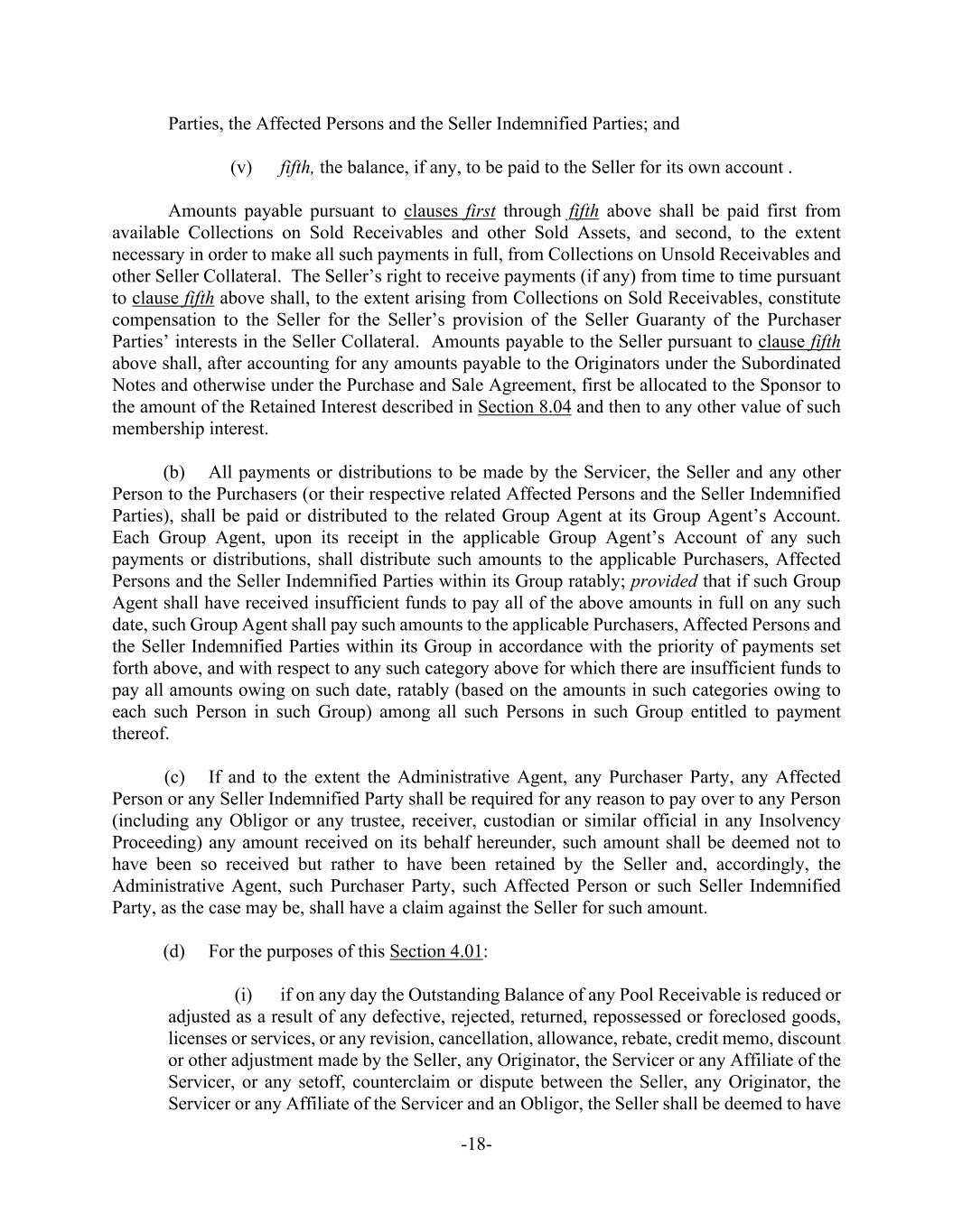 -18- Parties, the Affected Persons and the Seller Indemnified Parties; and (v) fifth, the balance, if any, to be paid to the Seller for its own account . Amounts payable pursuant to clauses first through fifth above shall be paid first from available Collections on Sold Receivables and other Sold Assets, and second, to the extent necessary in order to make all such payments in full, from Collections on Unsold Receivables and other Seller Collateral. The Seller’s right to receive payments (if any) from time to time pursuant to clause fifth above shall, to the extent arising from Collections on Sold Receivables, constitute compensation to the Seller for the Seller’s provision of the Seller Guaranty of the Purchaser Parties’ interests in the Seller Collateral. Amounts payable to the Seller pursuant to clause fifth above shall, after accounting for any amounts payable to the Originators under the Subordinated Notes and otherwise under the Purchase and Sale Agreement, first be allocated to the Sponsor to the amount of the Retained Interest described in Section 8.04 and then to any other value of such membership interest. (b) All payments or distributions to be made by the Servicer, the Seller and any other Person to the Purchasers (or their respective related Affected Persons and the Seller Indemnified Parties), shall be paid or distributed to the related Group Agent at its Group Agent’s Account. Each Group Agent, upon its receipt in the applicable Group Agent’s Account of any such payments or distributions, shall distribute such amounts to the applicable Purchasers, Affected Persons and the Seller Indemnified Parties within its Group ratably; provided that if such Group Agent shall have received insufficient funds to pay all of the above amounts in full on any such date, such Group Agent shall pay such amounts to the applicable Purchasers, Affected Persons and the Seller Indemnified Parties within its Group in accordance with the priority of payments set forth above, and with respect to any such category above for which there are insufficient funds to pay all amounts owing on such date, ratably (based on the amounts in such categories owing to each such Person in such Group) among all such Persons in such Group entitled to payment thereof. (c) If and to the extent the Administrative Agent, any Purchaser Party, any Affected Person or any Seller Indemnified Party shall be required for any reason to pay over to any Person (including any Obligor or any trustee, receiver, custodian or similar official in any Insolvency Proceeding) any amount received on its behalf hereunder, such amount shall be deemed not to have been so received but rather to have been retained by the Seller and, accordingly, the Administrative Agent, such Purchaser Party, such Affected Person or such Seller Indemnified Party, as the case may be, shall have a claim against the Seller for such amount. (d) For the purposes of this Section 4.01: (i) if on any day the Outstanding Balance of any Pool Receivable is reduced or adjusted as a result of any defective, rejected, returned, repossessed or foreclosed goods, licenses or services, or any revision, cancellation, allowance, rebate, credit memo, discount or other adjustment made by the Seller, any Originator, the Servicer or any Affiliate of the Servicer, or any setoff, counterclaim or dispute between the Seller, any Originator, the Servicer or any Affiliate of the Servicer and an Obligor, the Seller shall be deemed to have