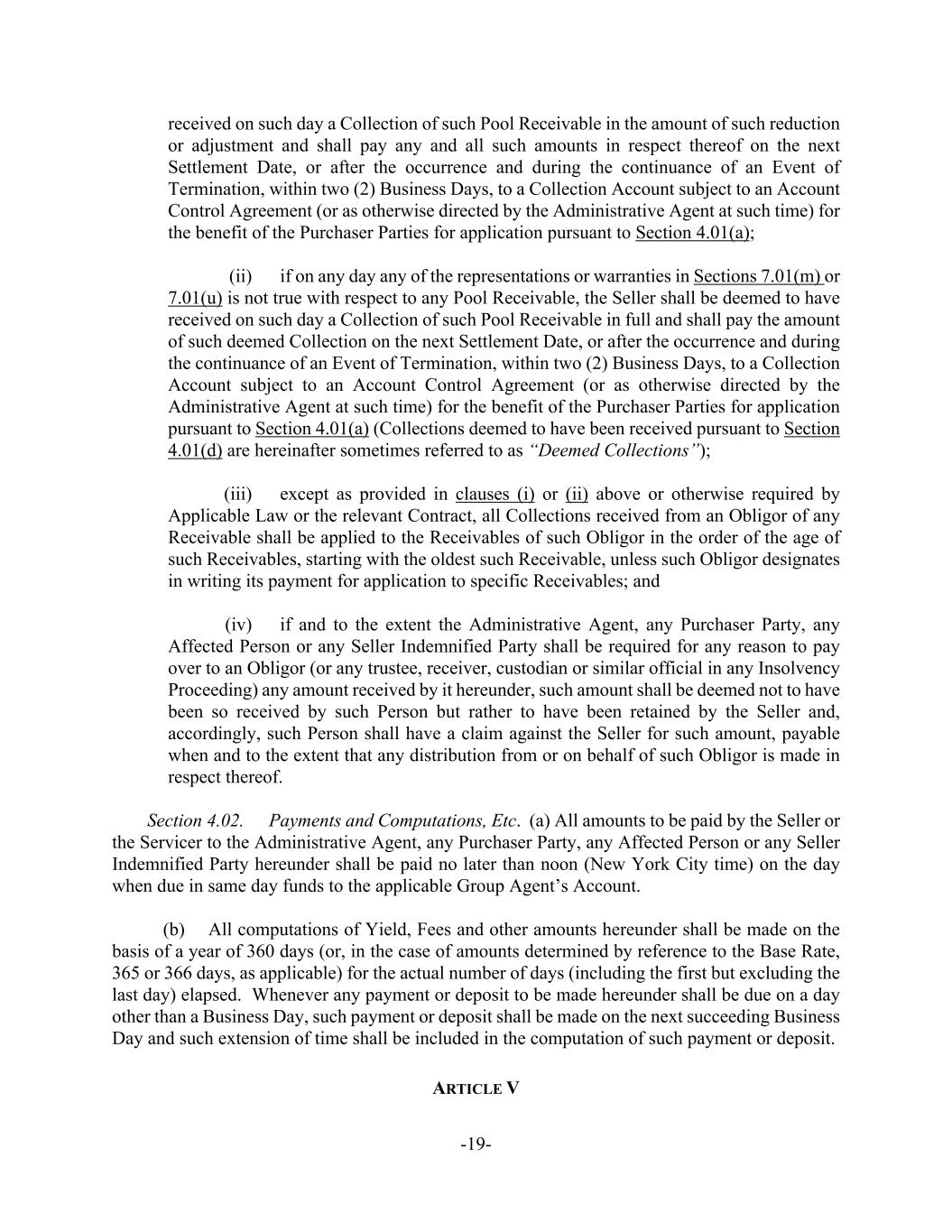 -19- received on such day a Collection of such Pool Receivable in the amount of such reduction or adjustment and shall pay any and all such amounts in respect thereof on the next Settlement Date, or after the occurrence and during the continuance of an Event of Termination, within two (2) Business Days, to a Collection Account subject to an Account Control Agreement (or as otherwise directed by the Administrative Agent at such time) for the benefit of the Purchaser Parties for application pursuant to Section 4.01(a); (ii) if on any day any of the representations or warranties in Sections 7.01(m) or 7.01(u) is not true with respect to any Pool Receivable, the Seller shall be deemed to have received on such day a Collection of such Pool Receivable in full and shall pay the amount of such deemed Collection on the next Settlement Date, or after the occurrence and during the continuance of an Event of Termination, within two (2) Business Days, to a Collection Account subject to an Account Control Agreement (or as otherwise directed by the Administrative Agent at such time) for the benefit of the Purchaser Parties for application pursuant to Section 4.01(a) (Collections deemed to have been received pursuant to Section 4.01(d) are hereinafter sometimes referred to as “Deemed Collections”); (iii) except as provided in clauses (i) or (ii) above or otherwise required by Applicable Law or the relevant Contract, all Collections received from an Obligor of any Receivable shall be applied to the Receivables of such Obligor in the order of the age of such Receivables, starting with the oldest such Receivable, unless such Obligor designates in writing its payment for application to specific Receivables; and (iv) if and to the extent the Administrative Agent, any Purchaser Party, any Affected Person or any Seller Indemnified Party shall be required for any reason to pay over to an Obligor (or any trustee, receiver, custodian or similar official in any Insolvency Proceeding) any amount received by it hereunder, such amount shall be deemed not to have been so received by such Person but rather to have been retained by the Seller and, accordingly, such Person shall have a claim against the Seller for such amount, payable when and to the extent that any distribution from or on behalf of such Obligor is made in respect thereof. Section 4.02. Payments and Computations, Etc. (a) All amounts to be paid by the Seller or the Servicer to the Administrative Agent, any Purchaser Party, any Affected Person or any Seller Indemnified Party hereunder shall be paid no later than noon (New York City time) on the day when due in same day funds to the applicable Group Agent’s Account. (b) All computations of Yield, Fees and other amounts hereunder shall be made on the basis of a year of 360 days (or, in the case of amounts determined by reference to the Base Rate, 365 or 366 days, as applicable) for the actual number of days (including the first but excluding the last day) elapsed. Whenever any payment or deposit to be made hereunder shall be due on a day other than a Business Day, such payment or deposit shall be made on the next succeeding Business Day and such extension of time shall be included in the computation of such payment or deposit. ARTICLE V