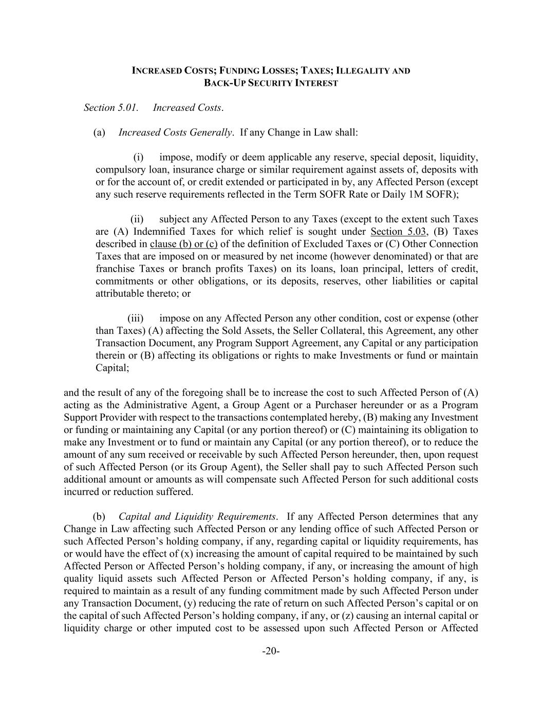 -20- INCREASED COSTS; FUNDING LOSSES; TAXES; ILLEGALITY AND BACK-UP SECURITY INTEREST Section 5.01. Increased Costs. (a) Increased Costs Generally. If any Change in Law shall: (i) impose, modify or deem applicable any reserve, special deposit, liquidity, compulsory loan, insurance charge or similar requirement against assets of, deposits with or for the account of, or credit extended or participated in by, any Affected Person (except any such reserve requirements reflected in the Term SOFR Rate or Daily 1M SOFR); (ii) subject any Affected Person to any Taxes (except to the extent such Taxes are (A) Indemnified Taxes for which relief is sought under Section 5.03, (B) Taxes described in clause (b) or (c) of the definition of Excluded Taxes or (C) Other Connection Taxes that are imposed on or measured by net income (however denominated) or that are franchise Taxes or branch profits Taxes) on its loans, loan principal, letters of credit, commitments or other obligations, or its deposits, reserves, other liabilities or capital attributable thereto; or (iii) impose on any Affected Person any other condition, cost or expense (other than Taxes) (A) affecting the Sold Assets, the Seller Collateral, this Agreement, any other Transaction Document, any Program Support Agreement, any Capital or any participation therein or (B) affecting its obligations or rights to make Investments or fund or maintain Capital; and the result of any of the foregoing shall be to increase the cost to such Affected Person of (A) acting as the Administrative Agent, a Group Agent or a Purchaser hereunder or as a Program Support Provider with respect to the transactions contemplated hereby, (B) making any Investment or funding or maintaining any Capital (or any portion thereof) or (C) maintaining its obligation to make any Investment or to fund or maintain any Capital (or any portion thereof), or to reduce the amount of any sum received or receivable by such Affected Person hereunder, then, upon request of such Affected Person (or its Group Agent), the Seller shall pay to such Affected Person such additional amount or amounts as will compensate such Affected Person for such additional costs incurred or reduction suffered. (b) Capital and Liquidity Requirements. If any Affected Person determines that any Change in Law affecting such Affected Person or any lending office of such Affected Person or such Affected Person’s holding company, if any, regarding capital or liquidity requirements, has or would have the effect of (x) increasing the amount of capital required to be maintained by such Affected Person or Affected Person’s holding company, if any, or increasing the amount of high quality liquid assets such Affected Person or Affected Person’s holding company, if any, is required to maintain as a result of any funding commitment made by such Affected Person under any Transaction Document, (y) reducing the rate of return on such Affected Person’s capital or on the capital of such Affected Person’s holding company, if any, or (z) causing an internal capital or liquidity charge or other imputed cost to be assessed upon such Affected Person or Affected