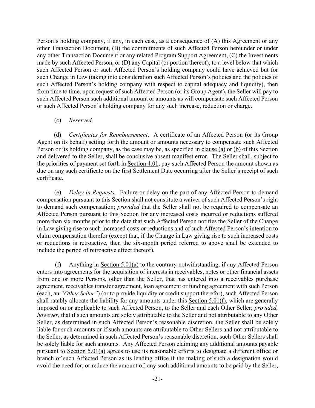 -21- Person’s holding company, if any, in each case, as a consequence of (A) this Agreement or any other Transaction Document, (B) the commitments of such Affected Person hereunder or under any other Transaction Document or any related Program Support Agreement, (C) the Investments made by such Affected Person, or (D) any Capital (or portion thereof), to a level below that which such Affected Person or such Affected Person’s holding company could have achieved but for such Change in Law (taking into consideration such Affected Person’s policies and the policies of such Affected Person’s holding company with respect to capital adequacy and liquidity), then from time to time, upon request of such Affected Person (or its Group Agent), the Seller will pay to such Affected Person such additional amount or amounts as will compensate such Affected Person or such Affected Person’s holding company for any such increase, reduction or charge. (c) Reserved. (d) Certificates for Reimbursement. A certificate of an Affected Person (or its Group Agent on its behalf) setting forth the amount or amounts necessary to compensate such Affected Person or its holding company, as the case may be, as specified in clause (a) or (b) of this Section and delivered to the Seller, shall be conclusive absent manifest error. The Seller shall, subject to the priorities of payment set forth in Section 4.01, pay such Affected Person the amount shown as due on any such certificate on the first Settlement Date occurring after the Seller’s receipt of such certificate. (e) Delay in Requests. Failure or delay on the part of any Affected Person to demand compensation pursuant to this Section shall not constitute a waiver of such Affected Person’s right to demand such compensation; provided that the Seller shall not be required to compensate an Affected Person pursuant to this Section for any increased costs incurred or reductions suffered more than six months prior to the date that such Affected Person notifies the Seller of the Change in Law giving rise to such increased costs or reductions and of such Affected Person’s intention to claim compensation therefor (except that, if the Change in Law giving rise to such increased costs or reductions is retroactive, then the six-month period referred to above shall be extended to include the period of retroactive effect thereof). (f) Anything in Section 5.01(a) to the contrary notwithstanding, if any Affected Person enters into agreements for the acquisition of interests in receivables, notes or other financial assets from one or more Persons, other than the Seller, that has entered into a receivables purchase agreement, receivables transfer agreement, loan agreement or funding agreement with such Person (each, an “Other Seller”) (or to provide liquidity or credit support therefor), such Affected Person shall ratably allocate the liability for any amounts under this Section 5.01(f), which are generally imposed on or applicable to such Affected Person, to the Seller and each Other Seller; provided, however, that if such amounts are solely attributable to the Seller and not attributable to any Other Seller, as determined in such Affected Person’s reasonable discretion, the Seller shall be solely liable for such amounts or if such amounts are attributable to Other Sellers and not attributable to the Seller, as determined in such Affected Person’s reasonable discretion, such Other Sellers shall be solely liable for such amounts. Any Affected Person claiming any additional amounts payable pursuant to Section 5.01(a) agrees to use its reasonable efforts to designate a different office or branch of such Affected Person as its lending office if the making of such a designation would avoid the need for, or reduce the amount of, any such additional amounts to be paid by the Seller,