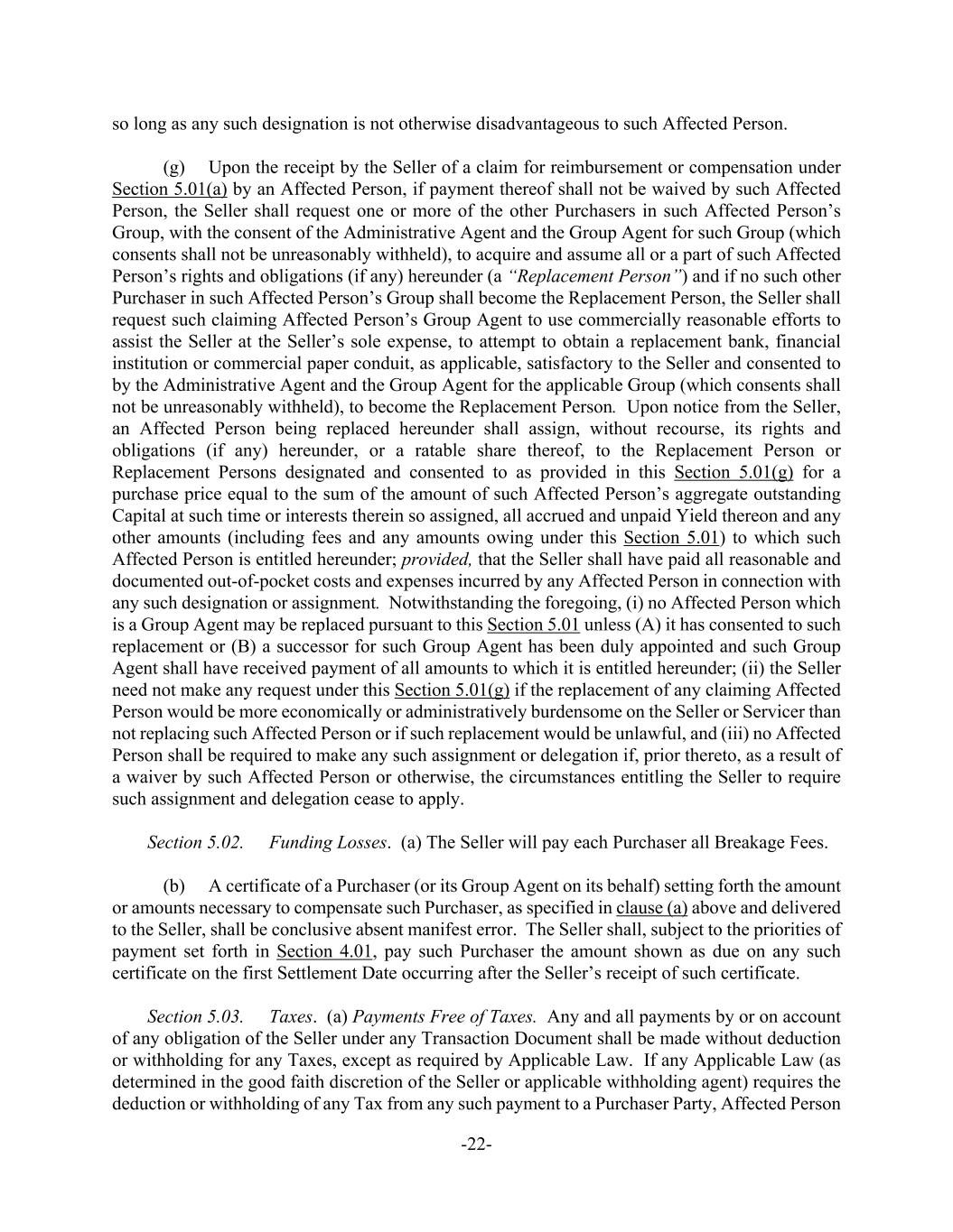 -22- so long as any such designation is not otherwise disadvantageous to such Affected Person. (g) Upon the receipt by the Seller of a claim for reimbursement or compensation under Section 5.01(a) by an Affected Person, if payment thereof shall not be waived by such Affected Person, the Seller shall request one or more of the other Purchasers in such Affected Person’s Group, with the consent of the Administrative Agent and the Group Agent for such Group (which consents shall not be unreasonably withheld), to acquire and assume all or a part of such Affected Person’s rights and obligations (if any) hereunder (a “Replacement Person”) and if no such other Purchaser in such Affected Person’s Group shall become the Replacement Person, the Seller shall request such claiming Affected Person’s Group Agent to use commercially reasonable efforts to assist the Seller at the Seller’s sole expense, to attempt to obtain a replacement bank, financial institution or commercial paper conduit, as applicable, satisfactory to the Seller and consented to by the Administrative Agent and the Group Agent for the applicable Group (which consents shall not be unreasonably withheld), to become the Replacement Person. Upon notice from the Seller, an Affected Person being replaced hereunder shall assign, without recourse, its rights and obligations (if any) hereunder, or a ratable share thereof, to the Replacement Person or Replacement Persons designated and consented to as provided in this Section 5.01(g) for a purchase price equal to the sum of the amount of such Affected Person’s aggregate outstanding Capital at such time or interests therein so assigned, all accrued and unpaid Yield thereon and any other amounts (including fees and any amounts owing under this Section 5.01) to which such Affected Person is entitled hereunder; provided, that the Seller shall have paid all reasonable and documented out-of-pocket costs and expenses incurred by any Affected Person in connection with any such designation or assignment. Notwithstanding the foregoing, (i) no Affected Person which is a Group Agent may be replaced pursuant to this Section 5.01 unless (A) it has consented to such replacement or (B) a successor for such Group Agent has been duly appointed and such Group Agent shall have received payment of all amounts to which it is entitled hereunder; (ii) the Seller need not make any request under this Section 5.01(g) if the replacement of any claiming Affected Person would be more economically or administratively burdensome on the Seller or Servicer than not replacing such Affected Person or if such replacement would be unlawful, and (iii) no Affected Person shall be required to make any such assignment or delegation if, prior thereto, as a result of a waiver by such Affected Person or otherwise, the circumstances entitling the Seller to require such assignment and delegation cease to apply. Section 5.02. Funding Losses. (a) The Seller will pay each Purchaser all Breakage Fees. (b) A certificate of a Purchaser (or its Group Agent on its behalf) setting forth the amount or amounts necessary to compensate such Purchaser, as specified in clause (a) above and delivered to the Seller, shall be conclusive absent manifest error. The Seller shall, subject to the priorities of payment set forth in Section 4.01, pay such Purchaser the amount shown as due on any such certificate on the first Settlement Date occurring after the Seller’s receipt of such certificate. Section 5.03. Taxes. (a) Payments Free of Taxes. Any and all payments by or on account of any obligation of the Seller under any Transaction Document shall be made without deduction or withholding for any Taxes, except as required by Applicable Law. If any Applicable Law (as determined in the good faith discretion of the Seller or applicable withholding agent) requires the deduction or withholding of any Tax from any such payment to a Purchaser Party, Affected Person