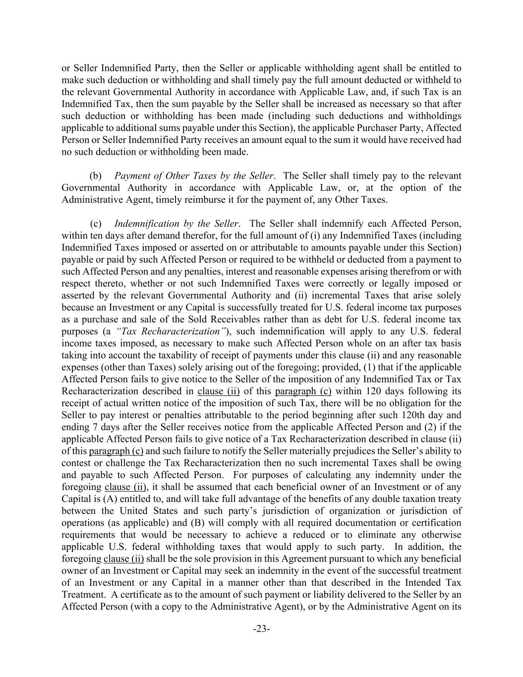 -23- or Seller Indemnified Party, then the Seller or applicable withholding agent shall be entitled to make such deduction or withholding and shall timely pay the full amount deducted or withheld to the relevant Governmental Authority in accordance with Applicable Law, and, if such Tax is an Indemnified Tax, then the sum payable by the Seller shall be increased as necessary so that after such deduction or withholding has been made (including such deductions and withholdings applicable to additional sums payable under this Section), the applicable Purchaser Party, Affected Person or Seller Indemnified Party receives an amount equal to the sum it would have received had no such deduction or withholding been made. (b) Payment of Other Taxes by the Seller. The Seller shall timely pay to the relevant Governmental Authority in accordance with Applicable Law, or, at the option of the Administrative Agent, timely reimburse it for the payment of, any Other Taxes. (c) Indemnification by the Seller. The Seller shall indemnify each Affected Person, within ten days after demand therefor, for the full amount of (i) any Indemnified Taxes (including Indemnified Taxes imposed or asserted on or attributable to amounts payable under this Section) payable or paid by such Affected Person or required to be withheld or deducted from a payment to such Affected Person and any penalties, interest and reasonable expenses arising therefrom or with respect thereto, whether or not such Indemnified Taxes were correctly or legally imposed or asserted by the relevant Governmental Authority and (ii) incremental Taxes that arise solely because an Investment or any Capital is successfully treated for U.S. federal income tax purposes as a purchase and sale of the Sold Receivables rather than as debt for U.S. federal income tax purposes (a “Tax Recharacterization”), such indemnification will apply to any U.S. federal income taxes imposed, as necessary to make such Affected Person whole on an after tax basis taking into account the taxability of receipt of payments under this clause (ii) and any reasonable expenses (other than Taxes) solely arising out of the foregoing; provided, (1) that if the applicable Affected Person fails to give notice to the Seller of the imposition of any Indemnified Tax or Tax Recharacterization described in clause (ii) of this paragraph (c) within 120 days following its receipt of actual written notice of the imposition of such Tax, there will be no obligation for the Seller to pay interest or penalties attributable to the period beginning after such 120th day and ending 7 days after the Seller receives notice from the applicable Affected Person and (2) if the applicable Affected Person fails to give notice of a Tax Recharacterization described in clause (ii) of this paragraph (c) and such failure to notify the Seller materially prejudices the Seller’s ability to contest or challenge the Tax Recharacterization then no such incremental Taxes shall be owing and payable to such Affected Person. For purposes of calculating any indemnity under the foregoing clause (ii), it shall be assumed that each beneficial owner of an Investment or of any Capital is (A) entitled to, and will take full advantage of the benefits of any double taxation treaty between the United States and such party’s jurisdiction of organization or jurisdiction of operations (as applicable) and (B) will comply with all required documentation or certification requirements that would be necessary to achieve a reduced or to eliminate any otherwise applicable U.S. federal withholding taxes that would apply to such party. In addition, the foregoing clause (ii) shall be the sole provision in this Agreement pursuant to which any beneficial owner of an Investment or Capital may seek an indemnity in the event of the successful treatment of an Investment or any Capital in a manner other than that described in the Intended Tax Treatment. A certificate as to the amount of such payment or liability delivered to the Seller by an Affected Person (with a copy to the Administrative Agent), or by the Administrative Agent on its