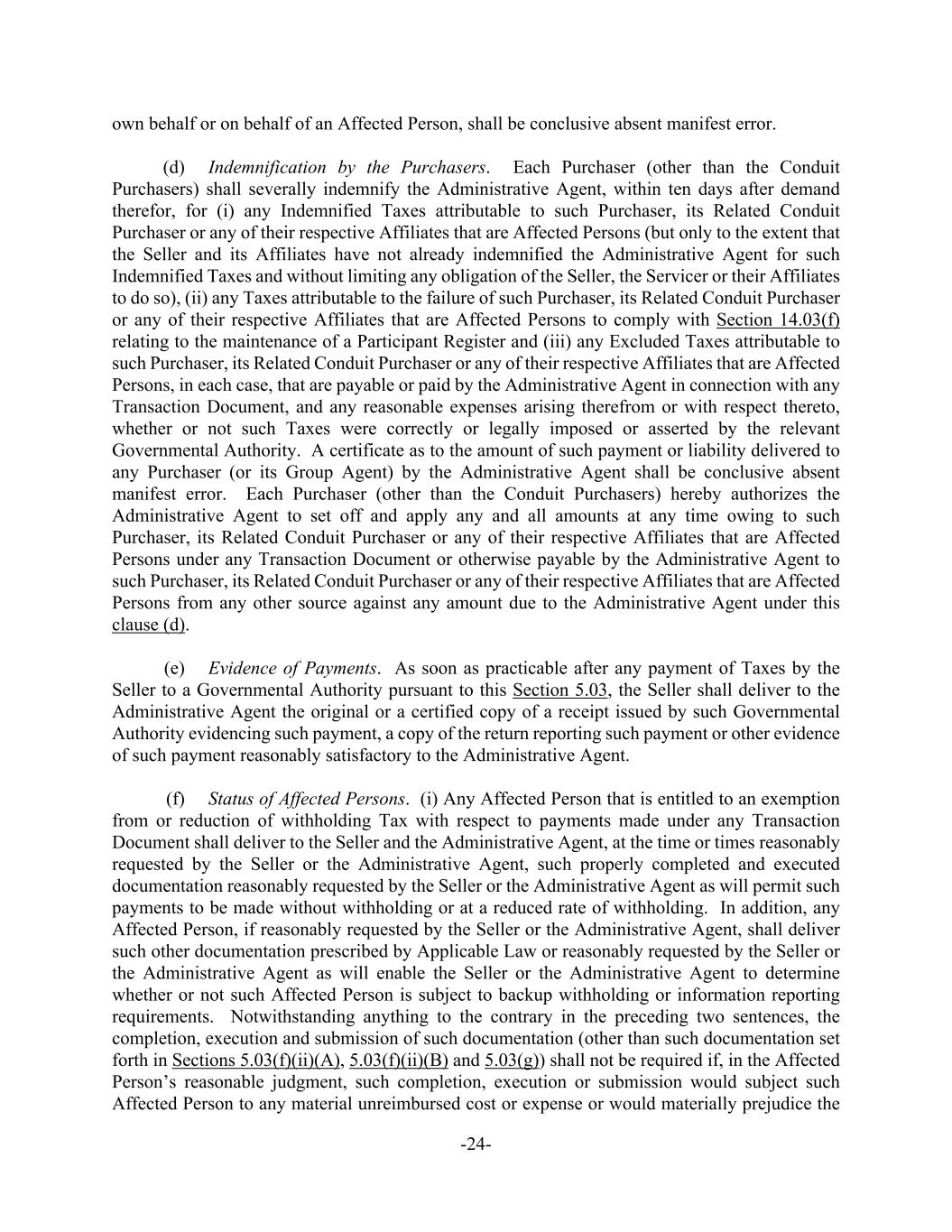 -24- own behalf or on behalf of an Affected Person, shall be conclusive absent manifest error. (d) Indemnification by the Purchasers. Each Purchaser (other than the Conduit Purchasers) shall severally indemnify the Administrative Agent, within ten days after demand therefor, for (i) any Indemnified Taxes attributable to such Purchaser, its Related Conduit Purchaser or any of their respective Affiliates that are Affected Persons (but only to the extent that the Seller and its Affiliates have not already indemnified the Administrative Agent for such Indemnified Taxes and without limiting any obligation of the Seller, the Servicer or their Affiliates to do so), (ii) any Taxes attributable to the failure of such Purchaser, its Related Conduit Purchaser or any of their respective Affiliates that are Affected Persons to comply with Section 14.03(f) relating to the maintenance of a Participant Register and (iii) any Excluded Taxes attributable to such Purchaser, its Related Conduit Purchaser or any of their respective Affiliates that are Affected Persons, in each case, that are payable or paid by the Administrative Agent in connection with any Transaction Document, and any reasonable expenses arising therefrom or with respect thereto, whether or not such Taxes were correctly or legally imposed or asserted by the relevant Governmental Authority. A certificate as to the amount of such payment or liability delivered to any Purchaser (or its Group Agent) by the Administrative Agent shall be conclusive absent manifest error. Each Purchaser (other than the Conduit Purchasers) hereby authorizes the Administrative Agent to set off and apply any and all amounts at any time owing to such Purchaser, its Related Conduit Purchaser or any of their respective Affiliates that are Affected Persons under any Transaction Document or otherwise payable by the Administrative Agent to such Purchaser, its Related Conduit Purchaser or any of their respective Affiliates that are Affected Persons from any other source against any amount due to the Administrative Agent under this clause (d). (e) Evidence of Payments. As soon as practicable after any payment of Taxes by the Seller to a Governmental Authority pursuant to this Section 5.03, the Seller shall deliver to the Administrative Agent the original or a certified copy of a receipt issued by such Governmental Authority evidencing such payment, a copy of the return reporting such payment or other evidence of such payment reasonably satisfactory to the Administrative Agent. (f) Status of Affected Persons. (i) Any Affected Person that is entitled to an exemption from or reduction of withholding Tax with respect to payments made under any Transaction Document shall deliver to the Seller and the Administrative Agent, at the time or times reasonably requested by the Seller or the Administrative Agent, such properly completed and executed documentation reasonably requested by the Seller or the Administrative Agent as will permit such payments to be made without withholding or at a reduced rate of withholding. In addition, any Affected Person, if reasonably requested by the Seller or the Administrative Agent, shall deliver such other documentation prescribed by Applicable Law or reasonably requested by the Seller or the Administrative Agent as will enable the Seller or the Administrative Agent to determine whether or not such Affected Person is subject to backup withholding or information reporting requirements. Notwithstanding anything to the contrary in the preceding two sentences, the completion, execution and submission of such documentation (other than such documentation set forth in Sections 5.03(f)(ii)(A), 5.03(f)(ii)(B) and 5.03(g)) shall not be required if, in the Affected Person’s reasonable judgment, such completion, execution or submission would subject such Affected Person to any material unreimbursed cost or expense or would materially prejudice the