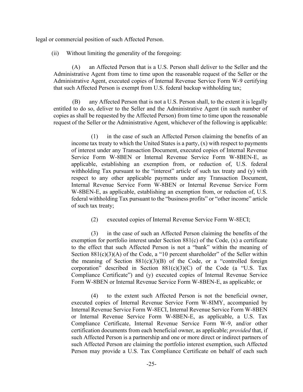 -25- legal or commercial position of such Affected Person. (ii) Without limiting the generality of the foregoing: (A) an Affected Person that is a U.S. Person shall deliver to the Seller and the Administrative Agent from time to time upon the reasonable request of the Seller or the Administrative Agent, executed copies of Internal Revenue Service Form W-9 certifying that such Affected Person is exempt from U.S. federal backup withholding tax; (B) any Affected Person that is not a U.S. Person shall, to the extent it is legally entitled to do so, deliver to the Seller and the Administrative Agent (in such number of copies as shall be requested by the Affected Person) from time to time upon the reasonable request of the Seller or the Administrative Agent, whichever of the following is applicable: (1) in the case of such an Affected Person claiming the benefits of an income tax treaty to which the United States is a party, (x) with respect to payments of interest under any Transaction Document, executed copies of Internal Revenue Service Form W-8BEN or Internal Revenue Service Form W-8BEN-E, as applicable, establishing an exemption from, or reduction of, U.S. federal withholding Tax pursuant to the “interest” article of such tax treaty and (y) with respect to any other applicable payments under any Transaction Document, Internal Revenue Service Form W-8BEN or Internal Revenue Service Form W-8BEN-E, as applicable, establishing an exemption from, or reduction of, U.S. federal withholding Tax pursuant to the “business profits” or “other income” article of such tax treaty; (2) executed copies of Internal Revenue Service Form W-8ECI; (3) in the case of such an Affected Person claiming the benefits of the exemption for portfolio interest under Section 881(c) of the Code, (x) a certificate to the effect that such Affected Person is not a “bank” within the meaning of Section 881(c)(3)(A) of the Code, a “10 percent shareholder” of the Seller within the meaning of Section 881(c)(3)(B) of the Code, or a “controlled foreign corporation” described in Section 881(c)(3)(C) of the Code (a “U.S. Tax Compliance Certificate”) and (y) executed copies of Internal Revenue Service Form W-8BEN or Internal Revenue Service Form W-8BEN-E, as applicable; or (4) to the extent such Affected Person is not the beneficial owner, executed copies of Internal Revenue Service Form W-8IMY, accompanied by Internal Revenue Service Form W-8ECI, Internal Revenue Service Form W-8BEN or Internal Revenue Service Form W-8BEN-E, as applicable, a U.S. Tax Compliance Certificate, Internal Revenue Service Form W-9, and/or other certification documents from each beneficial owner, as applicable; provided that, if such Affected Person is a partnership and one or more direct or indirect partners of such Affected Person are claiming the portfolio interest exemption, such Affected Person may provide a U.S. Tax Compliance Certificate on behalf of each such