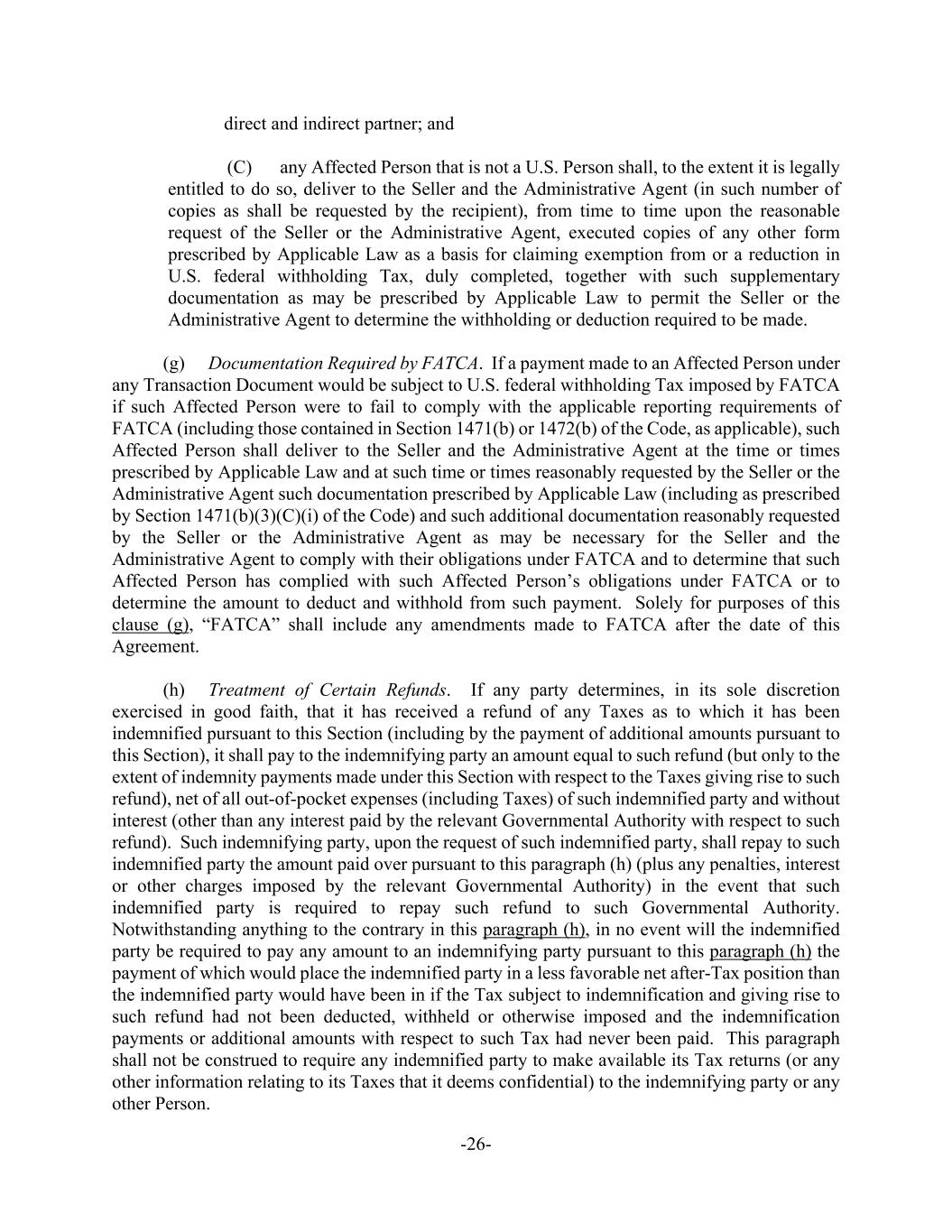 -26- direct and indirect partner; and (C) any Affected Person that is not a U.S. Person shall, to the extent it is legally entitled to do so, deliver to the Seller and the Administrative Agent (in such number of copies as shall be requested by the recipient), from time to time upon the reasonable request of the Seller or the Administrative Agent, executed copies of any other form prescribed by Applicable Law as a basis for claiming exemption from or a reduction in U.S. federal withholding Tax, duly completed, together with such supplementary documentation as may be prescribed by Applicable Law to permit the Seller or the Administrative Agent to determine the withholding or deduction required to be made. (g) Documentation Required by FATCA. If a payment made to an Affected Person under any Transaction Document would be subject to U.S. federal withholding Tax imposed by FATCA if such Affected Person were to fail to comply with the applicable reporting requirements of FATCA (including those contained in Section 1471(b) or 1472(b) of the Code, as applicable), such Affected Person shall deliver to the Seller and the Administrative Agent at the time or times prescribed by Applicable Law and at such time or times reasonably requested by the Seller or the Administrative Agent such documentation prescribed by Applicable Law (including as prescribed by Section 1471(b)(3)(C)(i) of the Code) and such additional documentation reasonably requested by the Seller or the Administrative Agent as may be necessary for the Seller and the Administrative Agent to comply with their obligations under FATCA and to determine that such Affected Person has complied with such Affected Person’s obligations under FATCA or to determine the amount to deduct and withhold from such payment. Solely for purposes of this clause (g), “FATCA” shall include any amendments made to FATCA after the date of this Agreement. (h) Treatment of Certain Refunds. If any party determines, in its sole discretion exercised in good faith, that it has received a refund of any Taxes as to which it has been indemnified pursuant to this Section (including by the payment of additional amounts pursuant to this Section), it shall pay to the indemnifying party an amount equal to such refund (but only to the extent of indemnity payments made under this Section with respect to the Taxes giving rise to such refund), net of all out-of-pocket expenses (including Taxes) of such indemnified party and without interest (other than any interest paid by the relevant Governmental Authority with respect to such refund). Such indemnifying party, upon the request of such indemnified party, shall repay to such indemnified party the amount paid over pursuant to this paragraph (h) (plus any penalties, interest or other charges imposed by the relevant Governmental Authority) in the event that such indemnified party is required to repay such refund to such Governmental Authority. Notwithstanding anything to the contrary in this paragraph (h), in no event will the indemnified party be required to pay any amount to an indemnifying party pursuant to this paragraph (h) the payment of which would place the indemnified party in a less favorable net after-Tax position than the indemnified party would have been in if the Tax subject to indemnification and giving rise to such refund had not been deducted, withheld or otherwise imposed and the indemnification payments or additional amounts with respect to such Tax had never been paid. This paragraph shall not be construed to require any indemnified party to make available its Tax returns (or any other information relating to its Taxes that it deems confidential) to the indemnifying party or any other Person.