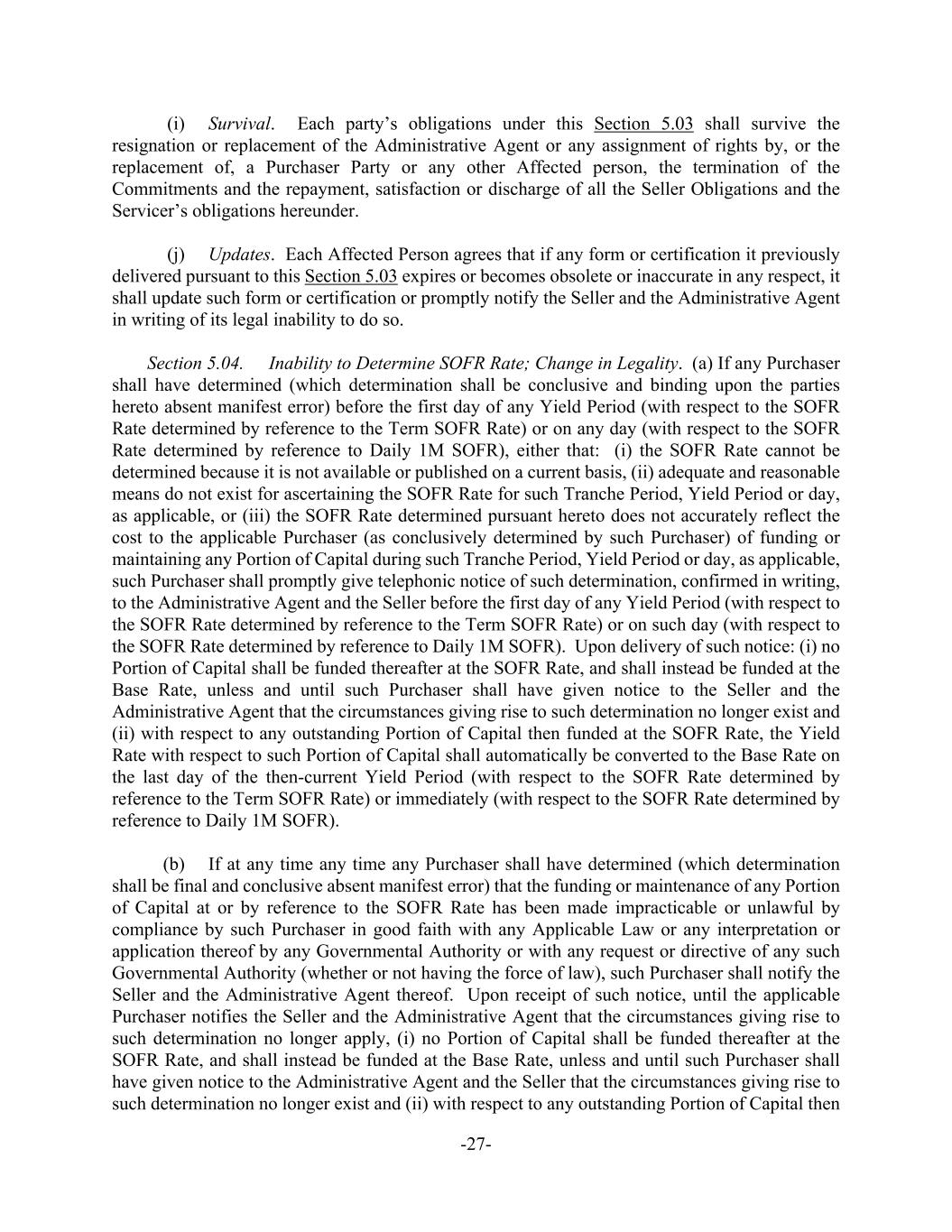 -27- (i) Survival. Each party’s obligations under this Section 5.03 shall survive the resignation or replacement of the Administrative Agent or any assignment of rights by, or the replacement of, a Purchaser Party or any other Affected person, the termination of the Commitments and the repayment, satisfaction or discharge of all the Seller Obligations and the Servicer’s obligations hereunder. (j) Updates. Each Affected Person agrees that if any form or certification it previously delivered pursuant to this Section 5.03 expires or becomes obsolete or inaccurate in any respect, it shall update such form or certification or promptly notify the Seller and the Administrative Agent in writing of its legal inability to do so. Section 5.04. Inability to Determine SOFR Rate; Change in Legality. (a) If any Purchaser shall have determined (which determination shall be conclusive and binding upon the parties hereto absent manifest error) before the first day of any Yield Period (with respect to the SOFR Rate determined by reference to the Term SOFR Rate) or on any day (with respect to the SOFR Rate determined by reference to Daily 1M SOFR), either that: (i) the SOFR Rate cannot be determined because it is not available or published on a current basis, (ii) adequate and reasonable means do not exist for ascertaining the SOFR Rate for such Tranche Period, Yield Period or day, as applicable, or (iii) the SOFR Rate determined pursuant hereto does not accurately reflect the cost to the applicable Purchaser (as conclusively determined by such Purchaser) of funding or maintaining any Portion of Capital during such Tranche Period, Yield Period or day, as applicable, such Purchaser shall promptly give telephonic notice of such determination, confirmed in writing, to the Administrative Agent and the Seller before the first day of any Yield Period (with respect to the SOFR Rate determined by reference to the Term SOFR Rate) or on such day (with respect to the SOFR Rate determined by reference to Daily 1M SOFR). Upon delivery of such notice: (i) no Portion of Capital shall be funded thereafter at the SOFR Rate, and shall instead be funded at the Base Rate, unless and until such Purchaser shall have given notice to the Seller and the Administrative Agent that the circumstances giving rise to such determination no longer exist and (ii) with respect to any outstanding Portion of Capital then funded at the SOFR Rate, the Yield Rate with respect to such Portion of Capital shall automatically be converted to the Base Rate on the last day of the then-current Yield Period (with respect to the SOFR Rate determined by reference to the Term SOFR Rate) or immediately (with respect to the SOFR Rate determined by reference to Daily 1M SOFR). (b) If at any time any time any Purchaser shall have determined (which determination shall be final and conclusive absent manifest error) that the funding or maintenance of any Portion of Capital at or by reference to the SOFR Rate has been made impracticable or unlawful by compliance by such Purchaser in good faith with any Applicable Law or any interpretation or application thereof by any Governmental Authority or with any request or directive of any such Governmental Authority (whether or not having the force of law), such Purchaser shall notify the Seller and the Administrative Agent thereof. Upon receipt of such notice, until the applicable Purchaser notifies the Seller and the Administrative Agent that the circumstances giving rise to such determination no longer apply, (i) no Portion of Capital shall be funded thereafter at the SOFR Rate, and shall instead be funded at the Base Rate, unless and until such Purchaser shall have given notice to the Administrative Agent and the Seller that the circumstances giving rise to such determination no longer exist and (ii) with respect to any outstanding Portion of Capital then