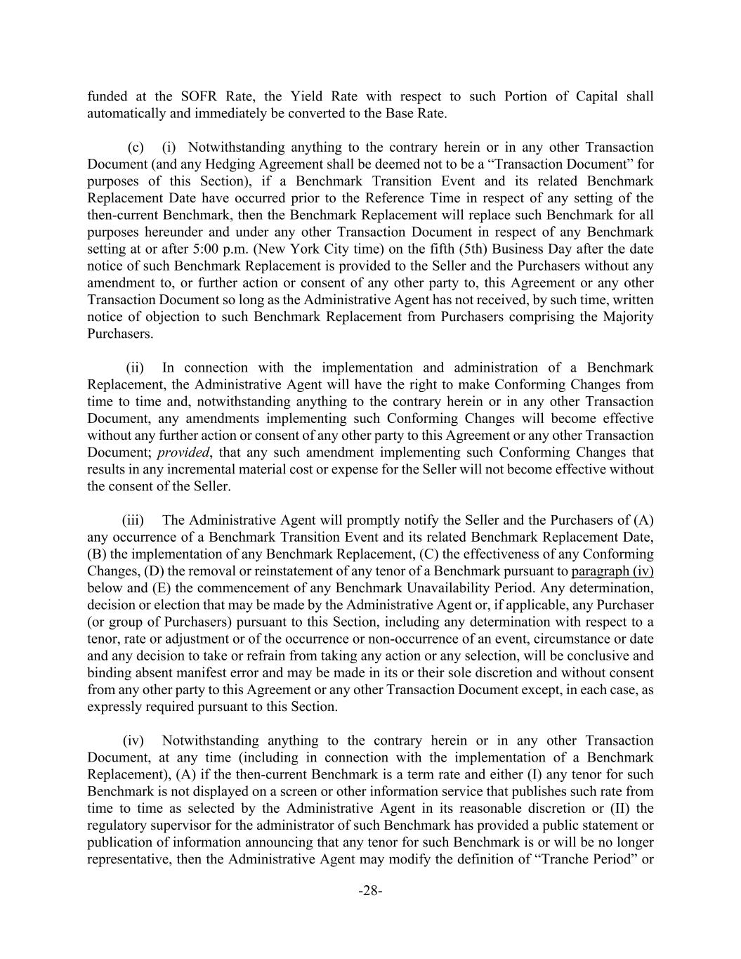 -28- funded at the SOFR Rate, the Yield Rate with respect to such Portion of Capital shall automatically and immediately be converted to the Base Rate. (c) (i) Notwithstanding anything to the contrary herein or in any other Transaction Document (and any Hedging Agreement shall be deemed not to be a “Transaction Document” for purposes of this Section), if a Benchmark Transition Event and its related Benchmark Replacement Date have occurred prior to the Reference Time in respect of any setting of the then-current Benchmark, then the Benchmark Replacement will replace such Benchmark for all purposes hereunder and under any other Transaction Document in respect of any Benchmark setting at or after 5:00 p.m. (New York City time) on the fifth (5th) Business Day after the date notice of such Benchmark Replacement is provided to the Seller and the Purchasers without any amendment to, or further action or consent of any other party to, this Agreement or any other Transaction Document so long as the Administrative Agent has not received, by such time, written notice of objection to such Benchmark Replacement from Purchasers comprising the Majority Purchasers. (ii) In connection with the implementation and administration of a Benchmark Replacement, the Administrative Agent will have the right to make Conforming Changes from time to time and, notwithstanding anything to the contrary herein or in any other Transaction Document, any amendments implementing such Conforming Changes will become effective without any further action or consent of any other party to this Agreement or any other Transaction Document; provided, that any such amendment implementing such Conforming Changes that results in any incremental material cost or expense for the Seller will not become effective without the consent of the Seller. (iii) The Administrative Agent will promptly notify the Seller and the Purchasers of (A) any occurrence of a Benchmark Transition Event and its related Benchmark Replacement Date, (B) the implementation of any Benchmark Replacement, (C) the effectiveness of any Conforming Changes, (D) the removal or reinstatement of any tenor of a Benchmark pursuant to paragraph (iv) below and (E) the commencement of any Benchmark Unavailability Period. Any determination, decision or election that may be made by the Administrative Agent or, if applicable, any Purchaser (or group of Purchasers) pursuant to this Section, including any determination with respect to a tenor, rate or adjustment or of the occurrence or non-occurrence of an event, circumstance or date and any decision to take or refrain from taking any action or any selection, will be conclusive and binding absent manifest error and may be made in its or their sole discretion and without consent from any other party to this Agreement or any other Transaction Document except, in each case, as expressly required pursuant to this Section. (iv) Notwithstanding anything to the contrary herein or in any other Transaction Document, at any time (including in connection with the implementation of a Benchmark Replacement), (A) if the then-current Benchmark is a term rate and either (I) any tenor for such Benchmark is not displayed on a screen or other information service that publishes such rate from time to time as selected by the Administrative Agent in its reasonable discretion or (II) the regulatory supervisor for the administrator of such Benchmark has provided a public statement or publication of information announcing that any tenor for such Benchmark is or will be no longer representative, then the Administrative Agent may modify the definition of “Tranche Period” or