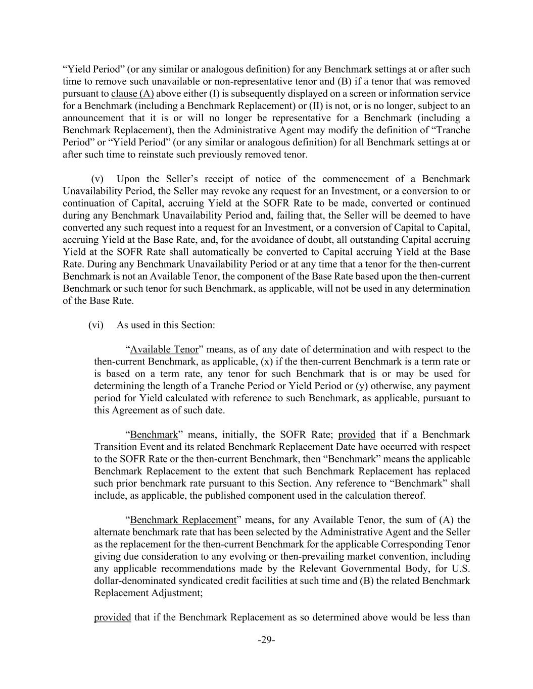 -29- “Yield Period” (or any similar or analogous definition) for any Benchmark settings at or after such time to remove such unavailable or non-representative tenor and (B) if a tenor that was removed pursuant to clause (A) above either (I) is subsequently displayed on a screen or information service for a Benchmark (including a Benchmark Replacement) or (II) is not, or is no longer, subject to an announcement that it is or will no longer be representative for a Benchmark (including a Benchmark Replacement), then the Administrative Agent may modify the definition of “Tranche Period” or “Yield Period” (or any similar or analogous definition) for all Benchmark settings at or after such time to reinstate such previously removed tenor. (v) Upon the Seller’s receipt of notice of the commencement of a Benchmark Unavailability Period, the Seller may revoke any request for an Investment, or a conversion to or continuation of Capital, accruing Yield at the SOFR Rate to be made, converted or continued during any Benchmark Unavailability Period and, failing that, the Seller will be deemed to have converted any such request into a request for an Investment, or a conversion of Capital to Capital, accruing Yield at the Base Rate, and, for the avoidance of doubt, all outstanding Capital accruing Yield at the SOFR Rate shall automatically be converted to Capital accruing Yield at the Base Rate. During any Benchmark Unavailability Period or at any time that a tenor for the then-current Benchmark is not an Available Tenor, the component of the Base Rate based upon the then-current Benchmark or such tenor for such Benchmark, as applicable, will not be used in any determination of the Base Rate. (vi) As used in this Section: “Available Tenor” means, as of any date of determination and with respect to the then-current Benchmark, as applicable, (x) if the then-current Benchmark is a term rate or is based on a term rate, any tenor for such Benchmark that is or may be used for determining the length of a Tranche Period or Yield Period or (y) otherwise, any payment period for Yield calculated with reference to such Benchmark, as applicable, pursuant to this Agreement as of such date. “Benchmark” means, initially, the SOFR Rate; provided that if a Benchmark Transition Event and its related Benchmark Replacement Date have occurred with respect to the SOFR Rate or the then-current Benchmark, then “Benchmark” means the applicable Benchmark Replacement to the extent that such Benchmark Replacement has replaced such prior benchmark rate pursuant to this Section. Any reference to “Benchmark” shall include, as applicable, the published component used in the calculation thereof. “Benchmark Replacement” means, for any Available Tenor, the sum of (A) the alternate benchmark rate that has been selected by the Administrative Agent and the Seller as the replacement for the then-current Benchmark for the applicable Corresponding Tenor giving due consideration to any evolving or then-prevailing market convention, including any applicable recommendations made by the Relevant Governmental Body, for U.S. dollar-denominated syndicated credit facilities at such time and (B) the related Benchmark Replacement Adjustment; provided that if the Benchmark Replacement as so determined above would be less than