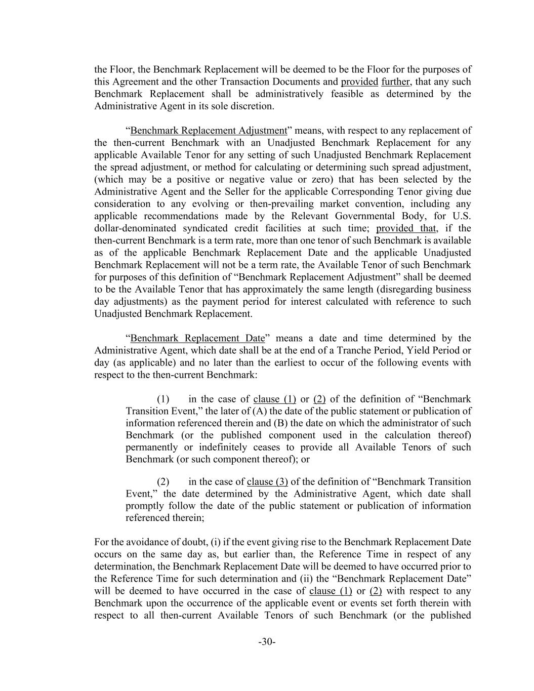 -30- the Floor, the Benchmark Replacement will be deemed to be the Floor for the purposes of this Agreement and the other Transaction Documents and provided further, that any such Benchmark Replacement shall be administratively feasible as determined by the Administrative Agent in its sole discretion. “Benchmark Replacement Adjustment” means, with respect to any replacement of the then-current Benchmark with an Unadjusted Benchmark Replacement for any applicable Available Tenor for any setting of such Unadjusted Benchmark Replacement the spread adjustment, or method for calculating or determining such spread adjustment, (which may be a positive or negative value or zero) that has been selected by the Administrative Agent and the Seller for the applicable Corresponding Tenor giving due consideration to any evolving or then-prevailing market convention, including any applicable recommendations made by the Relevant Governmental Body, for U.S. dollar-denominated syndicated credit facilities at such time; provided that, if the then-current Benchmark is a term rate, more than one tenor of such Benchmark is available as of the applicable Benchmark Replacement Date and the applicable Unadjusted Benchmark Replacement will not be a term rate, the Available Tenor of such Benchmark for purposes of this definition of “Benchmark Replacement Adjustment” shall be deemed to be the Available Tenor that has approximately the same length (disregarding business day adjustments) as the payment period for interest calculated with reference to such Unadjusted Benchmark Replacement. “Benchmark Replacement Date” means a date and time determined by the Administrative Agent, which date shall be at the end of a Tranche Period, Yield Period or day (as applicable) and no later than the earliest to occur of the following events with respect to the then-current Benchmark: (1) in the case of clause (1) or (2) of the definition of “Benchmark Transition Event,” the later of (A) the date of the public statement or publication of information referenced therein and (B) the date on which the administrator of such Benchmark (or the published component used in the calculation thereof) permanently or indefinitely ceases to provide all Available Tenors of such Benchmark (or such component thereof); or (2) in the case of clause (3) of the definition of “Benchmark Transition Event,” the date determined by the Administrative Agent, which date shall promptly follow the date of the public statement or publication of information referenced therein; For the avoidance of doubt, (i) if the event giving rise to the Benchmark Replacement Date occurs on the same day as, but earlier than, the Reference Time in respect of any determination, the Benchmark Replacement Date will be deemed to have occurred prior to the Reference Time for such determination and (ii) the “Benchmark Replacement Date” will be deemed to have occurred in the case of clause (1) or (2) with respect to any Benchmark upon the occurrence of the applicable event or events set forth therein with respect to all then-current Available Tenors of such Benchmark (or the published