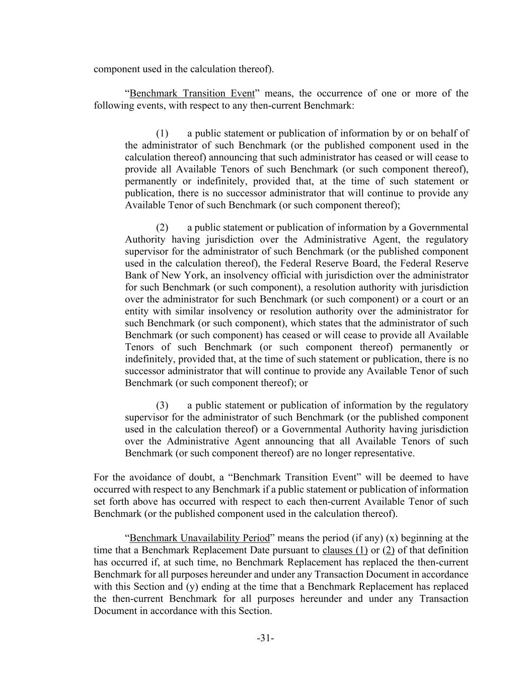 -31- component used in the calculation thereof). “Benchmark Transition Event” means, the occurrence of one or more of the following events, with respect to any then-current Benchmark: (1) a public statement or publication of information by or on behalf of the administrator of such Benchmark (or the published component used in the calculation thereof) announcing that such administrator has ceased or will cease to provide all Available Tenors of such Benchmark (or such component thereof), permanently or indefinitely, provided that, at the time of such statement or publication, there is no successor administrator that will continue to provide any Available Tenor of such Benchmark (or such component thereof); (2) a public statement or publication of information by a Governmental Authority having jurisdiction over the Administrative Agent, the regulatory supervisor for the administrator of such Benchmark (or the published component used in the calculation thereof), the Federal Reserve Board, the Federal Reserve Bank of New York, an insolvency official with jurisdiction over the administrator for such Benchmark (or such component), a resolution authority with jurisdiction over the administrator for such Benchmark (or such component) or a court or an entity with similar insolvency or resolution authority over the administrator for such Benchmark (or such component), which states that the administrator of such Benchmark (or such component) has ceased or will cease to provide all Available Tenors of such Benchmark (or such component thereof) permanently or indefinitely, provided that, at the time of such statement or publication, there is no successor administrator that will continue to provide any Available Tenor of such Benchmark (or such component thereof); or (3) a public statement or publication of information by the regulatory supervisor for the administrator of such Benchmark (or the published component used in the calculation thereof) or a Governmental Authority having jurisdiction over the Administrative Agent announcing that all Available Tenors of such Benchmark (or such component thereof) are no longer representative. For the avoidance of doubt, a “Benchmark Transition Event” will be deemed to have occurred with respect to any Benchmark if a public statement or publication of information set forth above has occurred with respect to each then-current Available Tenor of such Benchmark (or the published component used in the calculation thereof). “Benchmark Unavailability Period” means the period (if any) (x) beginning at the time that a Benchmark Replacement Date pursuant to clauses (1) or (2) of that definition has occurred if, at such time, no Benchmark Replacement has replaced the then-current Benchmark for all purposes hereunder and under any Transaction Document in accordance with this Section and (y) ending at the time that a Benchmark Replacement has replaced the then-current Benchmark for all purposes hereunder and under any Transaction Document in accordance with this Section.
