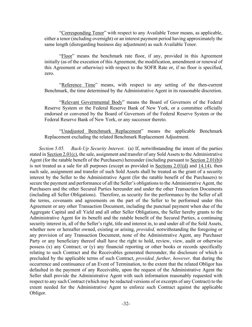 -32- “Corresponding Tenor” with respect to any Available Tenor means, as applicable, either a tenor (including overnight) or an interest payment period having approximately the same length (disregarding business day adjustment) as such Available Tenor. “Floor” means the benchmark rate floor, if any, provided in this Agreement initially (as of the execution of this Agreement, the modification, amendment or renewal of this Agreement or otherwise) with respect to the SOFR Rate or, if no floor is specified, zero. “Reference Time” means, with respect to any setting of the then-current Benchmark, the time determined by the Administrative Agent in its reasonable discretion. “Relevant Governmental Body” means the Board of Governors of the Federal Reserve System or the Federal Reserve Bank of New York, or a committee officially endorsed or convened by the Board of Governors of the Federal Reserve System or the Federal Reserve Bank of New York, or any successor thereto. “Unadjusted Benchmark Replacement” means the applicable Benchmark Replacement excluding the related Benchmark Replacement Adjustment. Section 5.05. Back-Up Security Interest. (a) If, notwithstanding the intent of the parties stated in Section 2.01(c), the sale, assignment and transfer of any Sold Assets to the Administrative Agent (for the ratable benefit of the Purchasers) hereunder (including pursuant to Section 2.01(b)) is not treated as a sale for all purposes (except as provided in Sections 2.01(d) and 14.14), then such sale, assignment and transfer of such Sold Assets shall be treated as the grant of a security interest by the Seller to the Administrative Agent (for the ratable benefit of the Purchasers) to secure the payment and performance of all the Seller’s obligations to the Administrative Agent, the Purchasers and the other Secured Parties hereunder and under the other Transaction Documents (including all Seller Obligations). Therefore, as security for the performance by the Seller of all the terms, covenants and agreements on the part of the Seller to be performed under this Agreement or any other Transaction Document, including the punctual payment when due of the Aggregate Capital and all Yield and all other Seller Obligations, the Seller hereby grants to the Administrative Agent for its benefit and the ratable benefit of the Secured Parties, a continuing security interest in, all of the Seller’s right, title and interest in, to and under all of the Sold Assets, whether now or hereafter owned, existing or arising, provided, notwithstanding the foregoing or any provision of any Transaction Document, none of the Administrative Agent, any Purchaser Party or any beneficiary thereof shall have the right to hold, review, view, audit or otherwise possess (x) any Contract; or (y) any financial reporting or other books or records specifically relating to such Contract and the Receivables generated thereunder, the disclosure of which is precluded by the applicable terms of such Contract, provided, further, however, that during the occurrence and continuance of an Event of Termination, to the extent that the related Obligor has defaulted in the payment of any Receivable, upon the request of the Administrative Agent the Seller shall provide the Administrative Agent with such information reasonably requested with respect to any such Contract (which may be redacted versions of or excerpts of any Contract) to the extent needed for the Administrative Agent to enforce such Contract against the applicable Obligor.