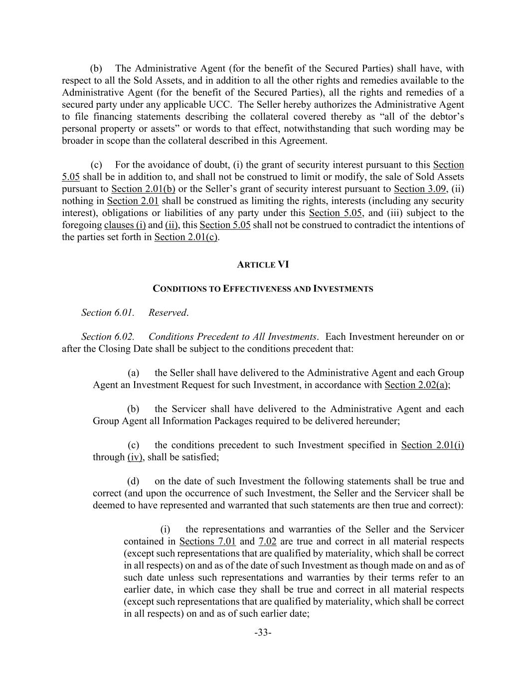 -33- (b) The Administrative Agent (for the benefit of the Secured Parties) shall have, with respect to all the Sold Assets, and in addition to all the other rights and remedies available to the Administrative Agent (for the benefit of the Secured Parties), all the rights and remedies of a secured party under any applicable UCC. The Seller hereby authorizes the Administrative Agent to file financing statements describing the collateral covered thereby as “all of the debtor’s personal property or assets” or words to that effect, notwithstanding that such wording may be broader in scope than the collateral described in this Agreement. (c) For the avoidance of doubt, (i) the grant of security interest pursuant to this Section 5.05 shall be in addition to, and shall not be construed to limit or modify, the sale of Sold Assets pursuant to Section 2.01(b) or the Seller’s grant of security interest pursuant to Section 3.09, (ii) nothing in Section 2.01 shall be construed as limiting the rights, interests (including any security interest), obligations or liabilities of any party under this Section 5.05, and (iii) subject to the foregoing clauses (i) and (ii), this Section 5.05 shall not be construed to contradict the intentions of the parties set forth in Section 2.01(c). ARTICLE VI CONDITIONS TO EFFECTIVENESS AND INVESTMENTS Section 6.01. Reserved. Section 6.02. Conditions Precedent to All Investments. Each Investment hereunder on or after the Closing Date shall be subject to the conditions precedent that: (a) the Seller shall have delivered to the Administrative Agent and each Group Agent an Investment Request for such Investment, in accordance with Section 2.02(a); (b) the Servicer shall have delivered to the Administrative Agent and each Group Agent all Information Packages required to be delivered hereunder; (c) the conditions precedent to such Investment specified in Section 2.01(i) through (iv), shall be satisfied; (d) on the date of such Investment the following statements shall be true and correct (and upon the occurrence of such Investment, the Seller and the Servicer shall be deemed to have represented and warranted that such statements are then true and correct): (i) the representations and warranties of the Seller and the Servicer contained in Sections 7.01 and 7.02 are true and correct in all material respects (except such representations that are qualified by materiality, which shall be correct in all respects) on and as of the date of such Investment as though made on and as of such date unless such representations and warranties by their terms refer to an earlier date, in which case they shall be true and correct in all material respects (except such representations that are qualified by materiality, which shall be correct in all respects) on and as of such earlier date;