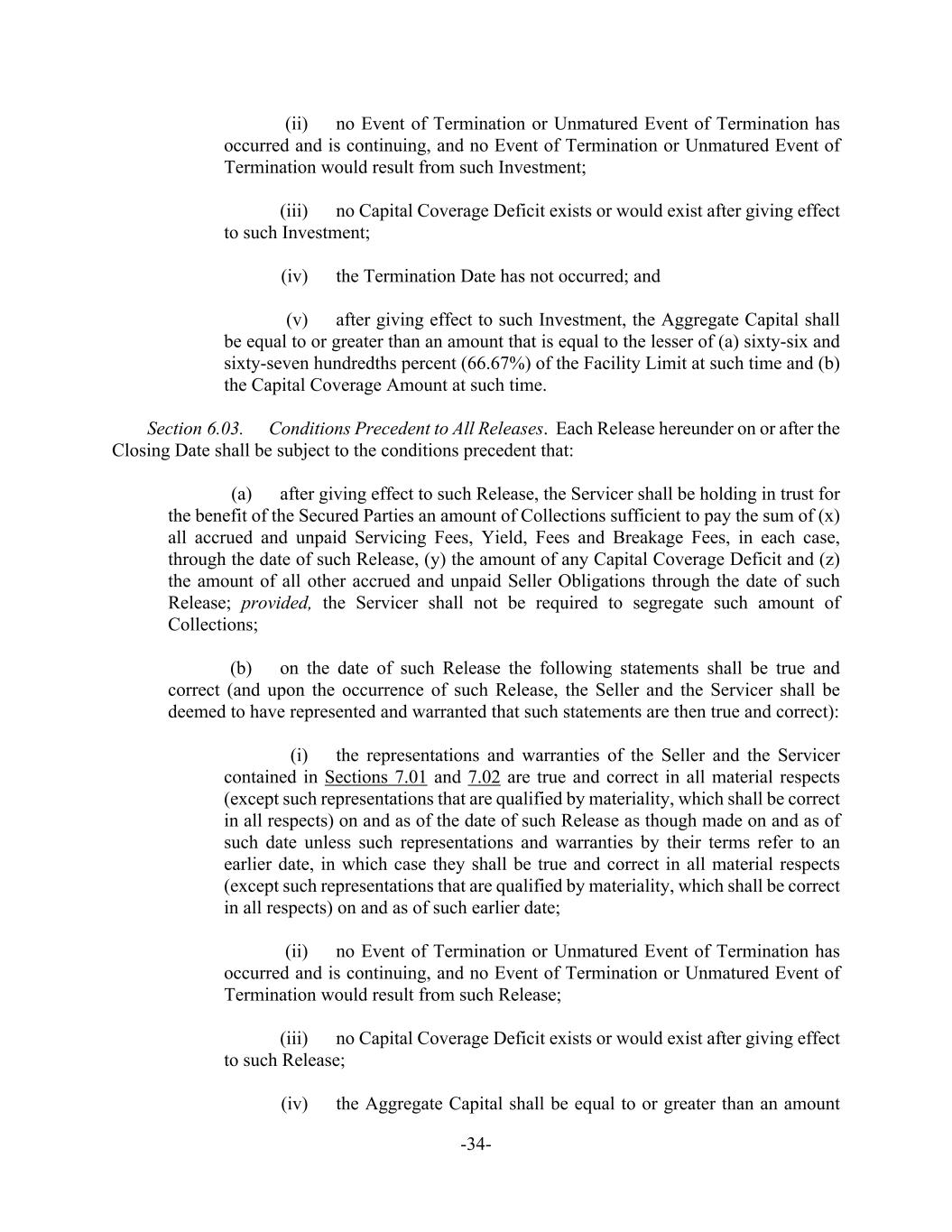 -34- (ii) no Event of Termination or Unmatured Event of Termination has occurred and is continuing, and no Event of Termination or Unmatured Event of Termination would result from such Investment; (iii) no Capital Coverage Deficit exists or would exist after giving effect to such Investment; (iv) the Termination Date has not occurred; and (v) after giving effect to such Investment, the Aggregate Capital shall be equal to or greater than an amount that is equal to the lesser of (a) sixty-six and sixty-seven hundredths percent (66.67%) of the Facility Limit at such time and (b) the Capital Coverage Amount at such time. Section 6.03. Conditions Precedent to All Releases. Each Release hereunder on or after the Closing Date shall be subject to the conditions precedent that: (a) after giving effect to such Release, the Servicer shall be holding in trust for the benefit of the Secured Parties an amount of Collections sufficient to pay the sum of (x) all accrued and unpaid Servicing Fees, Yield, Fees and Breakage Fees, in each case, through the date of such Release, (y) the amount of any Capital Coverage Deficit and (z) the amount of all other accrued and unpaid Seller Obligations through the date of such Release; provided, the Servicer shall not be required to segregate such amount of Collections; (b) on the date of such Release the following statements shall be true and correct (and upon the occurrence of such Release, the Seller and the Servicer shall be deemed to have represented and warranted that such statements are then true and correct): (i) the representations and warranties of the Seller and the Servicer contained in Sections 7.01 and 7.02 are true and correct in all material respects (except such representations that are qualified by materiality, which shall be correct in all respects) on and as of the date of such Release as though made on and as of such date unless such representations and warranties by their terms refer to an earlier date, in which case they shall be true and correct in all material respects (except such representations that are qualified by materiality, which shall be correct in all respects) on and as of such earlier date; (ii) no Event of Termination or Unmatured Event of Termination has occurred and is continuing, and no Event of Termination or Unmatured Event of Termination would result from such Release; (iii) no Capital Coverage Deficit exists or would exist after giving effect to such Release; (iv) the Aggregate Capital shall be equal to or greater than an amount