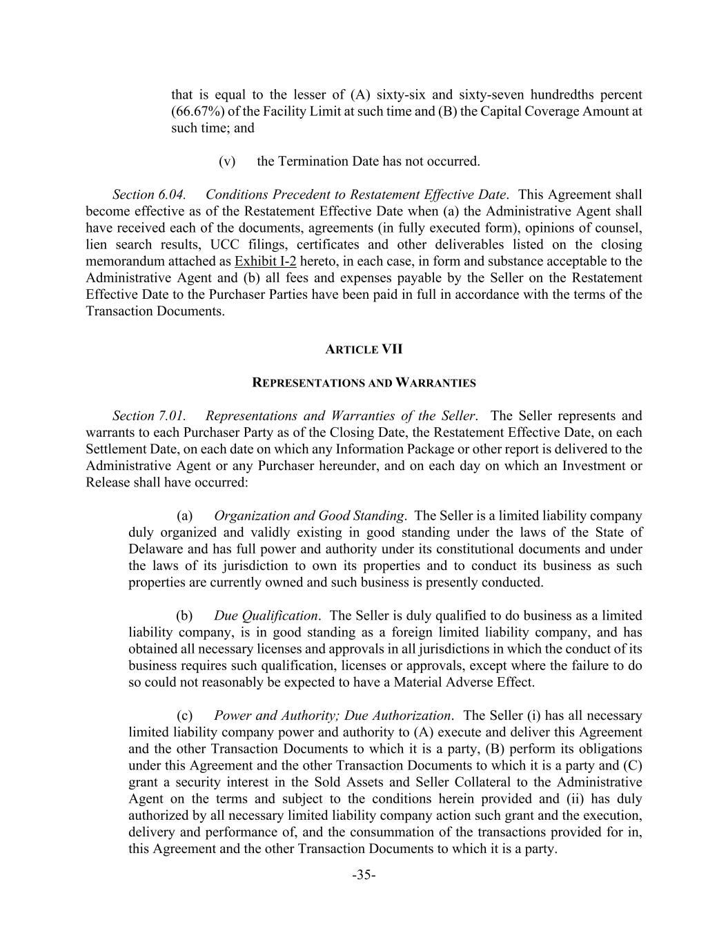 -35- that is equal to the lesser of (A) sixty-six and sixty-seven hundredths percent (66.67%) of the Facility Limit at such time and (B) the Capital Coverage Amount at such time; and (v) the Termination Date has not occurred. Section 6.04. Conditions Precedent to Restatement Effective Date. This Agreement shall become effective as of the Restatement Effective Date when (a) the Administrative Agent shall have received each of the documents, agreements (in fully executed form), opinions of counsel, lien search results, UCC filings, certificates and other deliverables listed on the closing memorandum attached as Exhibit I-2 hereto, in each case, in form and substance acceptable to the Administrative Agent and (b) all fees and expenses payable by the Seller on the Restatement Effective Date to the Purchaser Parties have been paid in full in accordance with the terms of the Transaction Documents. ARTICLE VII REPRESENTATIONS AND WARRANTIES Section 7.01. Representations and Warranties of the Seller. The Seller represents and warrants to each Purchaser Party as of the Closing Date, the Restatement Effective Date, on each Settlement Date, on each date on which any Information Package or other report is delivered to the Administrative Agent or any Purchaser hereunder, and on each day on which an Investment or Release shall have occurred: (a) Organization and Good Standing. The Seller is a limited liability company duly organized and validly existing in good standing under the laws of the State of Delaware and has full power and authority under its constitutional documents and under the laws of its jurisdiction to own its properties and to conduct its business as such properties are currently owned and such business is presently conducted. (b) Due Qualification. The Seller is duly qualified to do business as a limited liability company, is in good standing as a foreign limited liability company, and has obtained all necessary licenses and approvals in all jurisdictions in which the conduct of its business requires such qualification, licenses or approvals, except where the failure to do so could not reasonably be expected to have a Material Adverse Effect. (c) Power and Authority; Due Authorization. The Seller (i) has all necessary limited liability company power and authority to (A) execute and deliver this Agreement and the other Transaction Documents to which it is a party, (B) perform its obligations under this Agreement and the other Transaction Documents to which it is a party and (C) grant a security interest in the Sold Assets and Seller Collateral to the Administrative Agent on the terms and subject to the conditions herein provided and (ii) has duly authorized by all necessary limited liability company action such grant and the execution, delivery and performance of, and the consummation of the transactions provided for in, this Agreement and the other Transaction Documents to which it is a party.