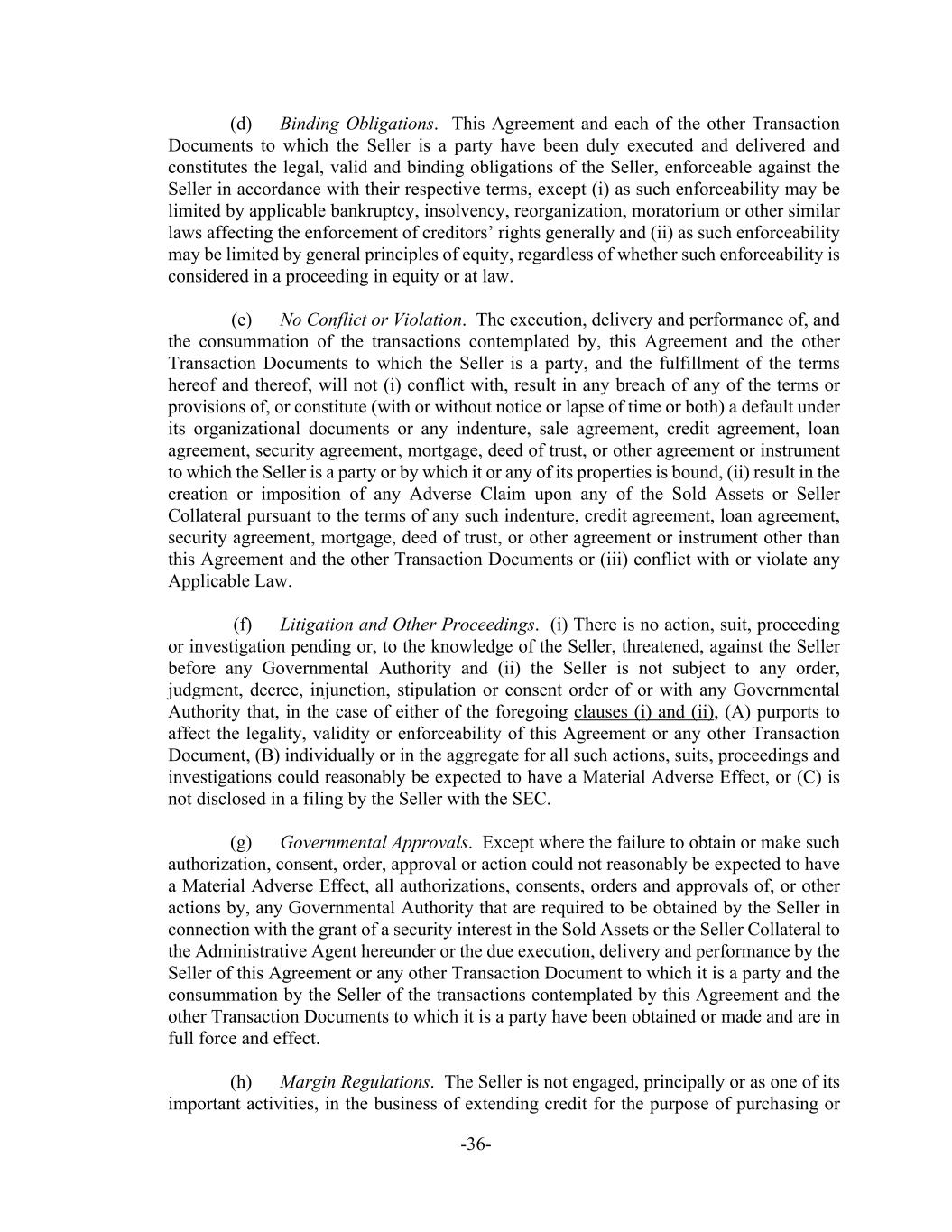 -36- (d) Binding Obligations. This Agreement and each of the other Transaction Documents to which the Seller is a party have been duly executed and delivered and constitutes the legal, valid and binding obligations of the Seller, enforceable against the Seller in accordance with their respective terms, except (i) as such enforceability may be limited by applicable bankruptcy, insolvency, reorganization, moratorium or other similar laws affecting the enforcement of creditors’ rights generally and (ii) as such enforceability may be limited by general principles of equity, regardless of whether such enforceability is considered in a proceeding in equity or at law. (e) No Conflict or Violation. The execution, delivery and performance of, and the consummation of the transactions contemplated by, this Agreement and the other Transaction Documents to which the Seller is a party, and the fulfillment of the terms hereof and thereof, will not (i) conflict with, result in any breach of any of the terms or provisions of, or constitute (with or without notice or lapse of time or both) a default under its organizational documents or any indenture, sale agreement, credit agreement, loan agreement, security agreement, mortgage, deed of trust, or other agreement or instrument to which the Seller is a party or by which it or any of its properties is bound, (ii) result in the creation or imposition of any Adverse Claim upon any of the Sold Assets or Seller Collateral pursuant to the terms of any such indenture, credit agreement, loan agreement, security agreement, mortgage, deed of trust, or other agreement or instrument other than this Agreement and the other Transaction Documents or (iii) conflict with or violate any Applicable Law. (f) Litigation and Other Proceedings. (i) There is no action, suit, proceeding or investigation pending or, to the knowledge of the Seller, threatened, against the Seller before any Governmental Authority and (ii) the Seller is not subject to any order, judgment, decree, injunction, stipulation or consent order of or with any Governmental Authority that, in the case of either of the foregoing clauses (i) and (ii), (A) purports to affect the legality, validity or enforceability of this Agreement or any other Transaction Document, (B) individually or in the aggregate for all such actions, suits, proceedings and investigations could reasonably be expected to have a Material Adverse Effect, or (C) is not disclosed in a filing by the Seller with the SEC. (g) Governmental Approvals. Except where the failure to obtain or make such authorization, consent, order, approval or action could not reasonably be expected to have a Material Adverse Effect, all authorizations, consents, orders and approvals of, or other actions by, any Governmental Authority that are required to be obtained by the Seller in connection with the grant of a security interest in the Sold Assets or the Seller Collateral to the Administrative Agent hereunder or the due execution, delivery and performance by the Seller of this Agreement or any other Transaction Document to which it is a party and the consummation by the Seller of the transactions contemplated by this Agreement and the other Transaction Documents to which it is a party have been obtained or made and are in full force and effect. (h) Margin Regulations. The Seller is not engaged, principally or as one of its important activities, in the business of extending credit for the purpose of purchasing or