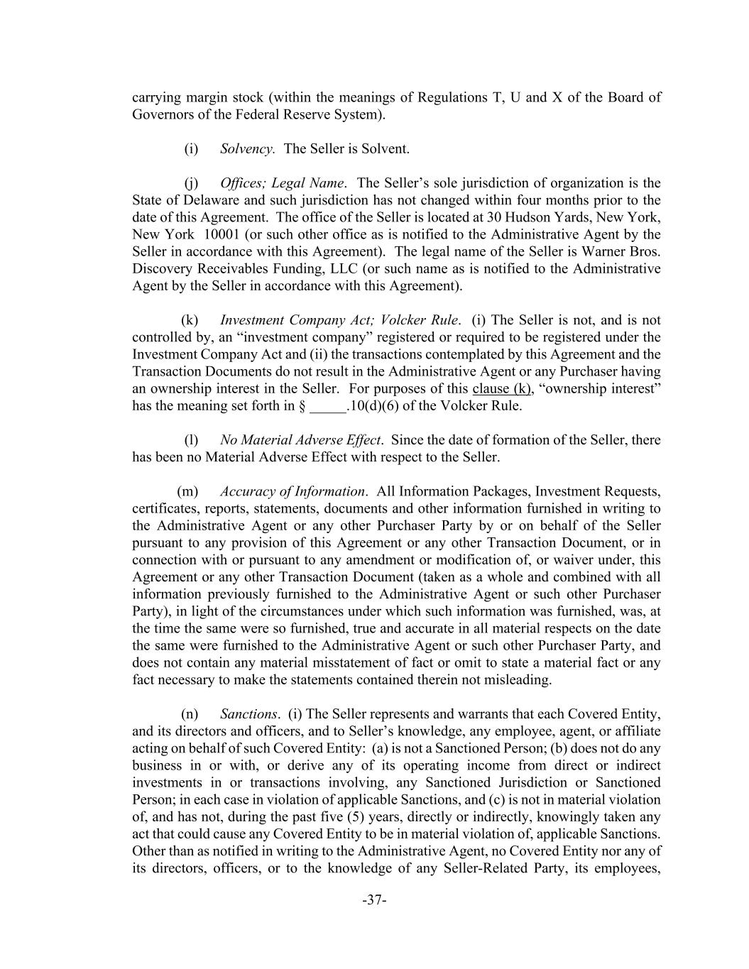 -37- carrying margin stock (within the meanings of Regulations T, U and X of the Board of Governors of the Federal Reserve System). (i) Solvency. The Seller is Solvent. (j) Offices; Legal Name. The Seller’s sole jurisdiction of organization is the State of Delaware and such jurisdiction has not changed within four months prior to the date of this Agreement. The office of the Seller is located at 30 Hudson Yards, New York, New York 10001 (or such other office as is notified to the Administrative Agent by the Seller in accordance with this Agreement). The legal name of the Seller is Warner Bros. Discovery Receivables Funding, LLC (or such name as is notified to the Administrative Agent by the Seller in accordance with this Agreement). (k) Investment Company Act; Volcker Rule. (i) The Seller is not, and is not controlled by, an “investment company” registered or required to be registered under the Investment Company Act and (ii) the transactions contemplated by this Agreement and the Transaction Documents do not result in the Administrative Agent or any Purchaser having an ownership interest in the Seller. For purposes of this clause (k), “ownership interest” has the meaning set forth in § _____.10(d)(6) of the Volcker Rule. (l) No Material Adverse Effect. Since the date of formation of the Seller, there has been no Material Adverse Effect with respect to the Seller. (m) Accuracy of Information. All Information Packages, Investment Requests, certificates, reports, statements, documents and other information furnished in writing to the Administrative Agent or any other Purchaser Party by or on behalf of the Seller pursuant to any provision of this Agreement or any other Transaction Document, or in connection with or pursuant to any amendment or modification of, or waiver under, this Agreement or any other Transaction Document (taken as a whole and combined with all information previously furnished to the Administrative Agent or such other Purchaser Party), in light of the circumstances under which such information was furnished, was, at the time the same were so furnished, true and accurate in all material respects on the date the same were furnished to the Administrative Agent or such other Purchaser Party, and does not contain any material misstatement of fact or omit to state a material fact or any fact necessary to make the statements contained therein not misleading. (n) Sanctions. (i) The Seller represents and warrants that each Covered Entity, and its directors and officers, and to Seller’s knowledge, any employee, agent, or affiliate acting on behalf of such Covered Entity: (a) is not a Sanctioned Person; (b) does not do any business in or with, or derive any of its operating income from direct or indirect investments in or transactions involving, any Sanctioned Jurisdiction or Sanctioned Person; in each case in violation of applicable Sanctions, and (c) is not in material violation of, and has not, during the past five (5) years, directly or indirectly, knowingly taken any act that could cause any Covered Entity to be in material violation of, applicable Sanctions. Other than as notified in writing to the Administrative Agent, no Covered Entity nor any of its directors, officers, or to the knowledge of any Seller-Related Party, its employees,