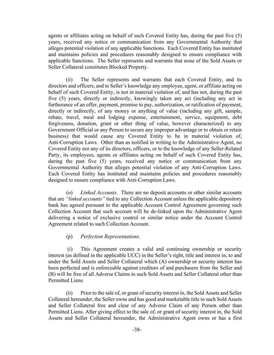 -38- agents or affiliates acting on behalf of such Covered Entity has, during the past five (5) years, received any notice or communication from any Governmental Authority that alleges potential violation of any applicable Sanctions. Each Covered Entity has instituted and maintains policies and procedures reasonably designed to ensure compliance with applicable Sanctions. The Seller represents and warrants that none of the Sold Assets or Seller Collateral constitutes Blocked Property. (ii) The Seller represents and warrants that each Covered Entity, and its directors and officers, and to Seller’s knowledge any employee, agent, or affiliate acting on behalf of such Covered Entity, is not in material violation of, and has not, during the past five (5) years, directly or indirectly, knowingly taken any act (including any act in furtherance of an offer, payment, promise to pay, authorization, or ratification of payment, directly or indirectly, of any money or anything of value (including any gift, sample, rebate, travel, meal and lodging expense, entertainment, service, equipment, debt forgiveness, donation, grant or other thing of value, however characterized) to any Government Official or any Person to secure any improper advantage or to obtain or retain business) that would cause any Covered Entity to be in material violation of, Anti-Corruption Laws. Other than as notified in writing to the Administrative Agent, no Covered Entity nor any of its directors, officers, or to the knowledge of any Seller-Related Party, its employees, agents or affiliates acting on behalf of such Covered Entity has, during the past five (5) years, received any notice or communication from any Governmental Authority that alleges potential violation of any Anti-Corruption Laws. Each Covered Entity has instituted and maintains policies and procedures reasonably designed to ensure compliance with Anti-Corruption Laws. (o) Linked Accounts. There are no deposit accounts or other similar accounts that are “linked accounts” tied to any Collection Account unless the applicable depository bank has agreed pursuant to the applicable Account Control Agreement governing such Collection Account that such account will be de-linked upon the Administrative Agent delivering a notice of exclusive control or similar notice under the Account Control Agreement related to such Collection Account. (p) Perfection Representations. (i) This Agreement creates a valid and continuing ownership or security interest (as defined in the applicable UCC) in the Seller’s right, title and interest in, to and under the Sold Assets and Seller Collateral which (A) ownership or security interest has been perfected and is enforceable against creditors of and purchasers from the Seller and (B) will be free of all Adverse Claims in such Sold Assets and Seller Collateral other than Permitted Liens. (ii) Prior to the sale of, or grant of security interest in, the Sold Assets and Seller Collateral hereunder, the Seller owns and has good and marketable title to such Sold Assets and Seller Collateral free and clear of any Adverse Claim of any Person other than Permitted Liens. After giving effect to the sale of, or grant of security interest in, the Sold Assets and Seller Collateral hereunder, the Administrative Agent owns or has a first