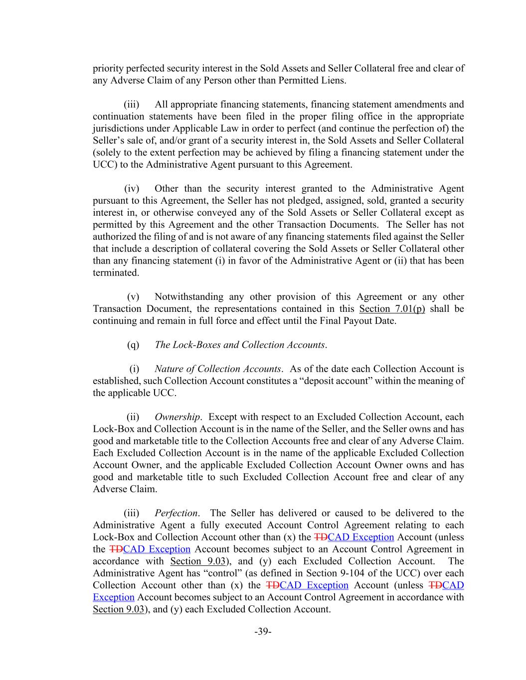 -39- priority perfected security interest in the Sold Assets and Seller Collateral free and clear of any Adverse Claim of any Person other than Permitted Liens. (iii) All appropriate financing statements, financing statement amendments and continuation statements have been filed in the proper filing office in the appropriate jurisdictions under Applicable Law in order to perfect (and continue the perfection of) the Seller’s sale of, and/or grant of a security interest in, the Sold Assets and Seller Collateral (solely to the extent perfection may be achieved by filing a financing statement under the UCC) to the Administrative Agent pursuant to this Agreement. (iv) Other than the security interest granted to the Administrative Agent pursuant to this Agreement, the Seller has not pledged, assigned, sold, granted a security interest in, or otherwise conveyed any of the Sold Assets or Seller Collateral except as permitted by this Agreement and the other Transaction Documents. The Seller has not authorized the filing of and is not aware of any financing statements filed against the Seller that include a description of collateral covering the Sold Assets or Seller Collateral other than any financing statement (i) in favor of the Administrative Agent or (ii) that has been terminated. (v) Notwithstanding any other provision of this Agreement or any other Transaction Document, the representations contained in this Section 7.01(p) shall be continuing and remain in full force and effect until the Final Payout Date. (q) The Lock-Boxes and Collection Accounts. (i) Nature of Collection Accounts. As of the date each Collection Account is established, such Collection Account constitutes a “deposit account” within the meaning of the applicable UCC. (ii) Ownership. Except with respect to an Excluded Collection Account, each Lock-Box and Collection Account is in the name of the Seller, and the Seller owns and has good and marketable title to the Collection Accounts free and clear of any Adverse Claim. Each Excluded Collection Account is in the name of the applicable Excluded Collection Account Owner, and the applicable Excluded Collection Account Owner owns and has good and marketable title to such Excluded Collection Account free and clear of any Adverse Claim. (iii) Perfection. The Seller has delivered or caused to be delivered to the Administrative Agent a fully executed Account Control Agreement relating to each Lock-Box and Collection Account other than (x) the TDCAD Exception Account (unless the TDCAD Exception Account becomes subject to an Account Control Agreement in accordance with Section 9.03), and (y) each Excluded Collection Account. The Administrative Agent has “control” (as defined in Section 9-104 of the UCC) over each Collection Account other than (x) the TDCAD Exception Account (unless TDCAD Exception Account becomes subject to an Account Control Agreement in accordance with Section 9.03), and (y) each Excluded Collection Account.