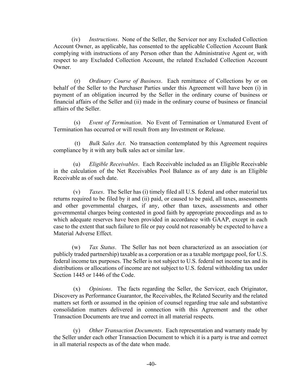 -40- (iv) Instructions. None of the Seller, the Servicer nor any Excluded Collection Account Owner, as applicable, has consented to the applicable Collection Account Bank complying with instructions of any Person other than the Administrative Agent or, with respect to any Excluded Collection Account, the related Excluded Collection Account Owner. (r) Ordinary Course of Business. Each remittance of Collections by or on behalf of the Seller to the Purchaser Parties under this Agreement will have been (i) in payment of an obligation incurred by the Seller in the ordinary course of business or financial affairs of the Seller and (ii) made in the ordinary course of business or financial affairs of the Seller. (s) Event of Termination. No Event of Termination or Unmatured Event of Termination has occurred or will result from any Investment or Release. (t) Bulk Sales Act. No transaction contemplated by this Agreement requires compliance by it with any bulk sales act or similar law. (u) Eligible Receivables. Each Receivable included as an Eligible Receivable in the calculation of the Net Receivables Pool Balance as of any date is an Eligible Receivable as of such date. (v) Taxes. The Seller has (i) timely filed all U.S. federal and other material tax returns required to be filed by it and (ii) paid, or caused to be paid, all taxes, assessments and other governmental charges, if any, other than taxes, assessments and other governmental charges being contested in good faith by appropriate proceedings and as to which adequate reserves have been provided in accordance with GAAP, except in each case to the extent that such failure to file or pay could not reasonably be expected to have a Material Adverse Effect. (w) Tax Status. The Seller has not been characterized as an association (or publicly traded partnership) taxable as a corporation or as a taxable mortgage pool, for U.S. federal income tax purposes. The Seller is not subject to U.S. federal net income tax and its distributions or allocations of income are not subject to U.S. federal withholding tax under Section 1445 or 1446 of the Code. (x) Opinions. The facts regarding the Seller, the Servicer, each Originator, Discovery as Performance Guarantor, the Receivables, the Related Security and the related matters set forth or assumed in the opinion of counsel regarding true sale and substantive consolidation matters delivered in connection with this Agreement and the other Transaction Documents are true and correct in all material respects. (y) Other Transaction Documents. Each representation and warranty made by the Seller under each other Transaction Document to which it is a party is true and correct in all material respects as of the date when made.