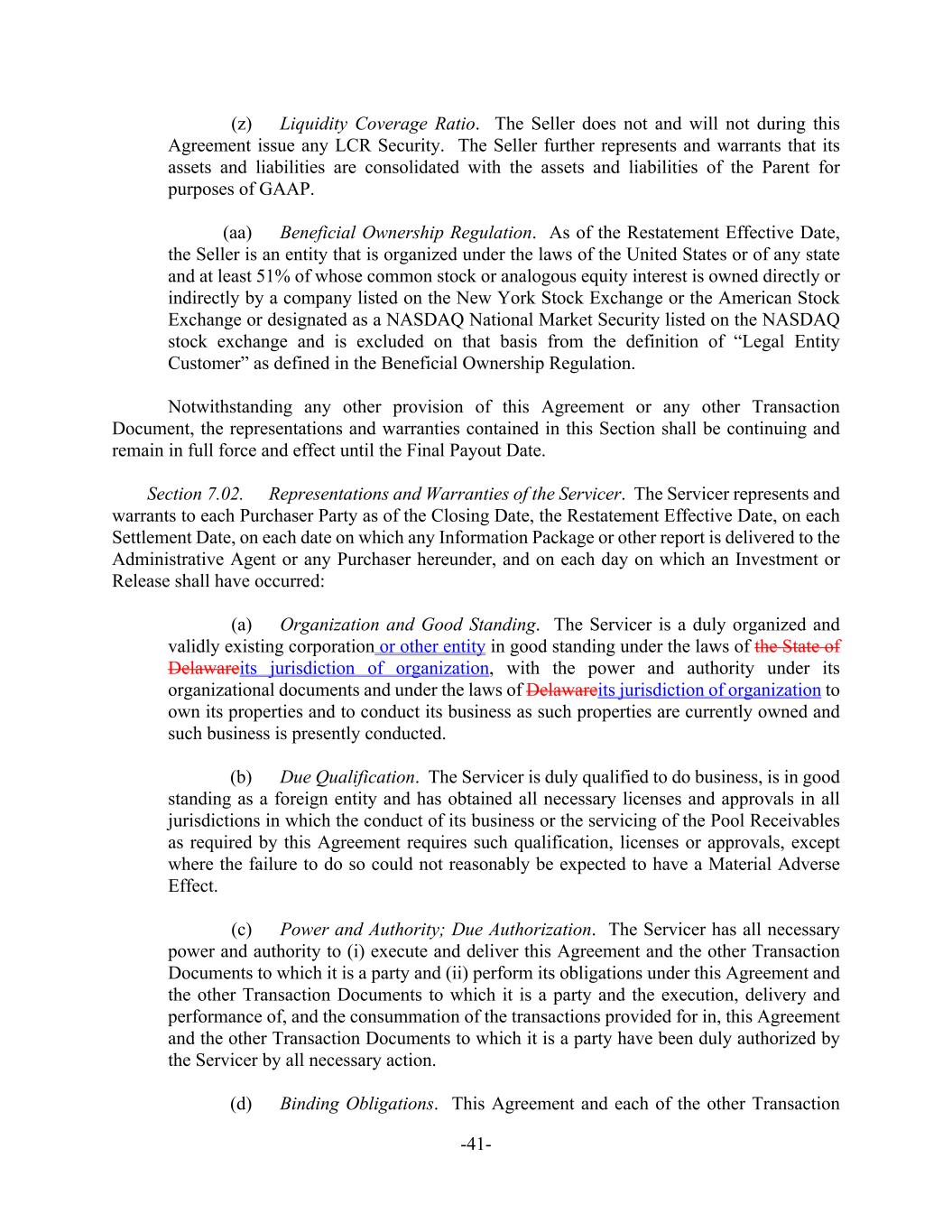 -41- (z) Liquidity Coverage Ratio. The Seller does not and will not during this Agreement issue any LCR Security. The Seller further represents and warrants that its assets and liabilities are consolidated with the assets and liabilities of the Parent for purposes of GAAP. (aa) Beneficial Ownership Regulation. As of the Restatement Effective Date, the Seller is an entity that is organized under the laws of the United States or of any state and at least 51% of whose common stock or analogous equity interest is owned directly or indirectly by a company listed on the New York Stock Exchange or the American Stock Exchange or designated as a NASDAQ National Market Security listed on the NASDAQ stock exchange and is excluded on that basis from the definition of “Legal Entity Customer” as defined in the Beneficial Ownership Regulation. Notwithstanding any other provision of this Agreement or any other Transaction Document, the representations and warranties contained in this Section shall be continuing and remain in full force and effect until the Final Payout Date. Section 7.02. Representations and Warranties of the Servicer. The Servicer represents and warrants to each Purchaser Party as of the Closing Date, the Restatement Effective Date, on each Settlement Date, on each date on which any Information Package or other report is delivered to the Administrative Agent or any Purchaser hereunder, and on each day on which an Investment or Release shall have occurred: (a) Organization and Good Standing. The Servicer is a duly organized and validly existing corporation or other entity in good standing under the laws of the State of Delawareits jurisdiction of organization, with the power and authority under its organizational documents and under the laws of Delawareits jurisdiction of organization to own its properties and to conduct its business as such properties are currently owned and such business is presently conducted. (b) Due Qualification. The Servicer is duly qualified to do business, is in good standing as a foreign entity and has obtained all necessary licenses and approvals in all jurisdictions in which the conduct of its business or the servicing of the Pool Receivables as required by this Agreement requires such qualification, licenses or approvals, except where the failure to do so could not reasonably be expected to have a Material Adverse Effect. (c) Power and Authority; Due Authorization. The Servicer has all necessary power and authority to (i) execute and deliver this Agreement and the other Transaction Documents to which it is a party and (ii) perform its obligations under this Agreement and the other Transaction Documents to which it is a party and the execution, delivery and performance of, and the consummation of the transactions provided for in, this Agreement and the other Transaction Documents to which it is a party have been duly authorized by the Servicer by all necessary action. (d) Binding Obligations. This Agreement and each of the other Transaction