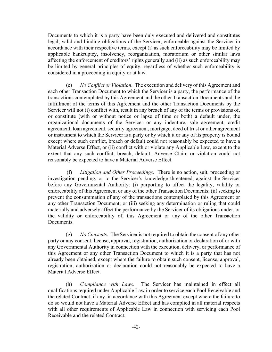-42- Documents to which it is a party have been duly executed and delivered and constitutes legal, valid and binding obligations of the Servicer, enforceable against the Servicer in accordance with their respective terms, except (i) as such enforceability may be limited by applicable bankruptcy, insolvency, reorganization, moratorium or other similar laws affecting the enforcement of creditors’ rights generally and (ii) as such enforceability may be limited by general principles of equity, regardless of whether such enforceability is considered in a proceeding in equity or at law. (e) No Conflict or Violation. The execution and delivery of this Agreement and each other Transaction Document to which the Servicer is a party, the performance of the transactions contemplated by this Agreement and the other Transaction Documents and the fulfillment of the terms of this Agreement and the other Transaction Documents by the Servicer will not (i) conflict with, result in any breach of any of the terms or provisions of, or constitute (with or without notice or lapse of time or both) a default under, the organizational documents of the Servicer or any indenture, sale agreement, credit agreement, loan agreement, security agreement, mortgage, deed of trust or other agreement or instrument to which the Servicer is a party or by which it or any of its property is bound except where such conflict, breach or default could not reasonably be expected to have a Material Adverse Effect, or (ii) conflict with or violate any Applicable Law, except to the extent that any such conflict, breach, default, Adverse Claim or violation could not reasonably be expected to have a Material Adverse Effect. (f) Litigation and Other Proceedings. There is no action, suit, proceeding or investigation pending, or to the Servicer’s knowledge threatened, against the Servicer before any Governmental Authority: (i) purporting to affect the legality, validity or enforceability of this Agreement or any of the other Transaction Documents; (ii) seeking to prevent the consummation of any of the transactions contemplated by this Agreement or any other Transaction Document; or (iii) seeking any determination or ruling that could materially and adversely affect the performance by the Servicer of its obligations under, or the validity or enforceability of, this Agreement or any of the other Transaction Documents. (g) No Consents. The Servicer is not required to obtain the consent of any other party or any consent, license, approval, registration, authorization or declaration of or with any Governmental Authority in connection with the execution, delivery, or performance of this Agreement or any other Transaction Document to which it is a party that has not already been obtained, except where the failure to obtain such consent, license, approval, registration, authorization or declaration could not reasonably be expected to have a Material Adverse Effect. (h) Compliance with Laws. The Servicer has maintained in effect all qualifications required under Applicable Law in order to service each Pool Receivable and the related Contract, if any, in accordance with this Agreement except where the failure to do so would not have a Material Adverse Effect and has complied in all material respects with all other requirements of Applicable Law in connection with servicing each Pool Receivable and the related Contract.