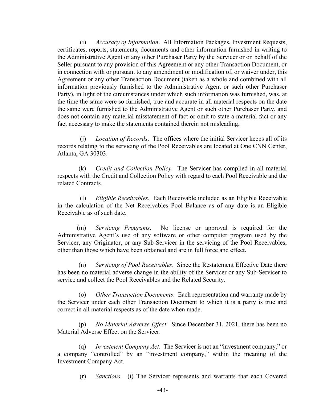 -43- (i) Accuracy of Information. All Information Packages, Investment Requests, certificates, reports, statements, documents and other information furnished in writing to the Administrative Agent or any other Purchaser Party by the Servicer or on behalf of the Seller pursuant to any provision of this Agreement or any other Transaction Document, or in connection with or pursuant to any amendment or modification of, or waiver under, this Agreement or any other Transaction Document (taken as a whole and combined with all information previously furnished to the Administrative Agent or such other Purchaser Party), in light of the circumstances under which such information was furnished, was, at the time the same were so furnished, true and accurate in all material respects on the date the same were furnished to the Administrative Agent or such other Purchaser Party, and does not contain any material misstatement of fact or omit to state a material fact or any fact necessary to make the statements contained therein not misleading. (j) Location of Records. The offices where the initial Servicer keeps all of its records relating to the servicing of the Pool Receivables are located at One CNN Center, Atlanta, GA 30303. (k) Credit and Collection Policy. The Servicer has complied in all material respects with the Credit and Collection Policy with regard to each Pool Receivable and the related Contracts. (l) Eligible Receivables. Each Receivable included as an Eligible Receivable in the calculation of the Net Receivables Pool Balance as of any date is an Eligible Receivable as of such date. (m) Servicing Programs. No license or approval is required for the Administrative Agent’s use of any software or other computer program used by the Servicer, any Originator, or any Sub-Servicer in the servicing of the Pool Receivables, other than those which have been obtained and are in full force and effect. (n) Servicing of Pool Receivables. Since the Restatement Effective Date there has been no material adverse change in the ability of the Servicer or any Sub-Servicer to service and collect the Pool Receivables and the Related Security. (o) Other Transaction Documents. Each representation and warranty made by the Servicer under each other Transaction Document to which it is a party is true and correct in all material respects as of the date when made. (p) No Material Adverse Effect. Since December 31, 2021, there has been no Material Adverse Effect on the Servicer. (q) Investment Company Act. The Servicer is not an “investment company,” or a company “controlled” by an “investment company,” within the meaning of the Investment Company Act. (r) Sanctions. (i) The Servicer represents and warrants that each Covered