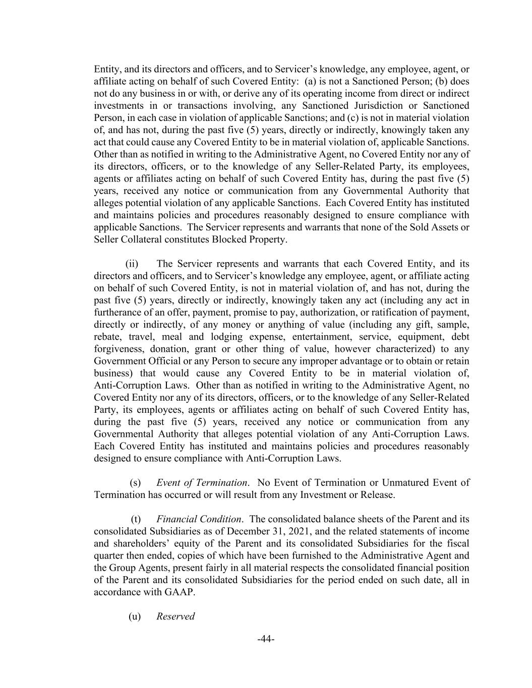 -44- Entity, and its directors and officers, and to Servicer’s knowledge, any employee, agent, or affiliate acting on behalf of such Covered Entity: (a) is not a Sanctioned Person; (b) does not do any business in or with, or derive any of its operating income from direct or indirect investments in or transactions involving, any Sanctioned Jurisdiction or Sanctioned Person, in each case in violation of applicable Sanctions; and (c) is not in material violation of, and has not, during the past five (5) years, directly or indirectly, knowingly taken any act that could cause any Covered Entity to be in material violation of, applicable Sanctions. Other than as notified in writing to the Administrative Agent, no Covered Entity nor any of its directors, officers, or to the knowledge of any Seller-Related Party, its employees, agents or affiliates acting on behalf of such Covered Entity has, during the past five (5) years, received any notice or communication from any Governmental Authority that alleges potential violation of any applicable Sanctions. Each Covered Entity has instituted and maintains policies and procedures reasonably designed to ensure compliance with applicable Sanctions. The Servicer represents and warrants that none of the Sold Assets or Seller Collateral constitutes Blocked Property. (ii) The Servicer represents and warrants that each Covered Entity, and its directors and officers, and to Servicer’s knowledge any employee, agent, or affiliate acting on behalf of such Covered Entity, is not in material violation of, and has not, during the past five (5) years, directly or indirectly, knowingly taken any act (including any act in furtherance of an offer, payment, promise to pay, authorization, or ratification of payment, directly or indirectly, of any money or anything of value (including any gift, sample, rebate, travel, meal and lodging expense, entertainment, service, equipment, debt forgiveness, donation, grant or other thing of value, however characterized) to any Government Official or any Person to secure any improper advantage or to obtain or retain business) that would cause any Covered Entity to be in material violation of, Anti-Corruption Laws. Other than as notified in writing to the Administrative Agent, no Covered Entity nor any of its directors, officers, or to the knowledge of any Seller-Related Party, its employees, agents or affiliates acting on behalf of such Covered Entity has, during the past five (5) years, received any notice or communication from any Governmental Authority that alleges potential violation of any Anti-Corruption Laws. Each Covered Entity has instituted and maintains policies and procedures reasonably designed to ensure compliance with Anti-Corruption Laws. (s) Event of Termination. No Event of Termination or Unmatured Event of Termination has occurred or will result from any Investment or Release. (t) Financial Condition. The consolidated balance sheets of the Parent and its consolidated Subsidiaries as of December 31, 2021, and the related statements of income and shareholders’ equity of the Parent and its consolidated Subsidiaries for the fiscal quarter then ended, copies of which have been furnished to the Administrative Agent and the Group Agents, present fairly in all material respects the consolidated financial position of the Parent and its consolidated Subsidiaries for the period ended on such date, all in accordance with GAAP. (u) Reserved