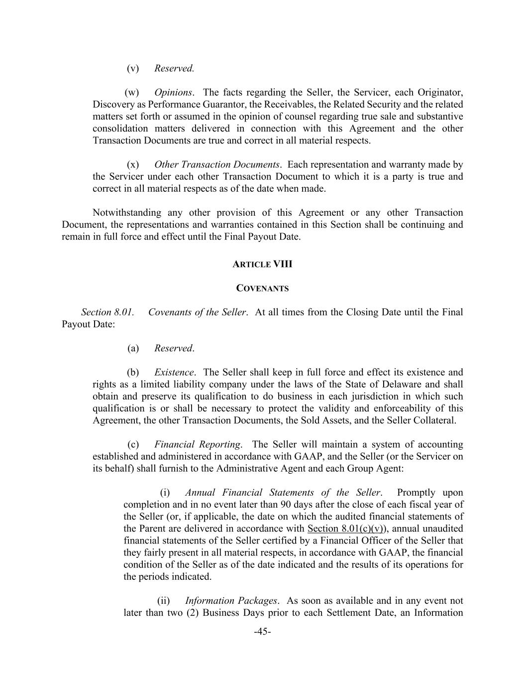 -45- (v) Reserved. (w) Opinions. The facts regarding the Seller, the Servicer, each Originator, Discovery as Performance Guarantor, the Receivables, the Related Security and the related matters set forth or assumed in the opinion of counsel regarding true sale and substantive consolidation matters delivered in connection with this Agreement and the other Transaction Documents are true and correct in all material respects. (x) Other Transaction Documents. Each representation and warranty made by the Servicer under each other Transaction Document to which it is a party is true and correct in all material respects as of the date when made. Notwithstanding any other provision of this Agreement or any other Transaction Document, the representations and warranties contained in this Section shall be continuing and remain in full force and effect until the Final Payout Date. ARTICLE VIII COVENANTS Section 8.01. Covenants of the Seller. At all times from the Closing Date until the Final Payout Date: (a) Reserved. (b) Existence. The Seller shall keep in full force and effect its existence and rights as a limited liability company under the laws of the State of Delaware and shall obtain and preserve its qualification to do business in each jurisdiction in which such qualification is or shall be necessary to protect the validity and enforceability of this Agreement, the other Transaction Documents, the Sold Assets, and the Seller Collateral. (c) Financial Reporting. The Seller will maintain a system of accounting established and administered in accordance with GAAP, and the Seller (or the Servicer on its behalf) shall furnish to the Administrative Agent and each Group Agent: (i) Annual Financial Statements of the Seller. Promptly upon completion and in no event later than 90 days after the close of each fiscal year of the Seller (or, if applicable, the date on which the audited financial statements of the Parent are delivered in accordance with Section 8.01(c)(v)), annual unaudited financial statements of the Seller certified by a Financial Officer of the Seller that they fairly present in all material respects, in accordance with GAAP, the financial condition of the Seller as of the date indicated and the results of its operations for the periods indicated. (ii) Information Packages. As soon as available and in any event not later than two (2) Business Days prior to each Settlement Date, an Information