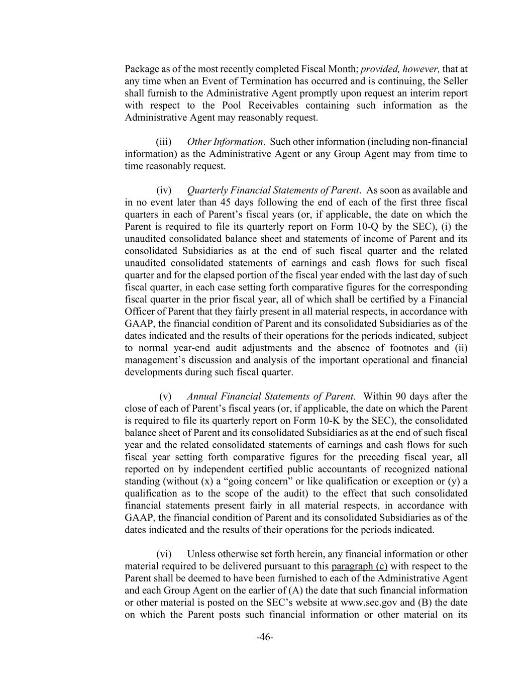 -46- Package as of the most recently completed Fiscal Month; provided, however, that at any time when an Event of Termination has occurred and is continuing, the Seller shall furnish to the Administrative Agent promptly upon request an interim report with respect to the Pool Receivables containing such information as the Administrative Agent may reasonably request. (iii) Other Information. Such other information (including non-financial information) as the Administrative Agent or any Group Agent may from time to time reasonably request. (iv) Quarterly Financial Statements of Parent. As soon as available and in no event later than 45 days following the end of each of the first three fiscal quarters in each of Parent’s fiscal years (or, if applicable, the date on which the Parent is required to file its quarterly report on Form 10-Q by the SEC), (i) the unaudited consolidated balance sheet and statements of income of Parent and its consolidated Subsidiaries as at the end of such fiscal quarter and the related unaudited consolidated statements of earnings and cash flows for such fiscal quarter and for the elapsed portion of the fiscal year ended with the last day of such fiscal quarter, in each case setting forth comparative figures for the corresponding fiscal quarter in the prior fiscal year, all of which shall be certified by a Financial Officer of Parent that they fairly present in all material respects, in accordance with GAAP, the financial condition of Parent and its consolidated Subsidiaries as of the dates indicated and the results of their operations for the periods indicated, subject to normal year-end audit adjustments and the absence of footnotes and (ii) management’s discussion and analysis of the important operational and financial developments during such fiscal quarter. (v) Annual Financial Statements of Parent. Within 90 days after the close of each of Parent’s fiscal years (or, if applicable, the date on which the Parent is required to file its quarterly report on Form 10-K by the SEC), the consolidated balance sheet of Parent and its consolidated Subsidiaries as at the end of such fiscal year and the related consolidated statements of earnings and cash flows for such fiscal year setting forth comparative figures for the preceding fiscal year, all reported on by independent certified public accountants of recognized national standing (without (x) a “going concern” or like qualification or exception or (y) a qualification as to the scope of the audit) to the effect that such consolidated financial statements present fairly in all material respects, in accordance with GAAP, the financial condition of Parent and its consolidated Subsidiaries as of the dates indicated and the results of their operations for the periods indicated. (vi) Unless otherwise set forth herein, any financial information or other material required to be delivered pursuant to this paragraph (c) with respect to the Parent shall be deemed to have been furnished to each of the Administrative Agent and each Group Agent on the earlier of (A) the date that such financial information or other material is posted on the SEC’s website at www.sec.gov and (B) the date on which the Parent posts such financial information or other material on its